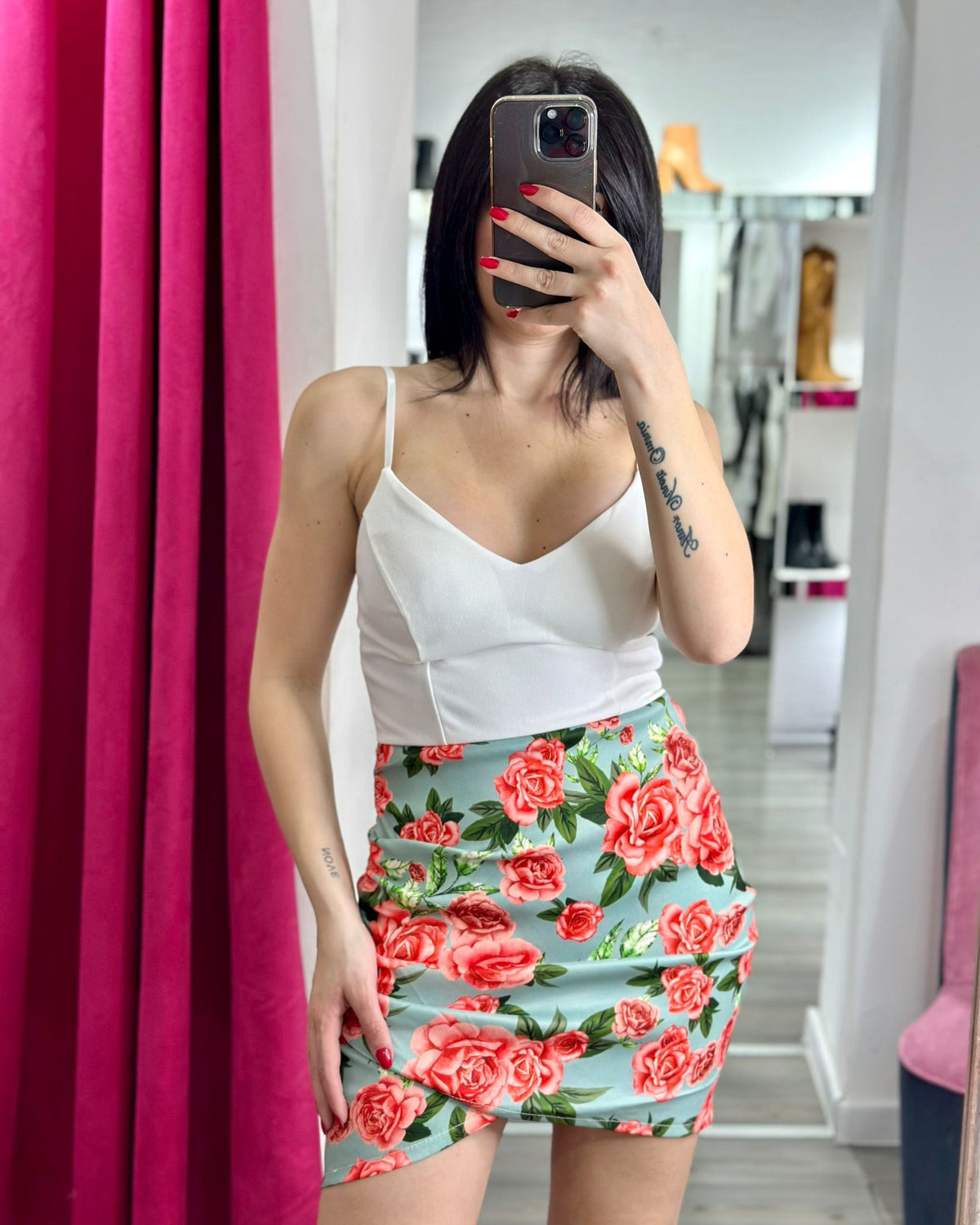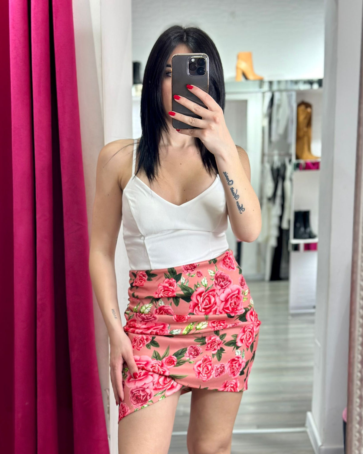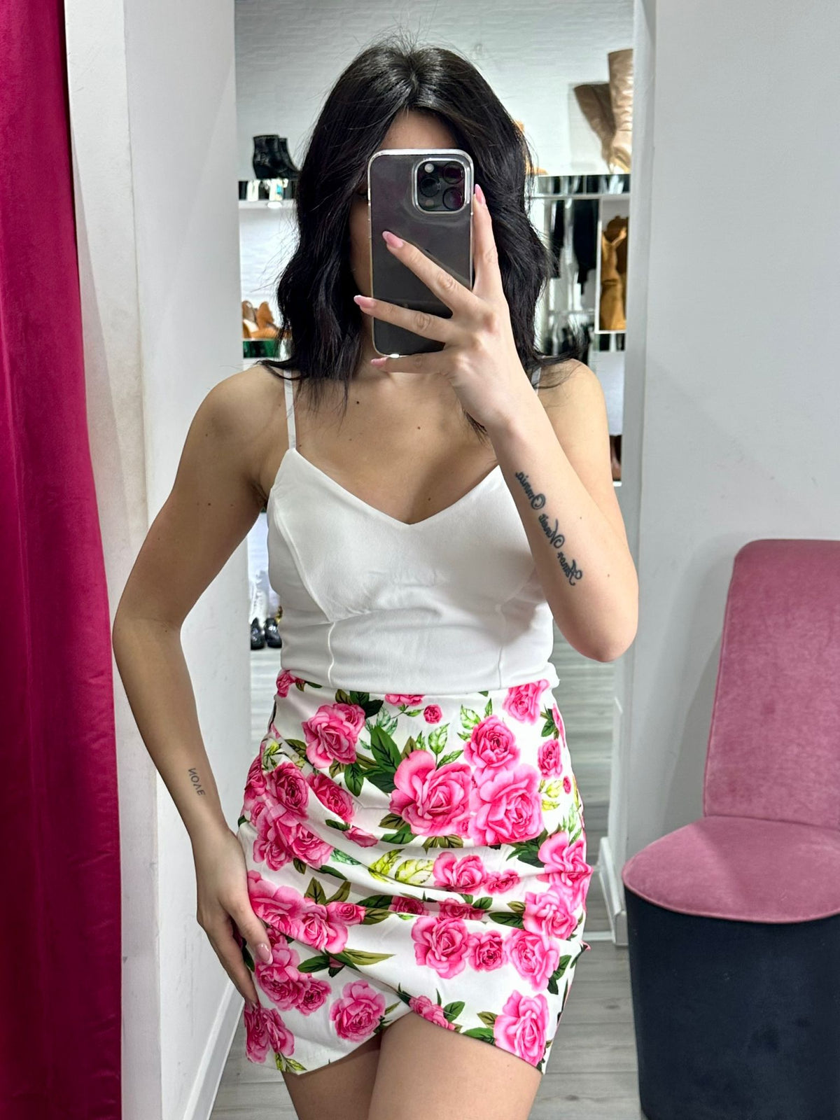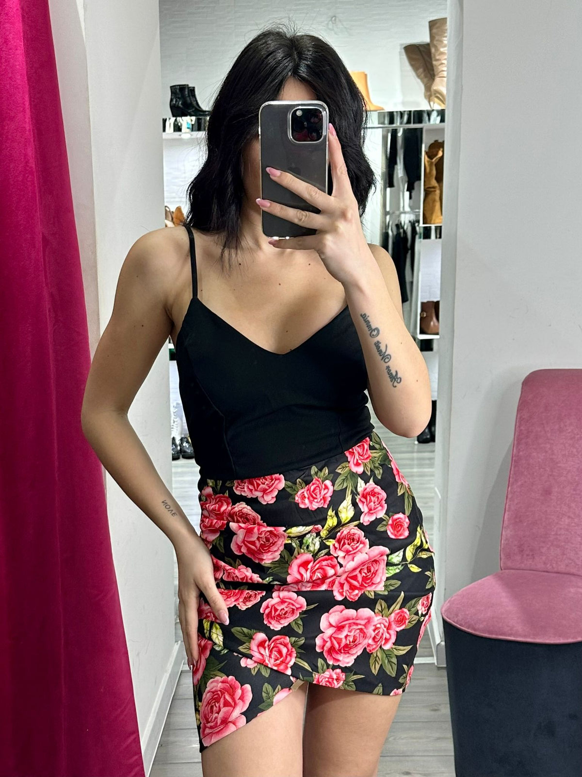 Abito in tessuto scuba crepe con fantasia floreale, coppe preformate, spalline regolabili e gonna a portafoglio con drappeggio. Fabbricato in Italia.