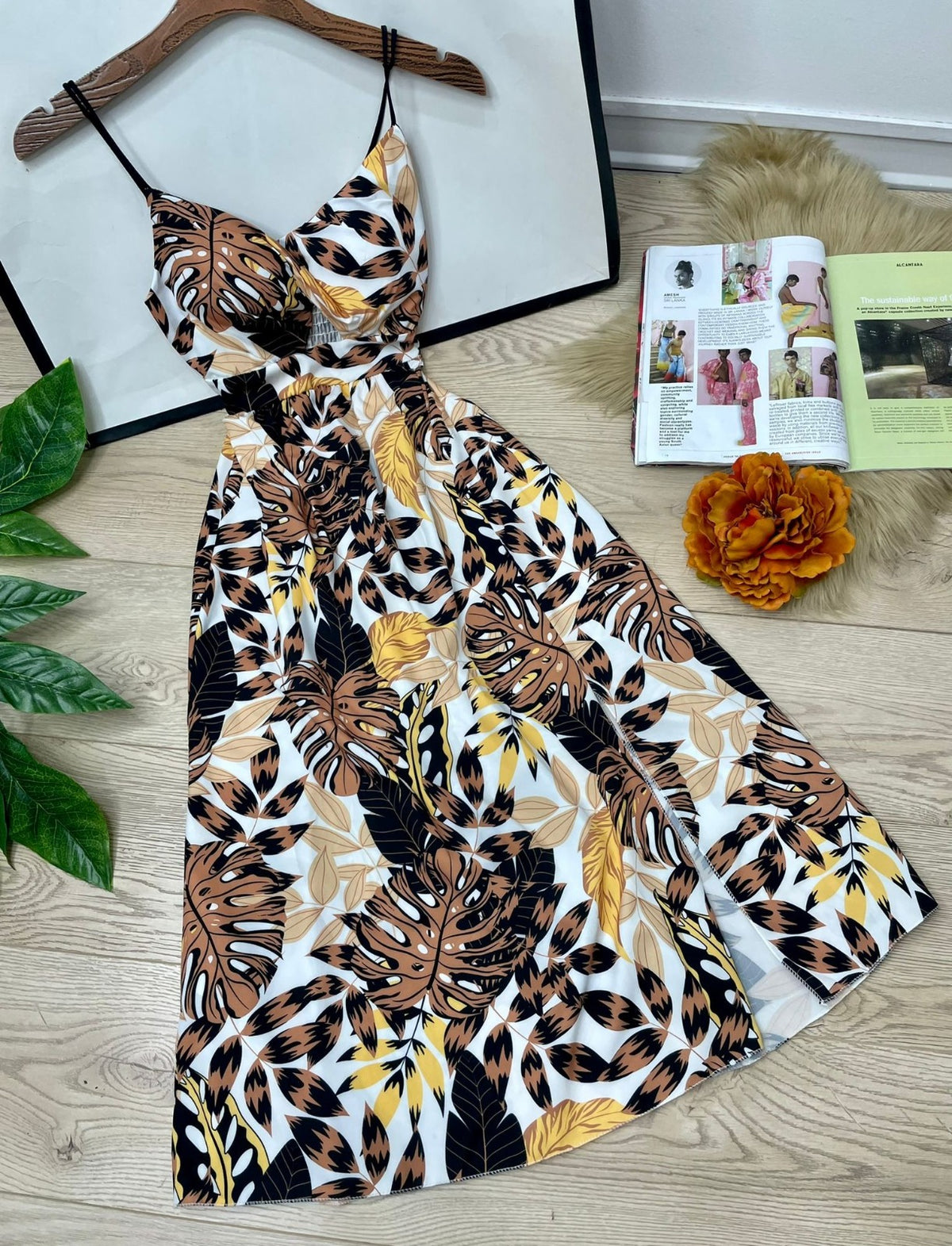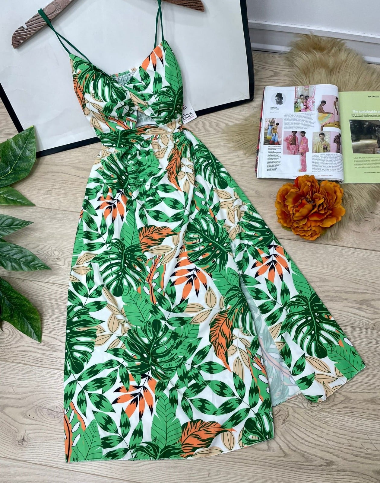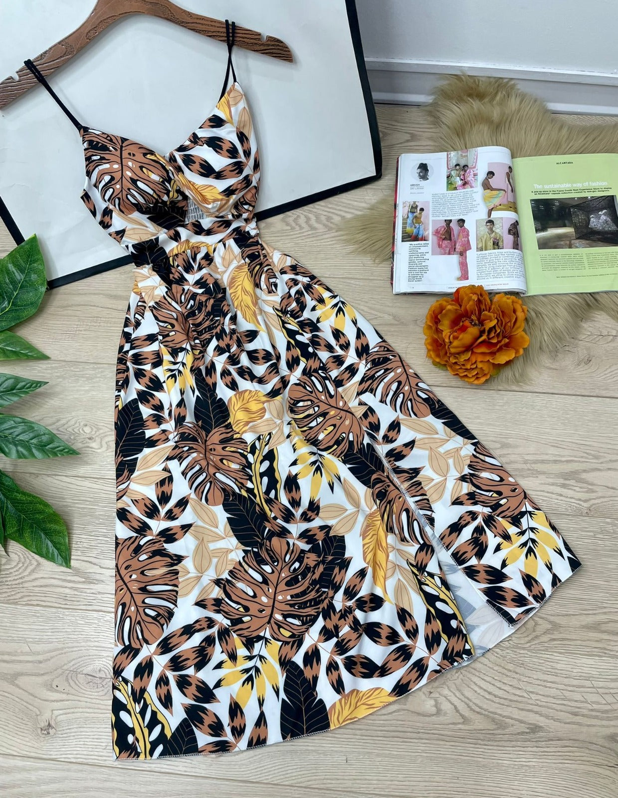 Abito in leggero tessuto strutturato con fantasia foglie, coppe preformate apertura centrale, Fascia elastica sul retro e spacco laterale. Fabbricato in Italia.