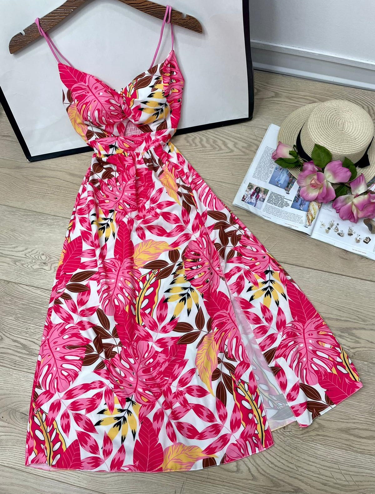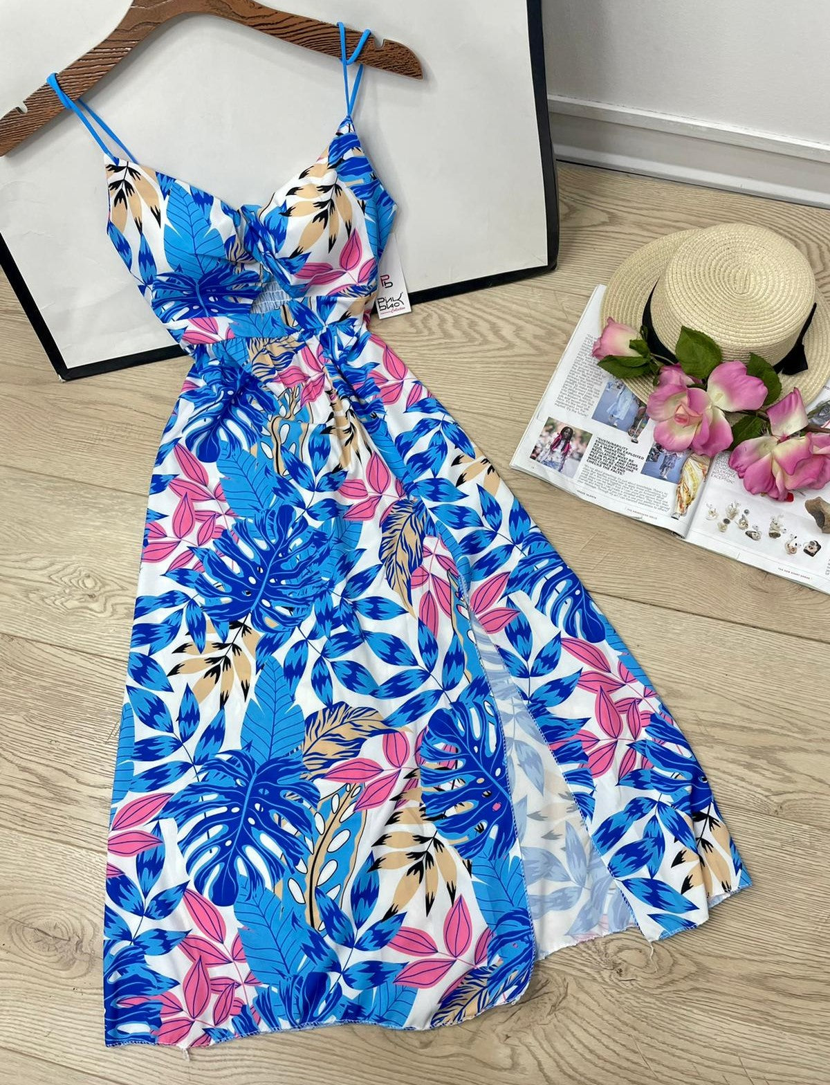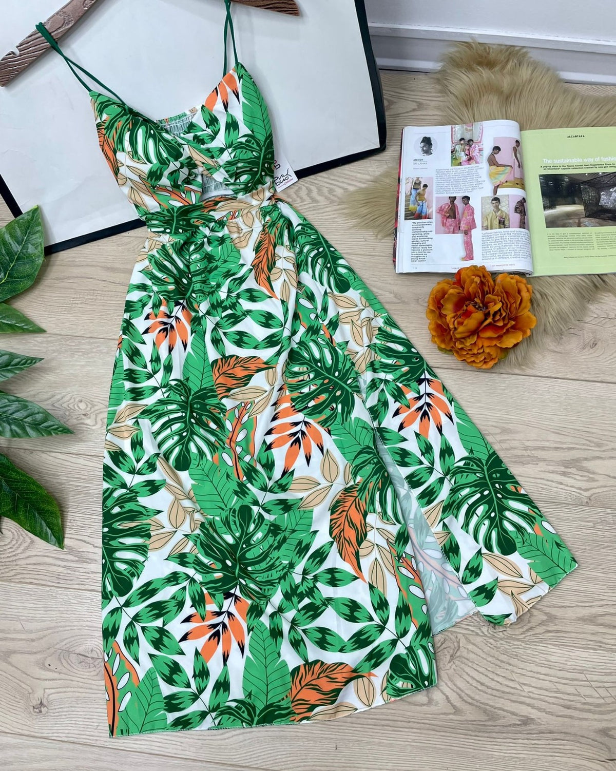 Abito in leggero tessuto strutturato con fantasia foglie, coppe preformate apertura centrale, Fascia elastica sul retro e spacco laterale. Fabbricato in Italia.