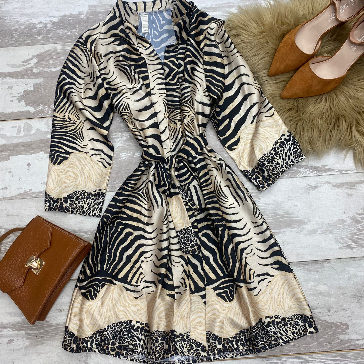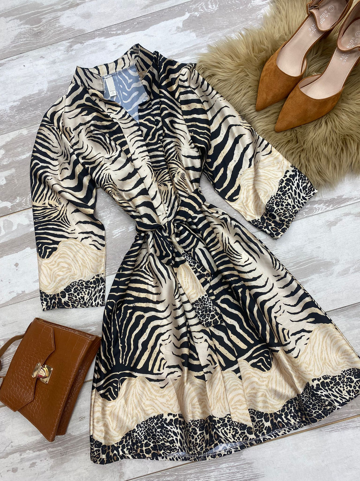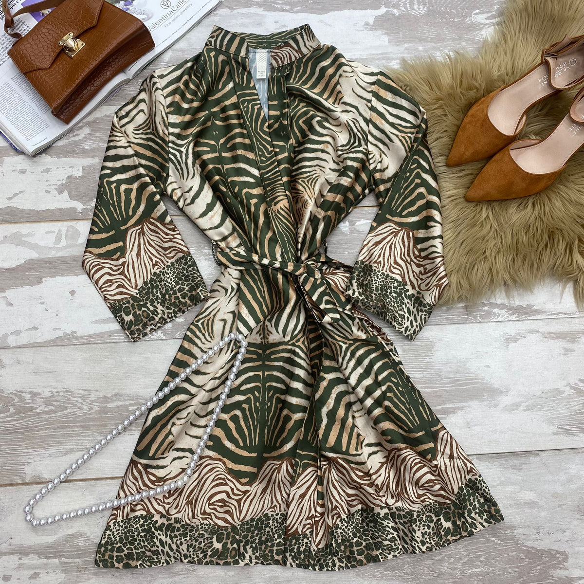 Abito camicione multicolor in leggero tessuto strutturato con cintura inclusa. Fabbricato in Italia.