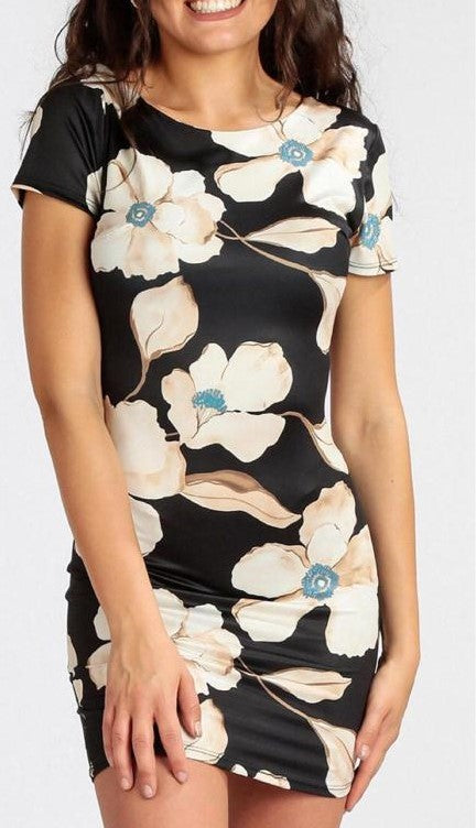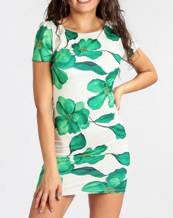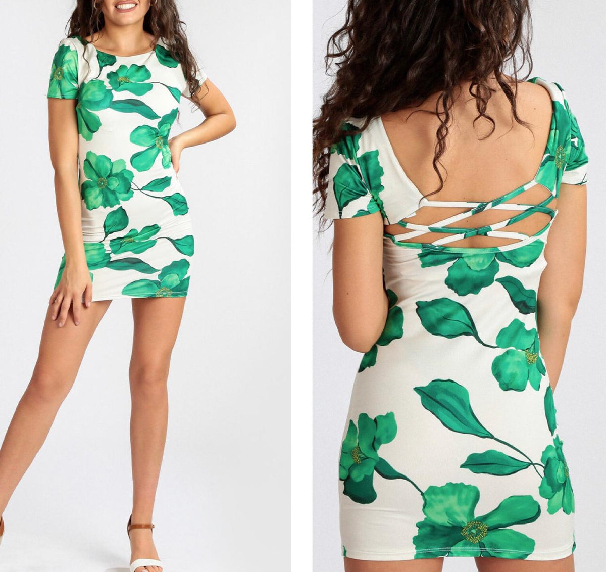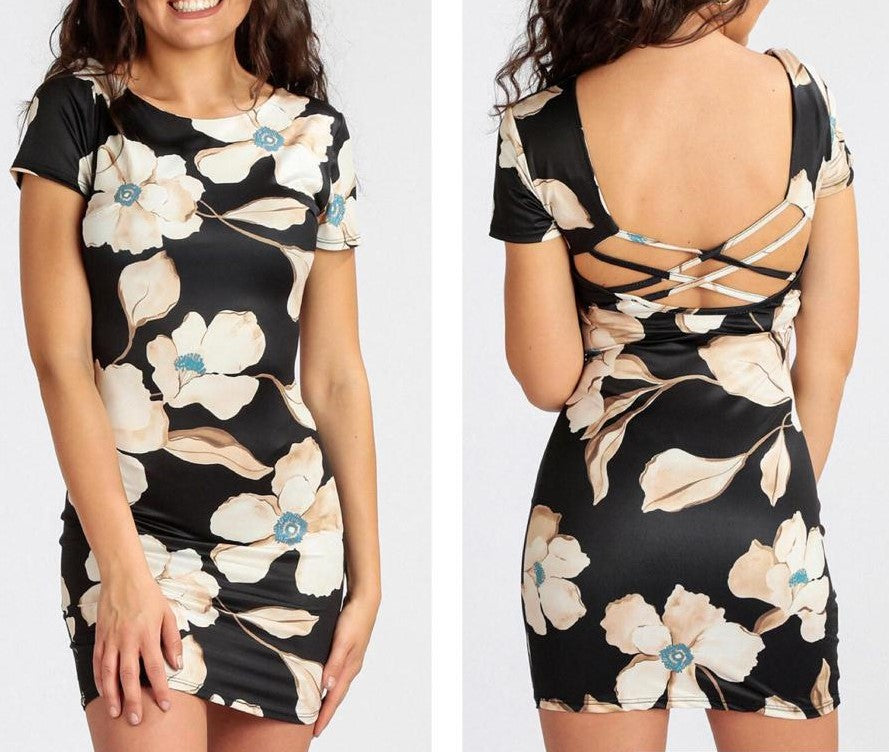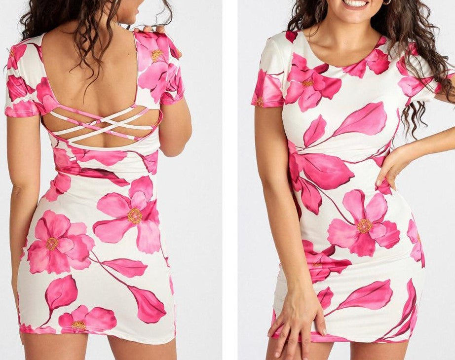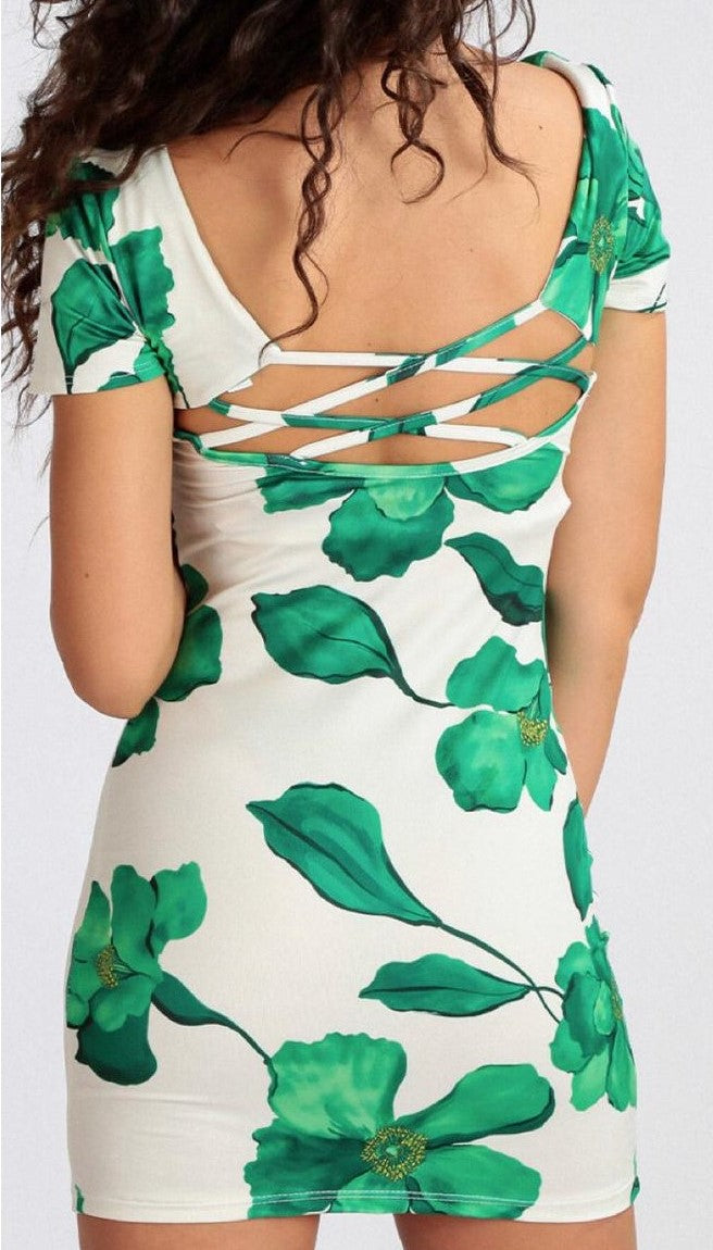 Abito in lycra con fantasia floreale e scollatura sul retro con fasce incrociate. Fabbricato in Italia.