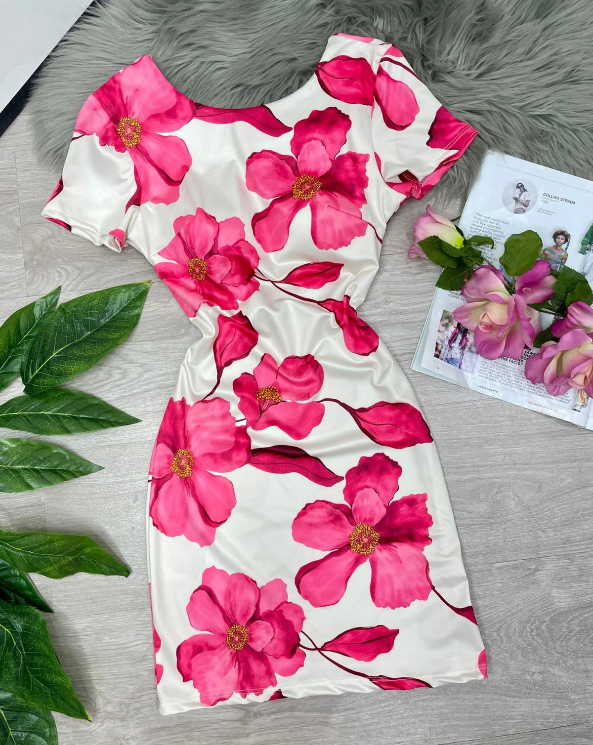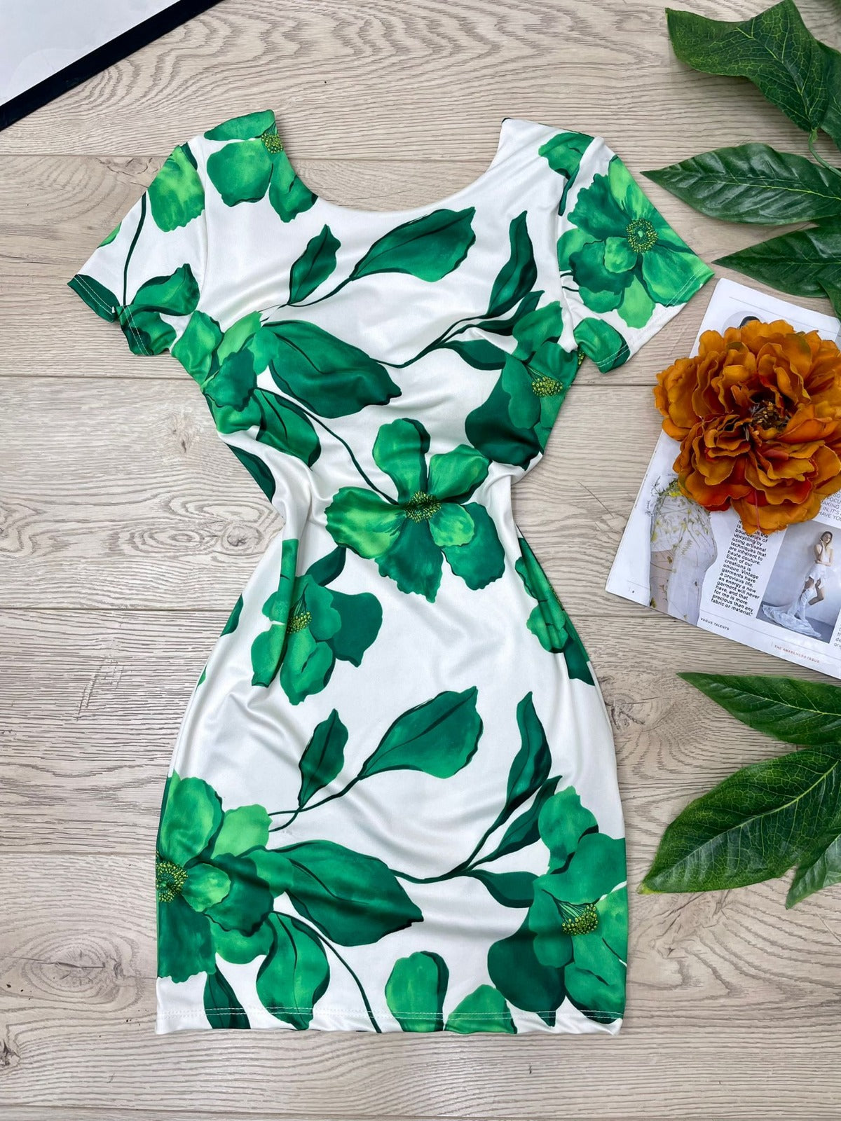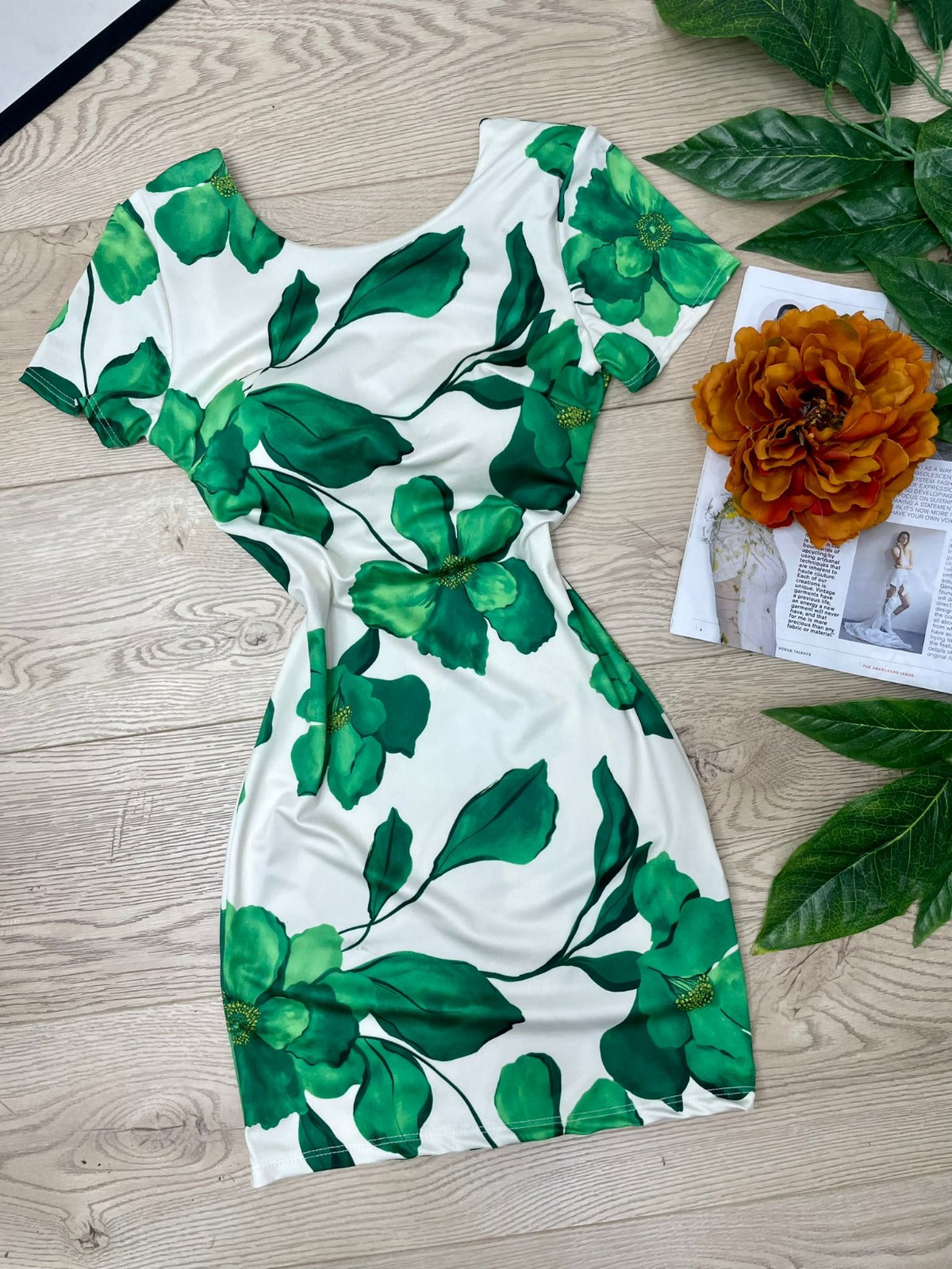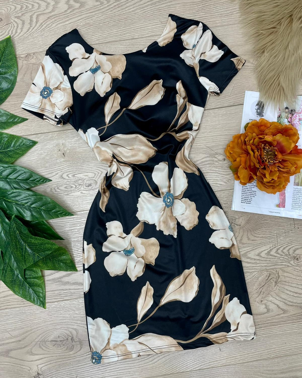 Abito in lycra con fantasia floreale e scollatura sul retro con fasce incrociate. Fabbricato in Italia.