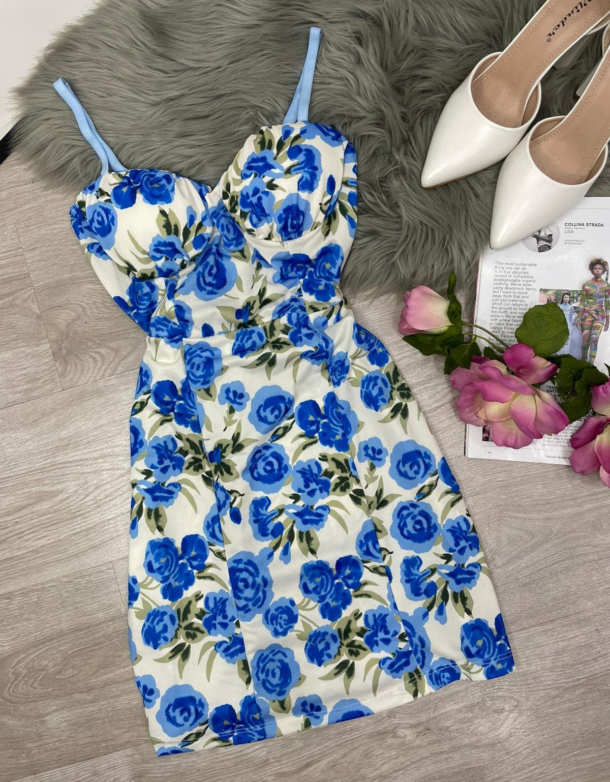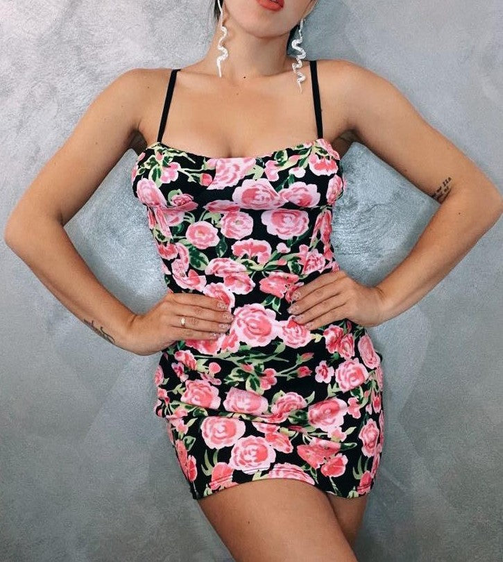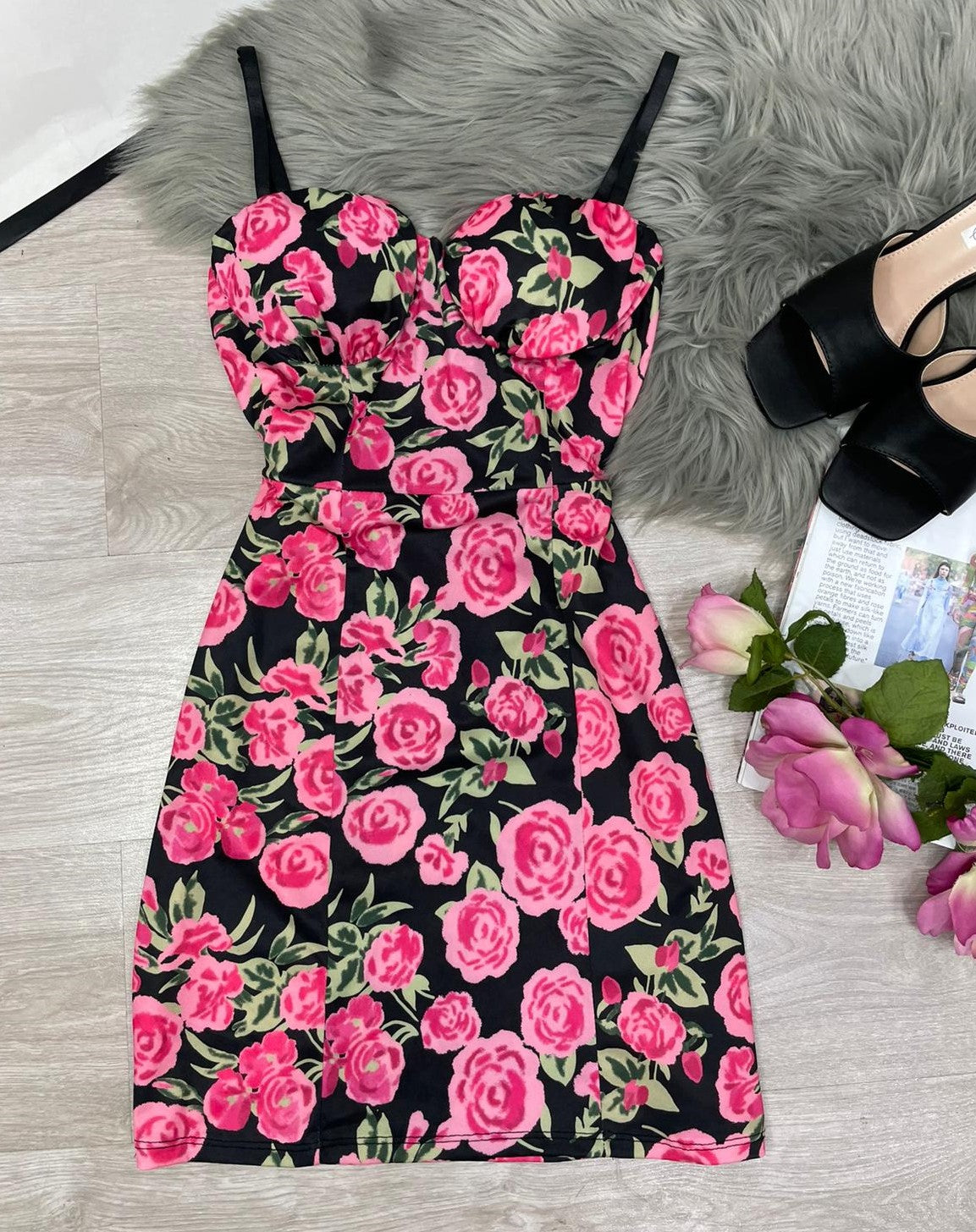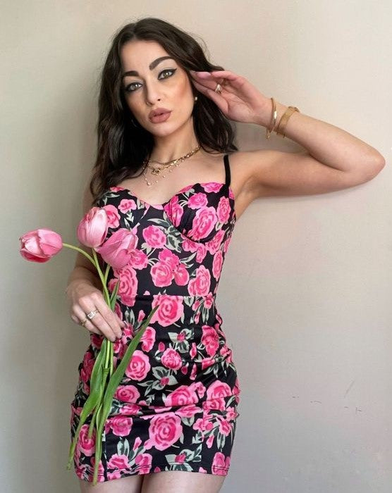 Abito con fantasia floreale, coppe preformate e spalline regolabili. Fabbricato in Italia.