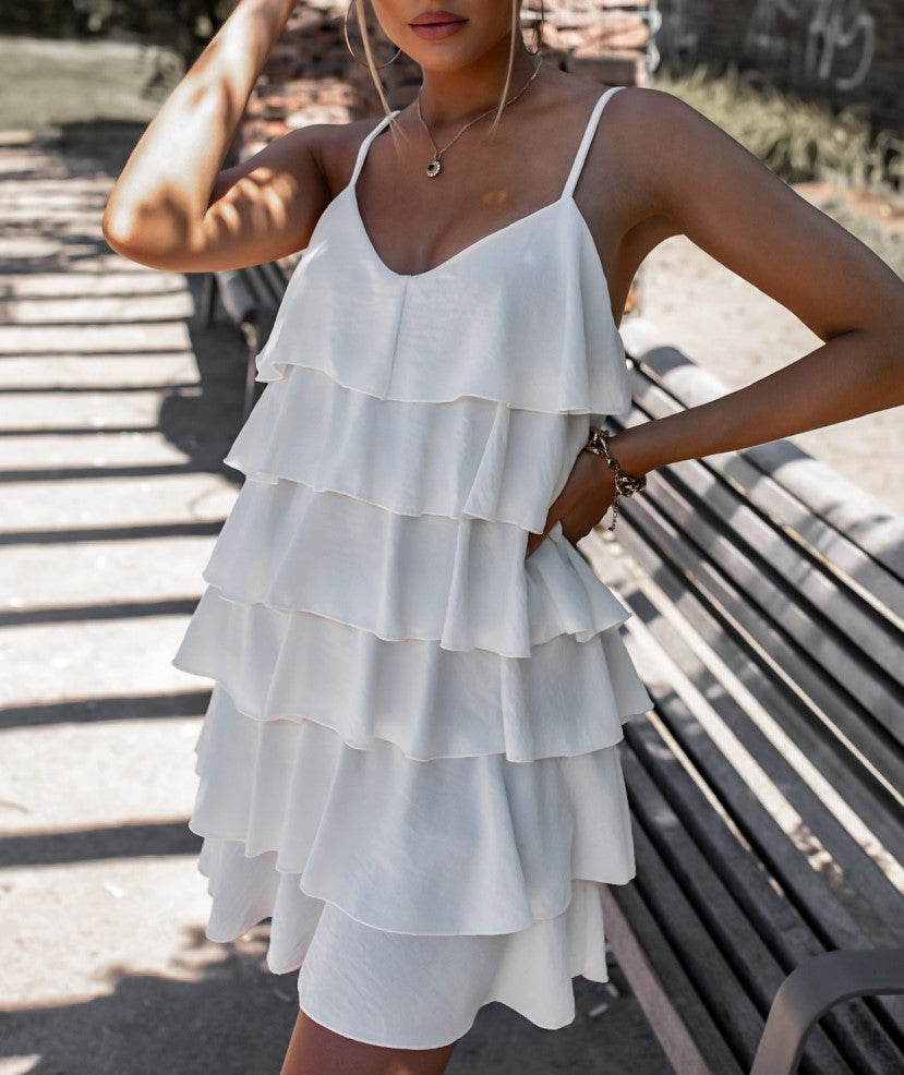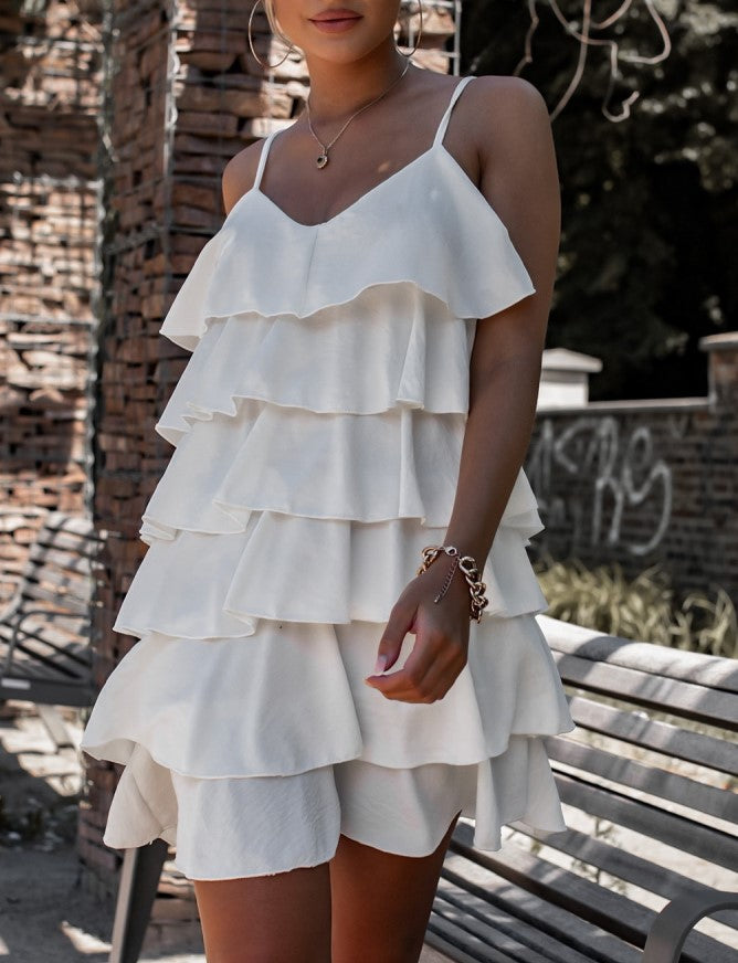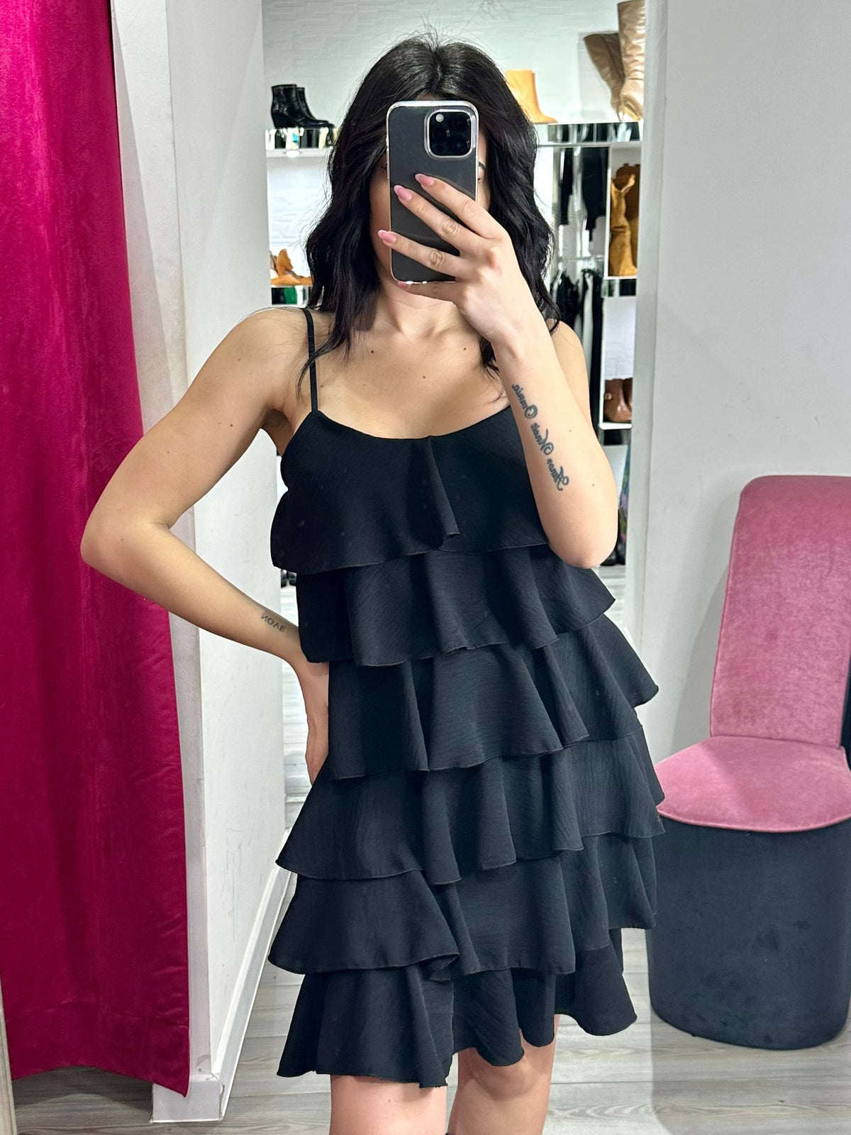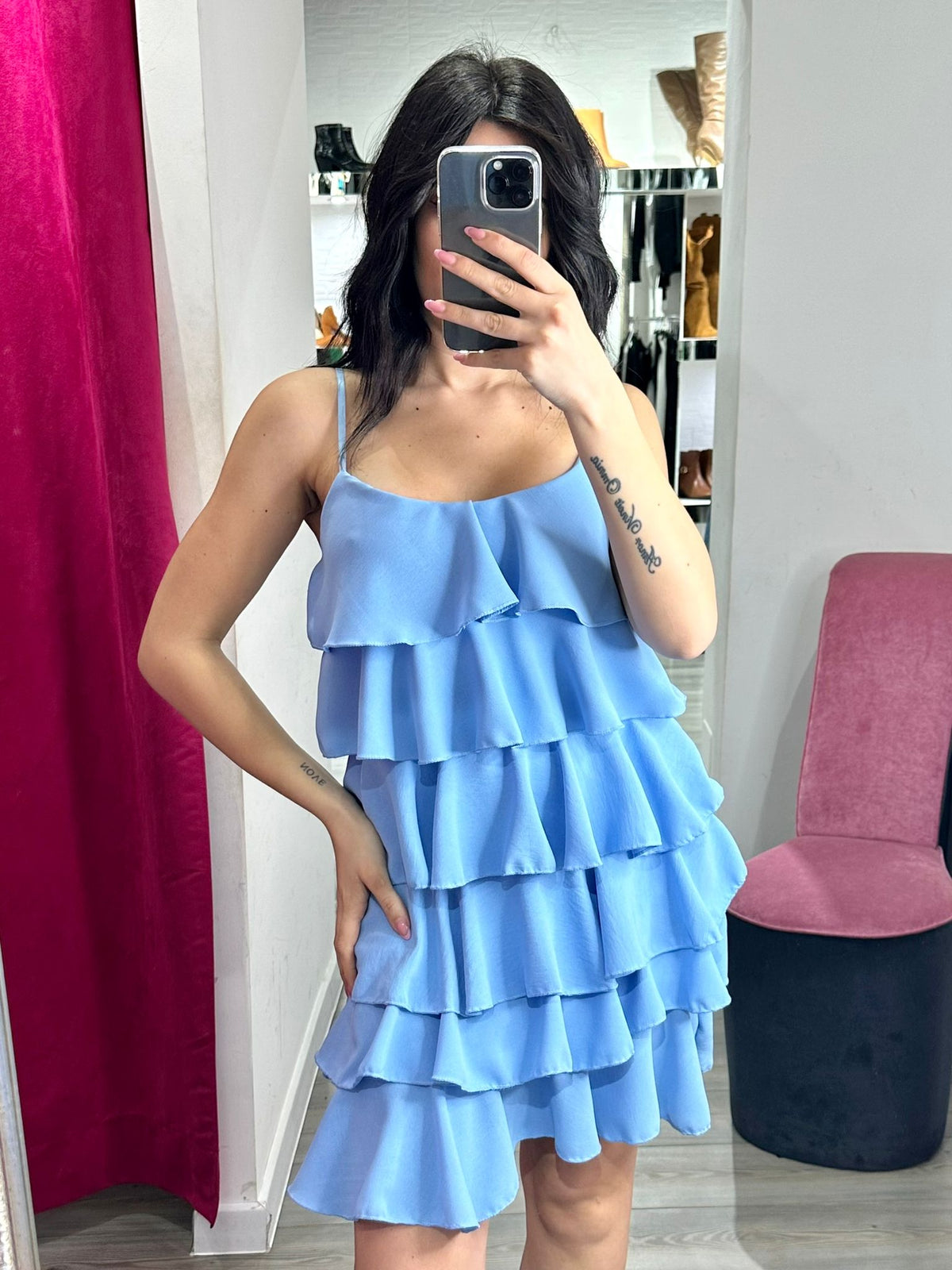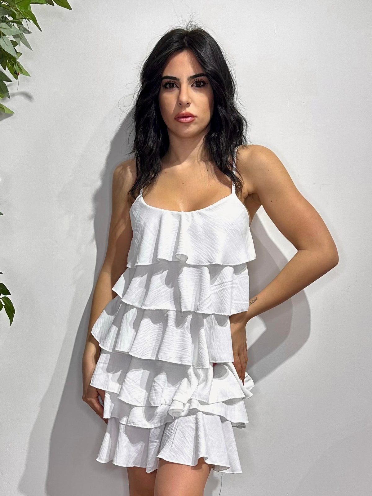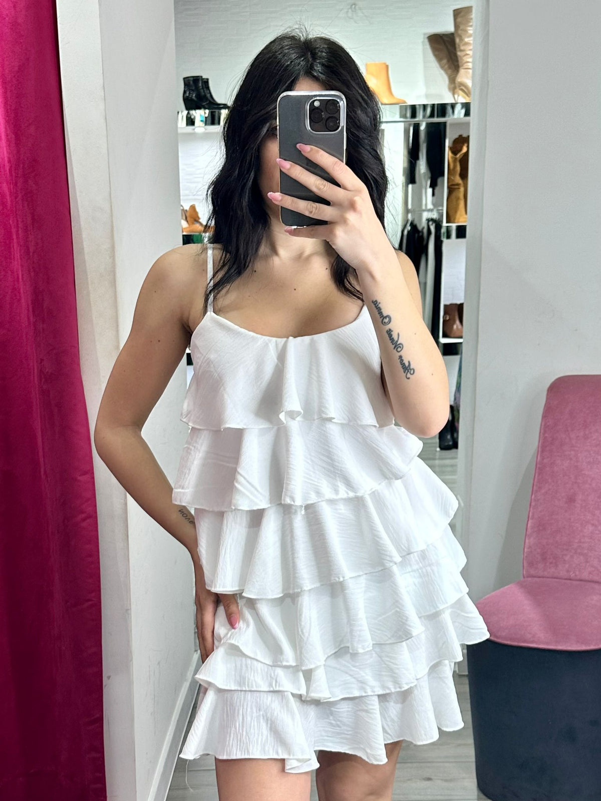 Abito in tessuto strutturato con volant. Fabbricato in Italia.