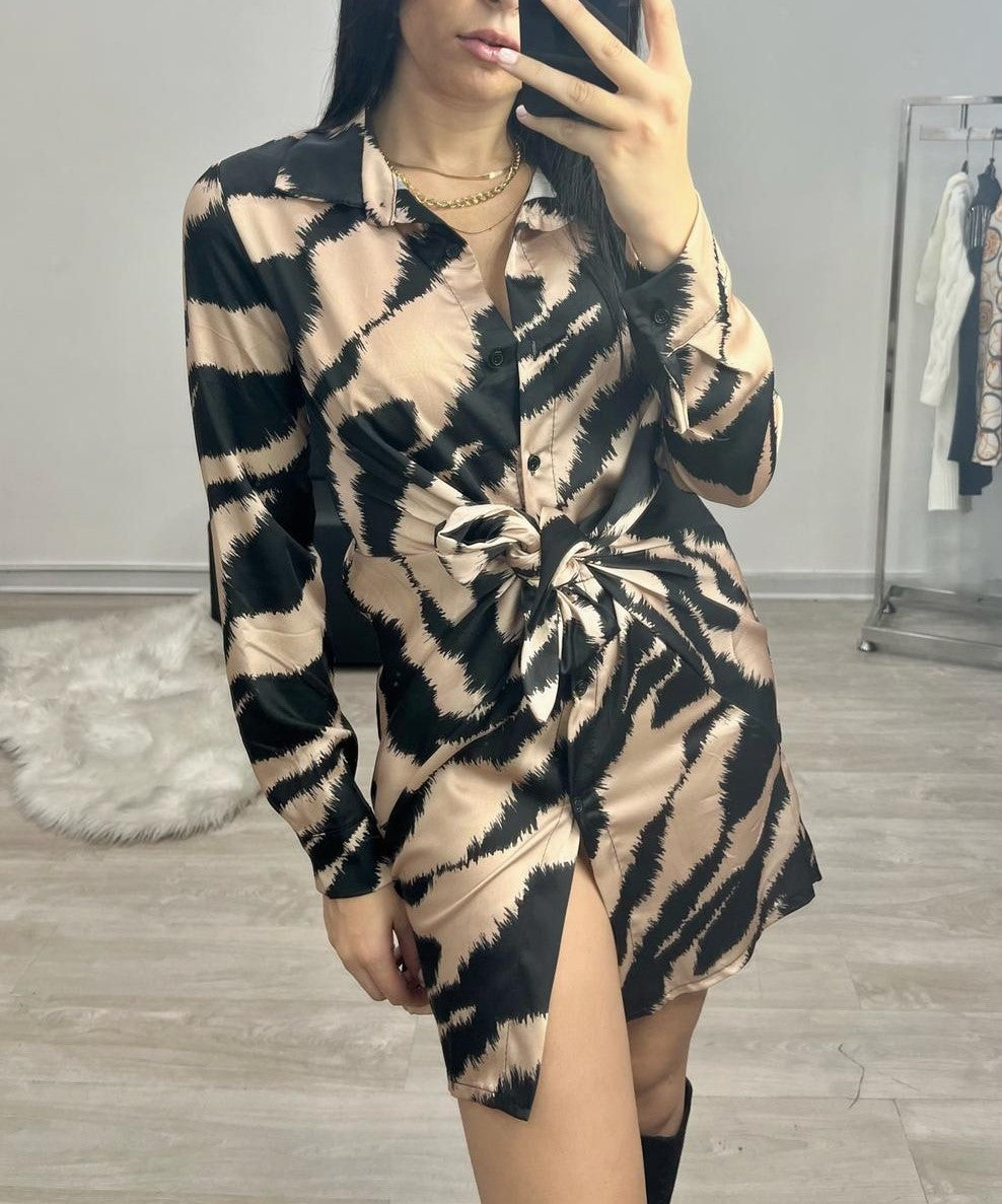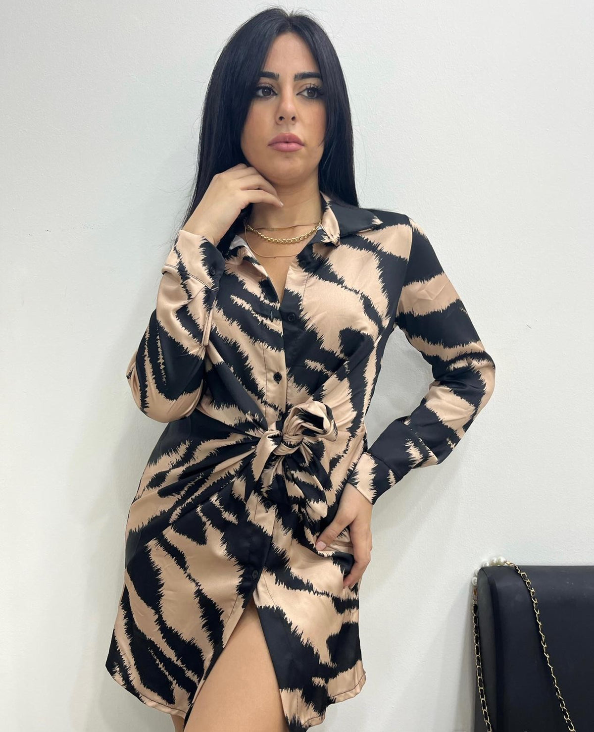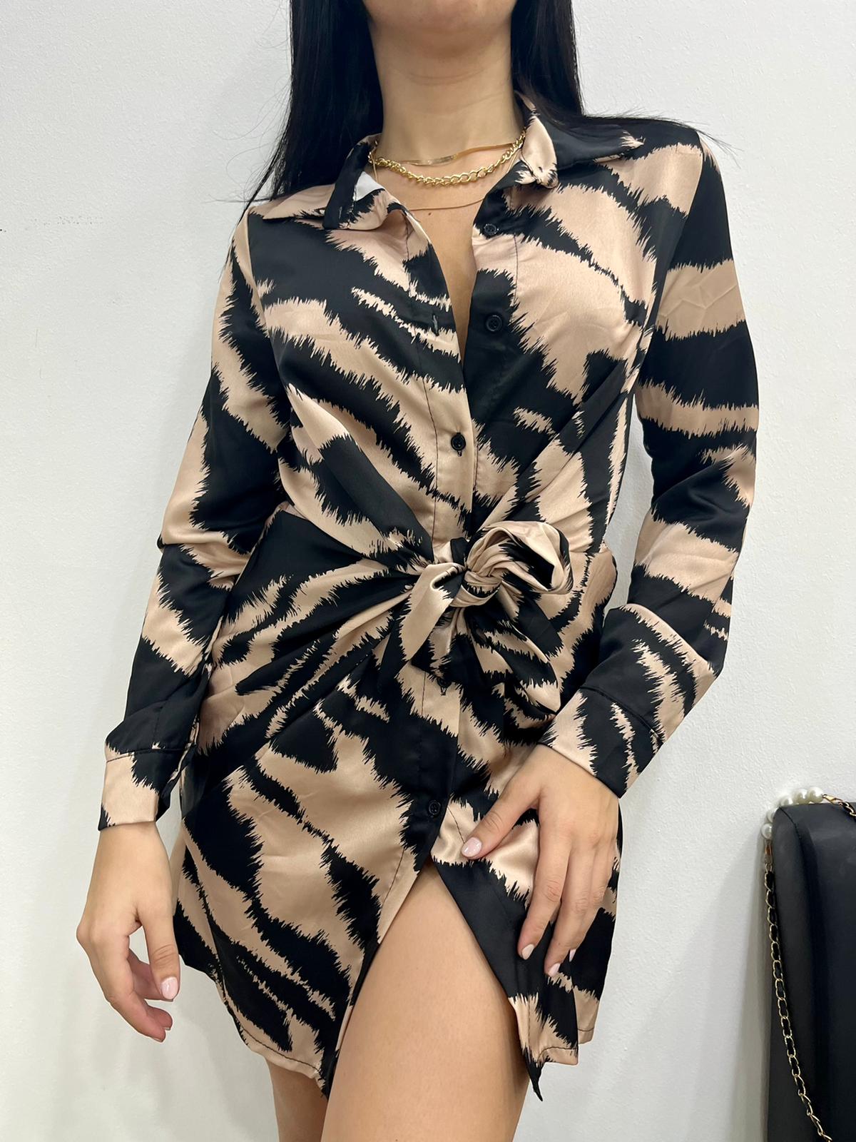 Abito modello chemisier in leggero tessuto strutturato con fantasia astratta, elastico sul retro e cintura a fiocco inclusa. Fabbricato in Italia.