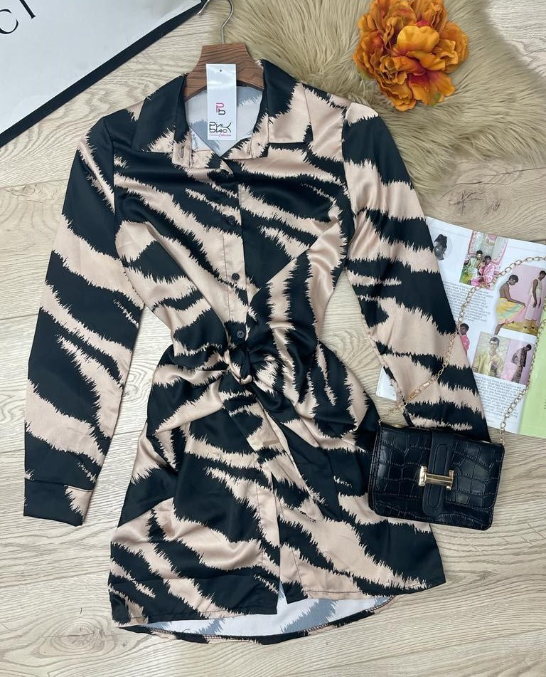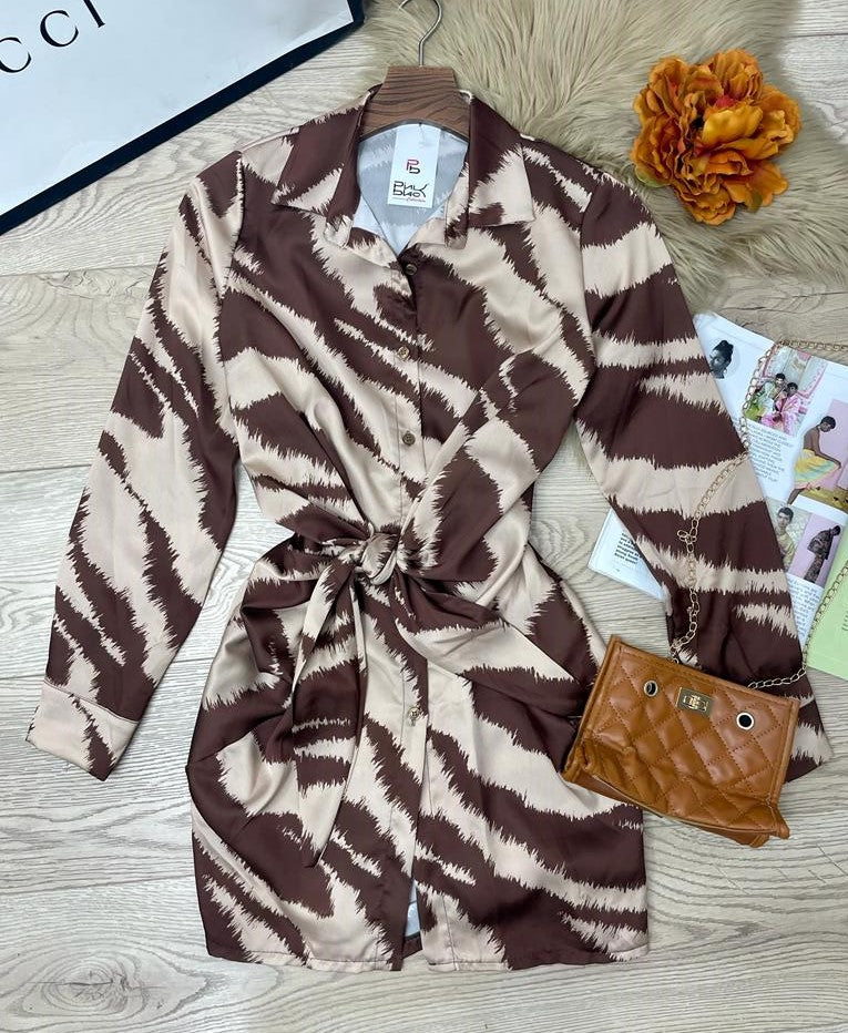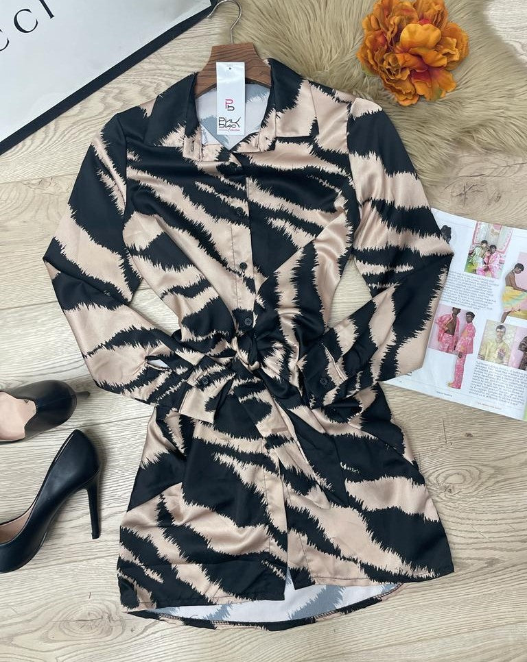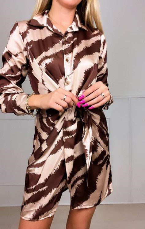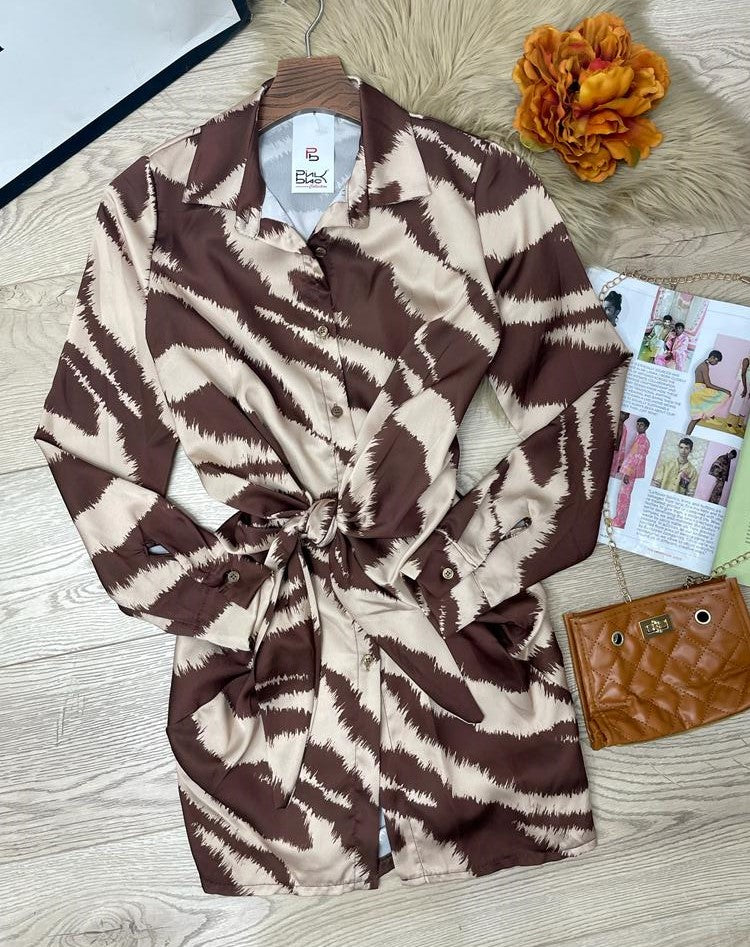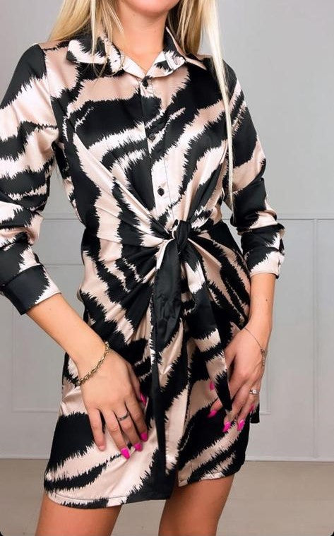 Abito modello chemisier in leggero tessuto strutturato con fantasia astratta, elastico sul retro e cintura a fiocco inclusa. Fabbricato in Italia.