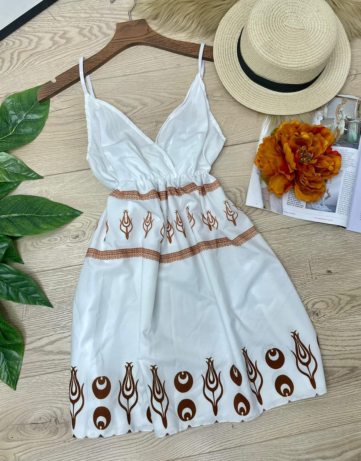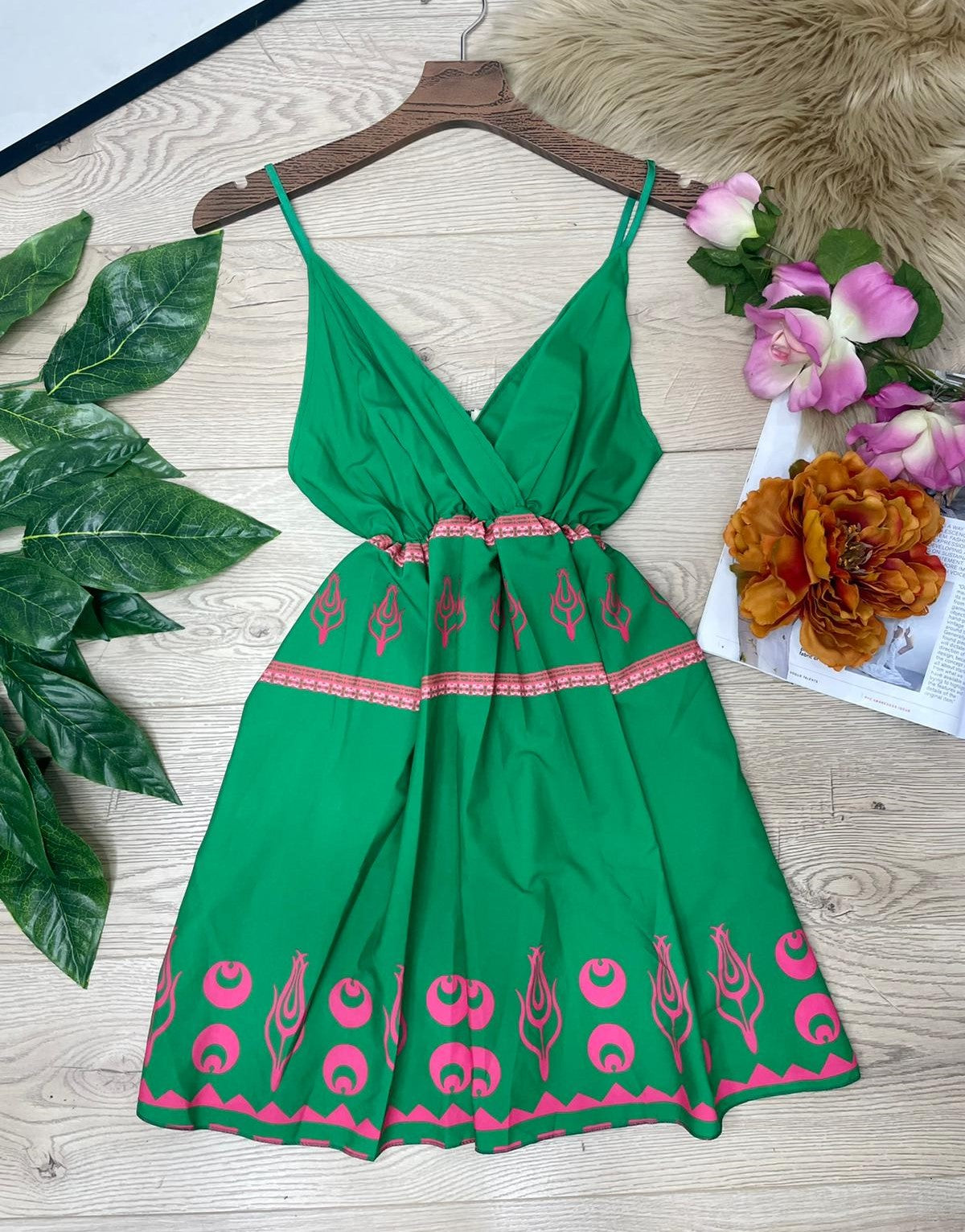 Abito in leggero tessuto strutturato con fantasia astratta, spalline regolabili e fascia elastica in vita. Fabbricato in Italia.
