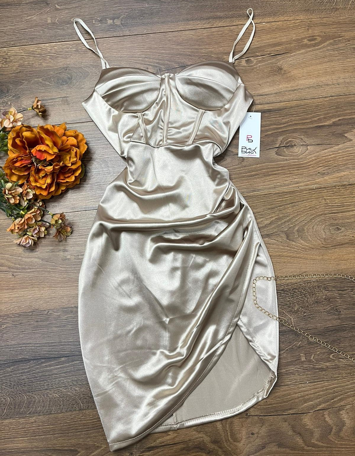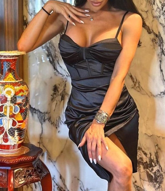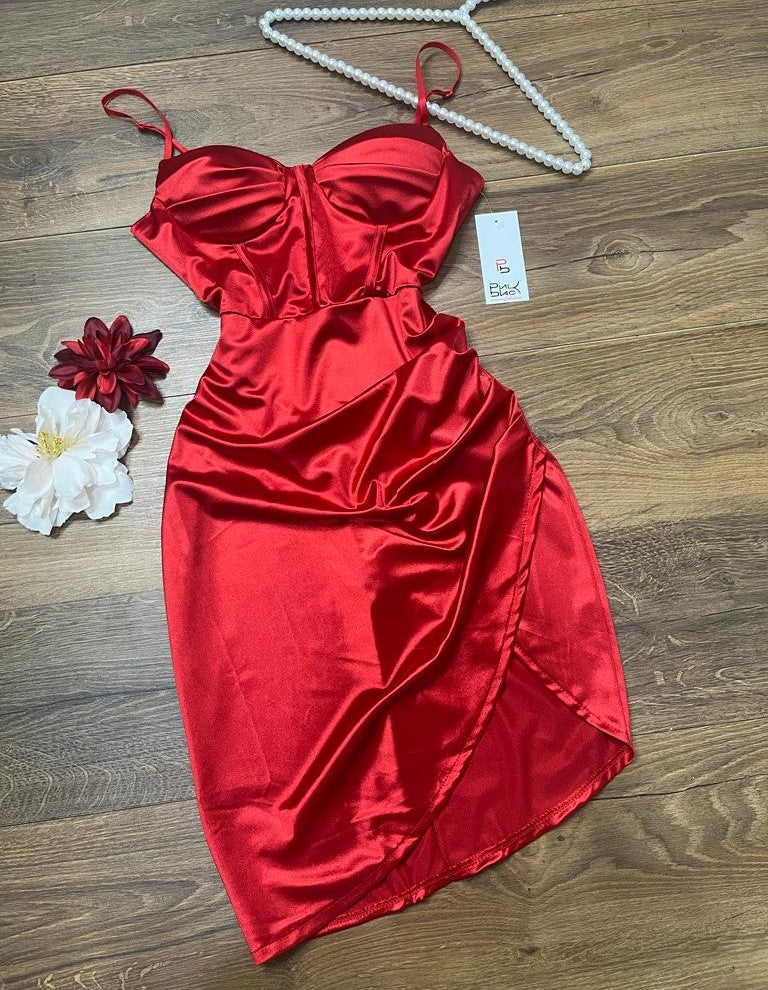 Abito in raso con coppe preformate, spalline regolabli, gonna a portafoglio con drappeggio e cerniera laterale. Fabbricato in Italia.