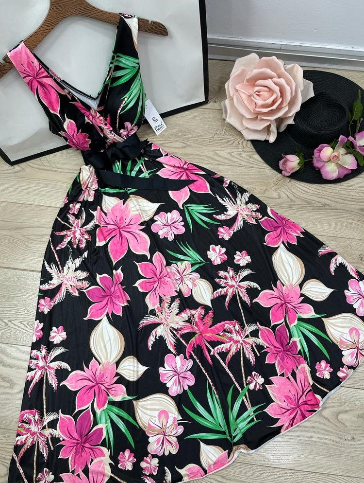 Abito lungo in lycra con fantasia floreale o astratta, coppe preformate, elastico in vita e cinturino in nastro incluso. Fabbricato in Italia.