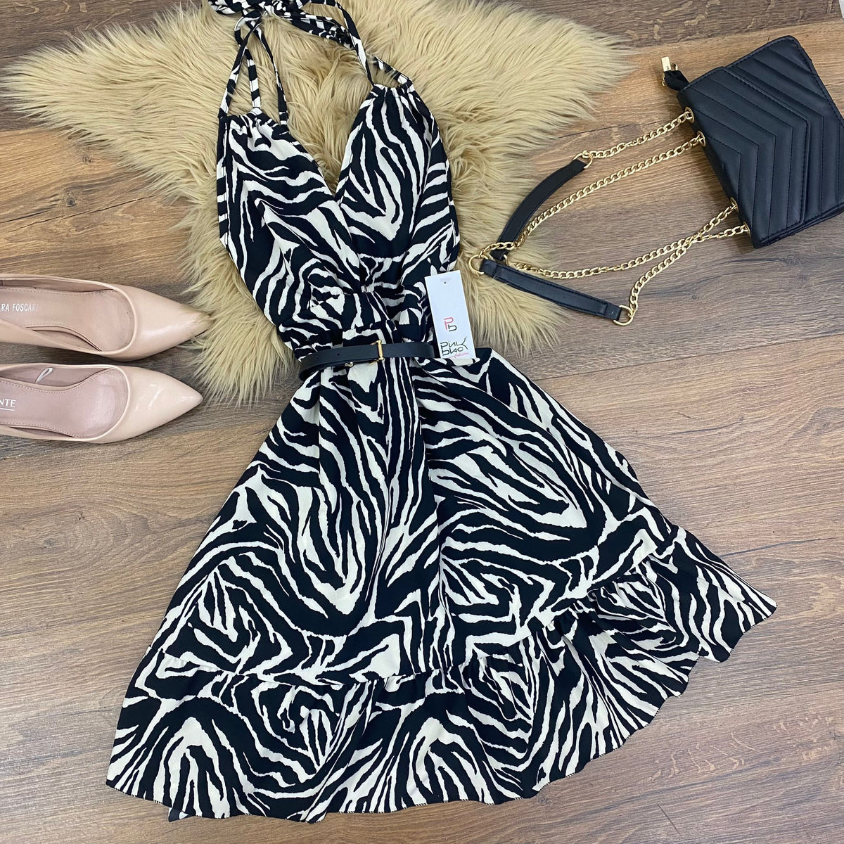 Abitino in tessuto strutturato con fantasia animalier, spalline ad incrocio ed elastico in vita. Fabbricato in Italia.