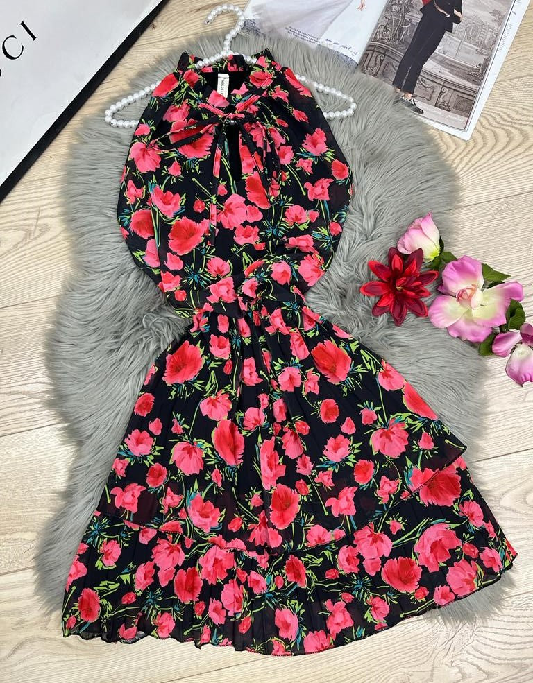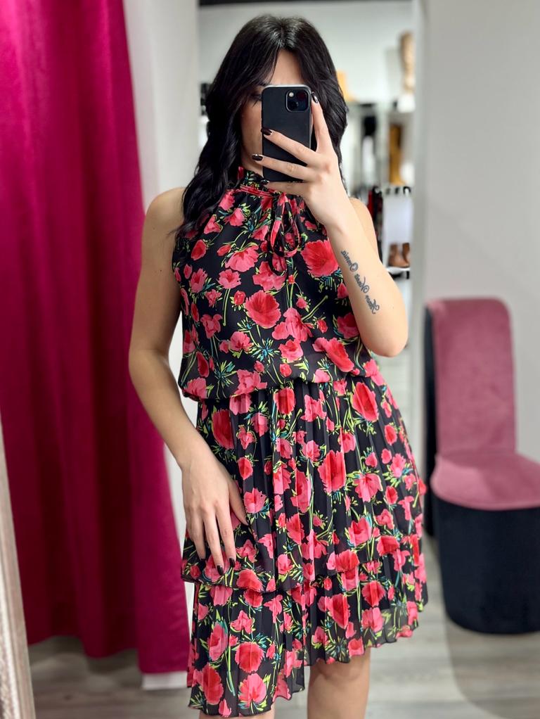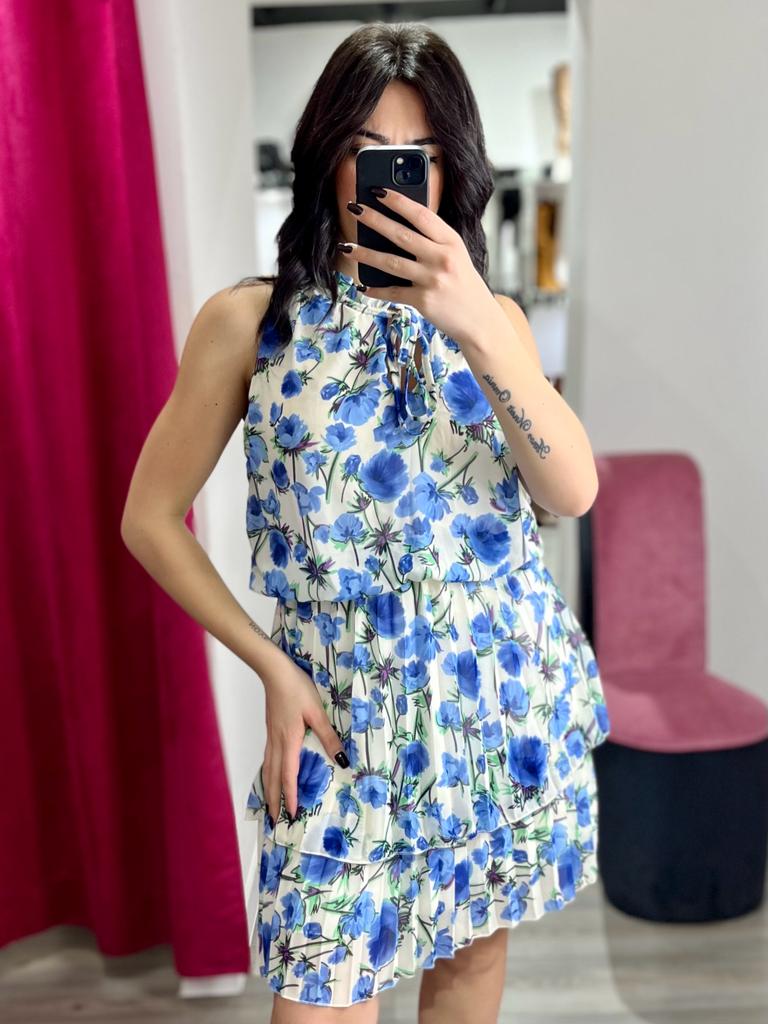 Abito in chiffon con fantasia floreale, scollo all'americana, elastico in vita e gonna plissè. Fabbricato in Italia.