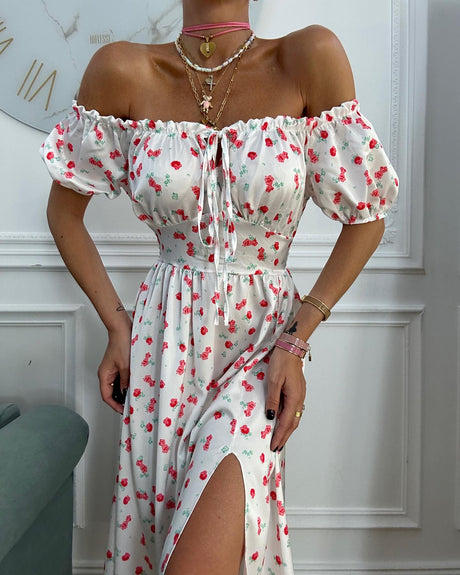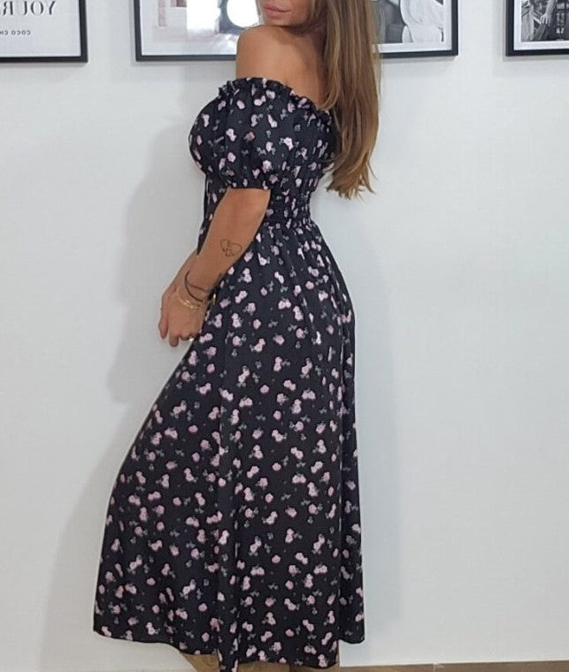 Abito lungo effetto raso con fantasia floreale, fascia elastica sul retro e spacco laterale. Fabbricato in Italia.
