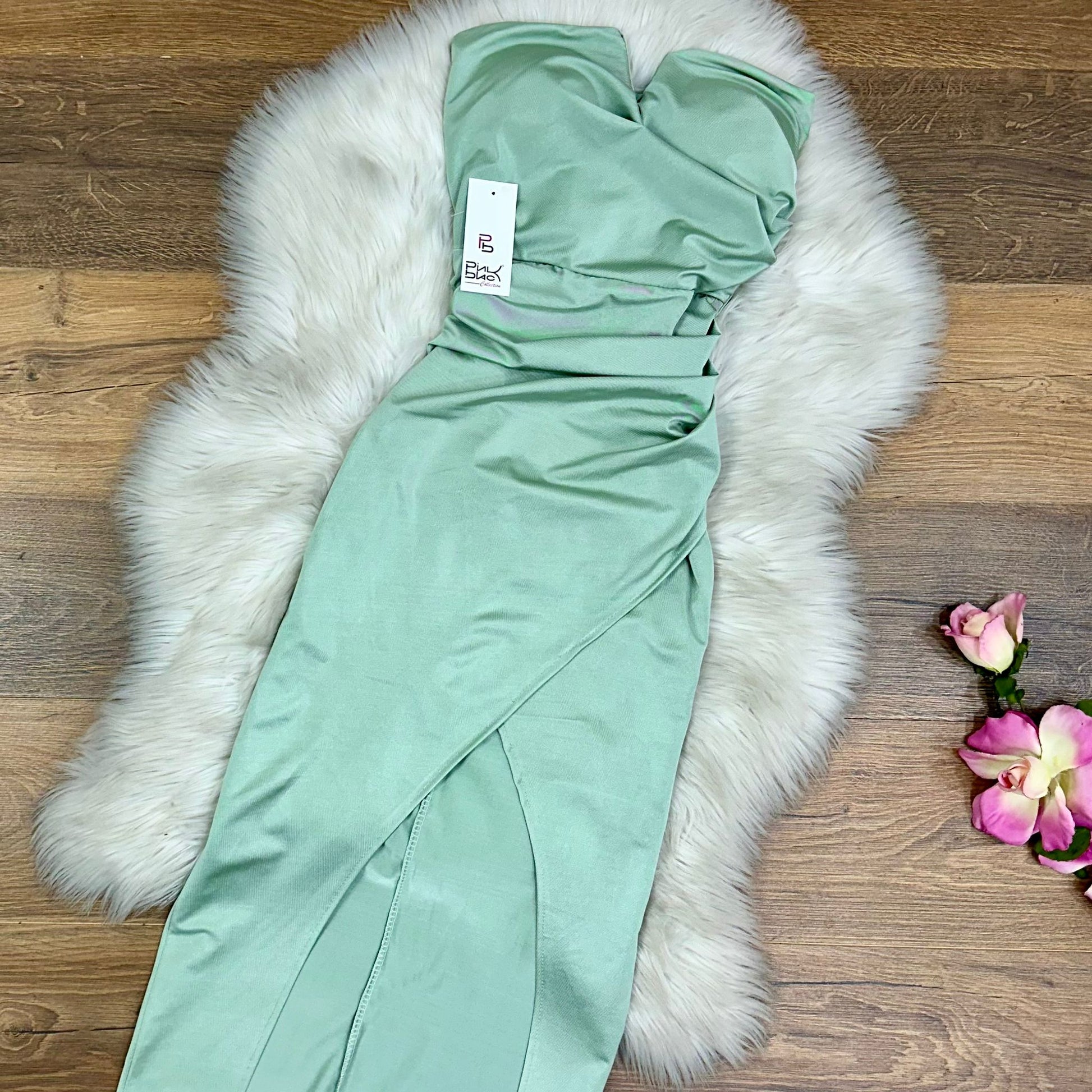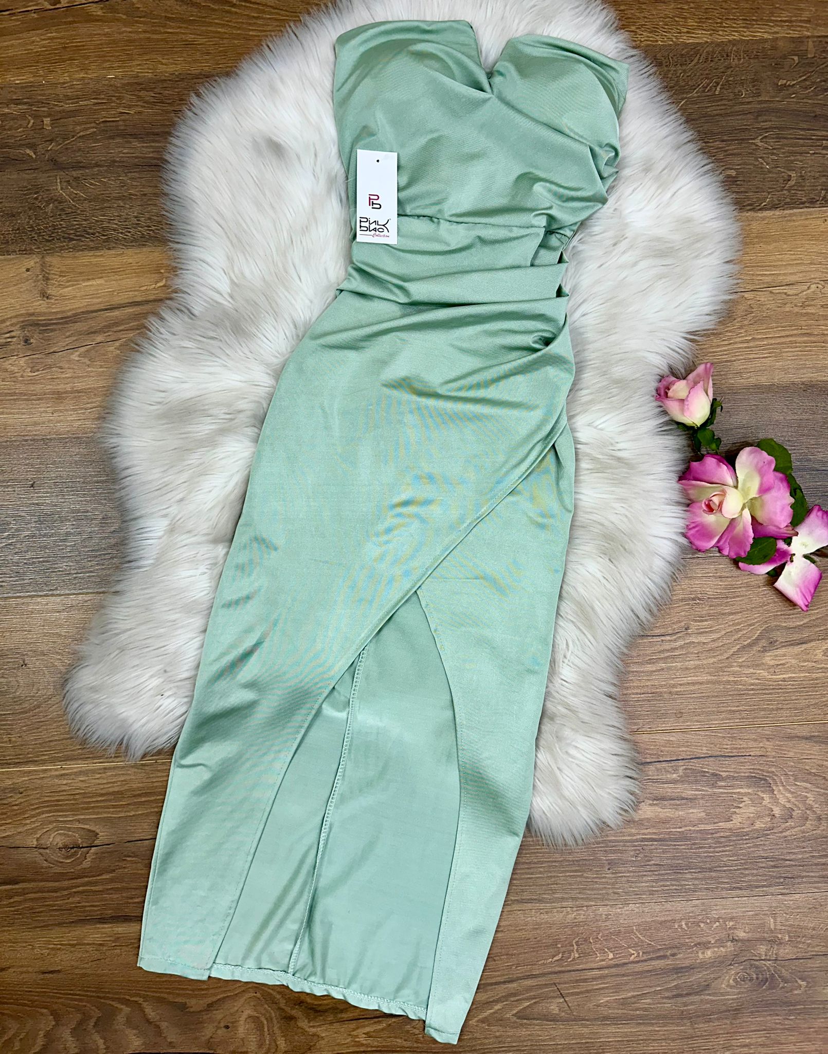 Abito lungo effetto lycra con spallo laterale, coppe preformate e gonna a portafoglio e chisura con cerniera sul retro Fabbricato in Italia.