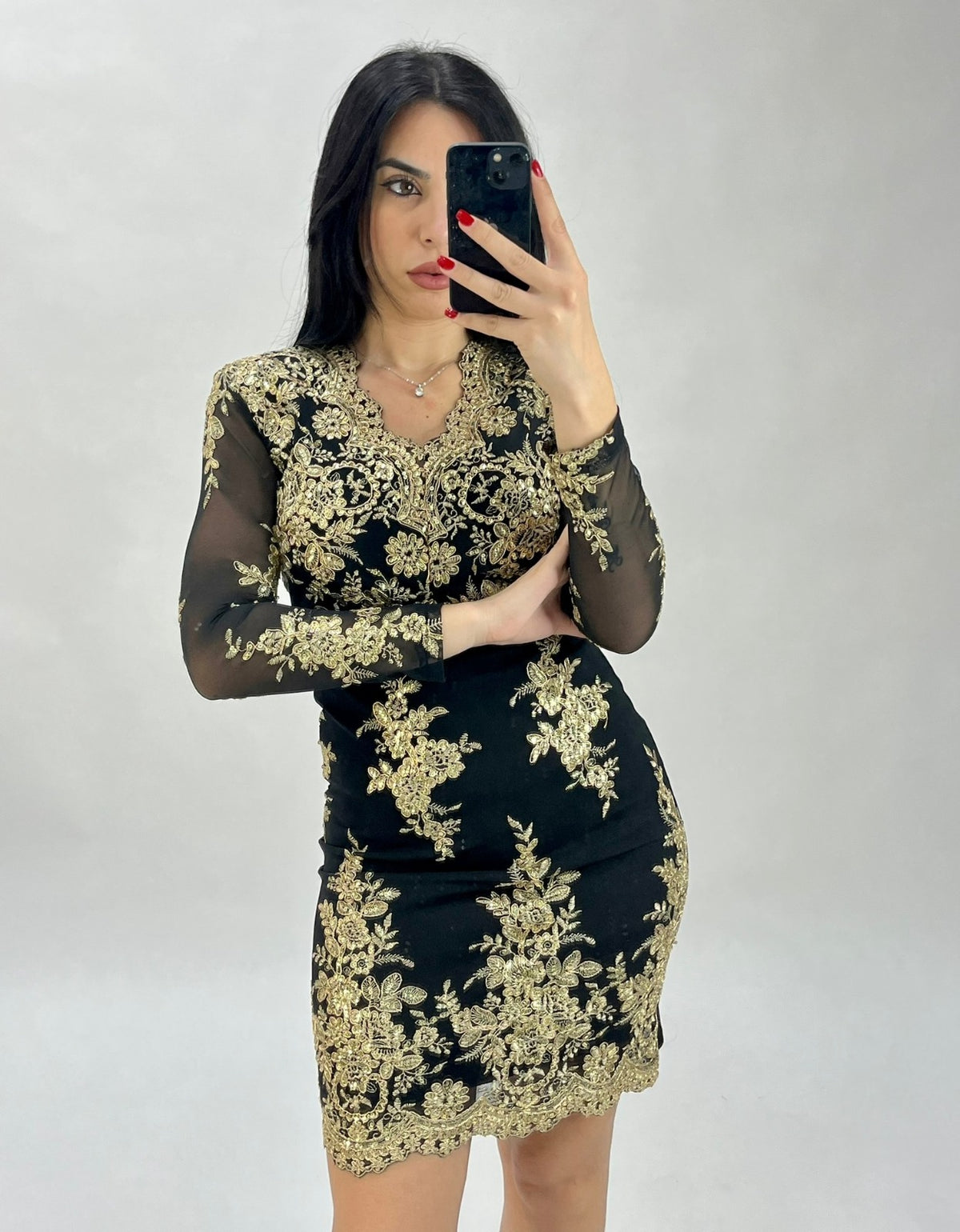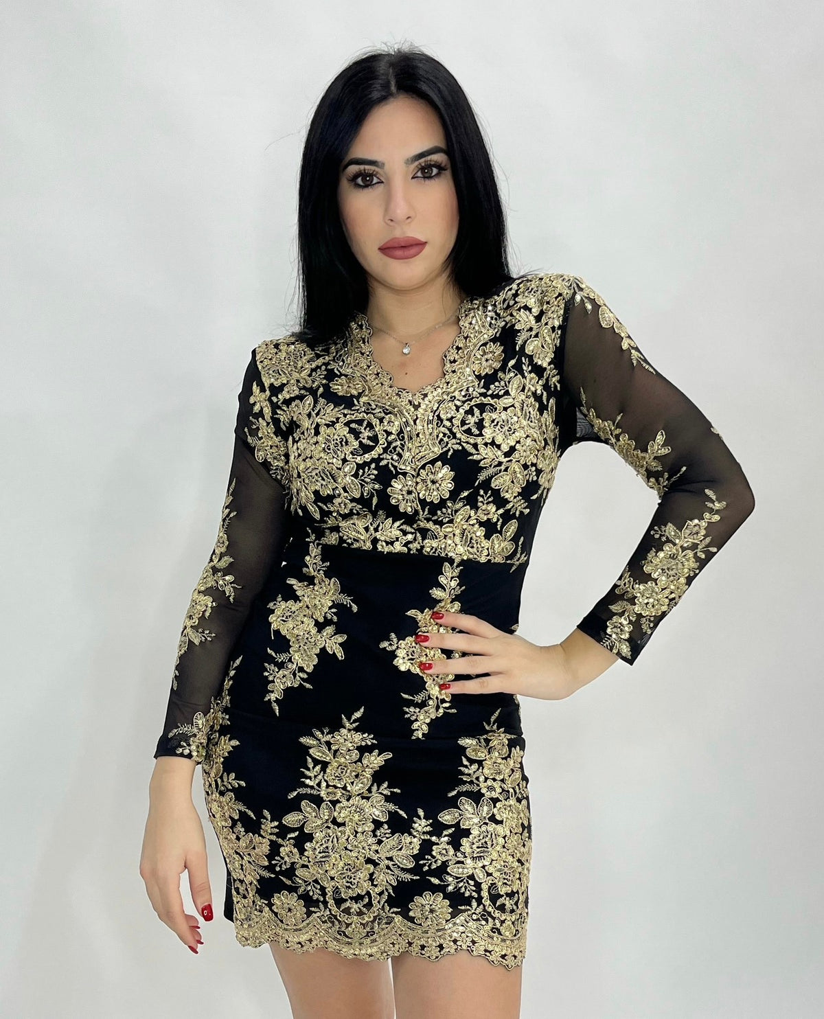 Abito in tessuto scuba crepe con velo di tulle, ricami floreali in rilievo e maniche velate. Fabbricato in Italia.