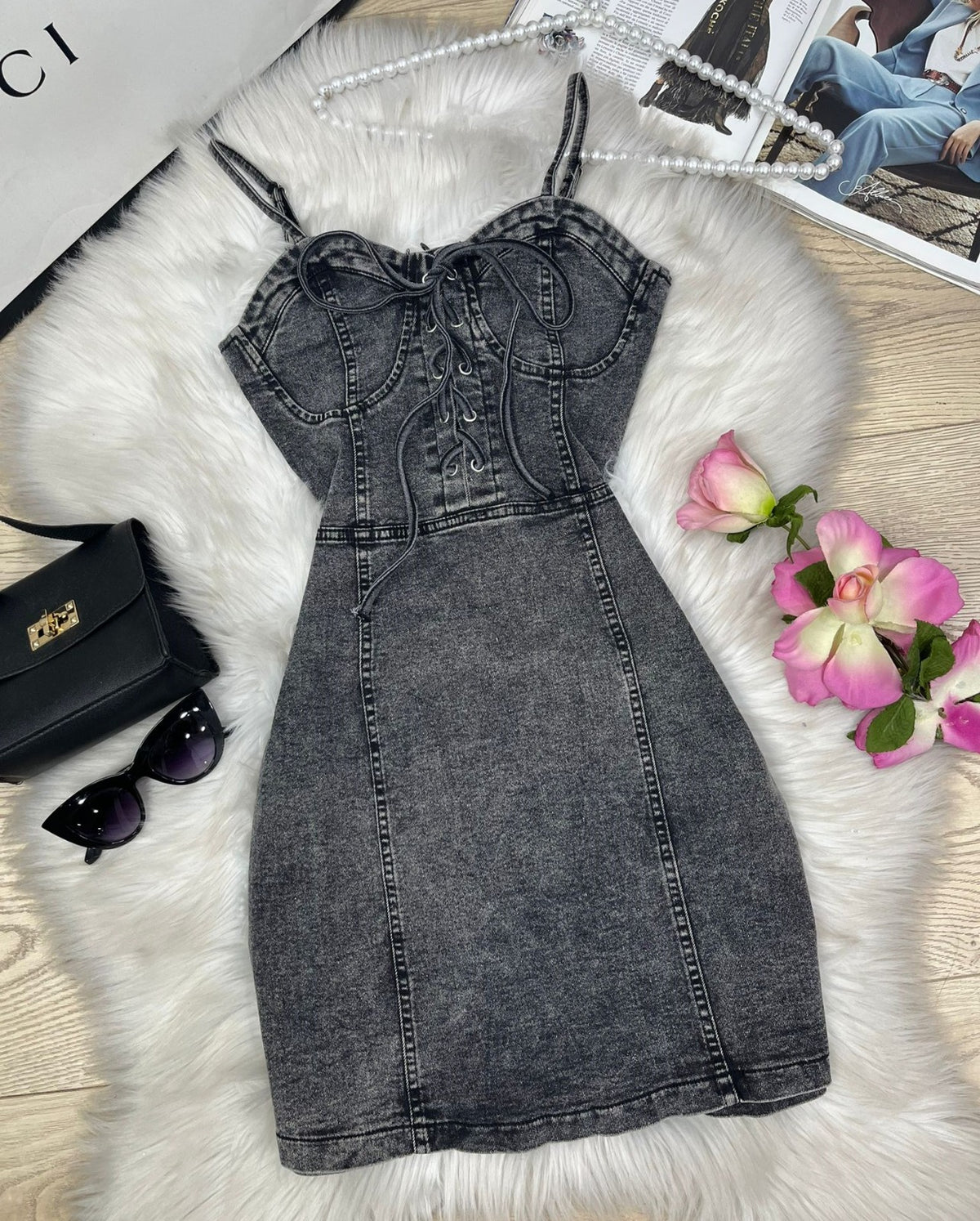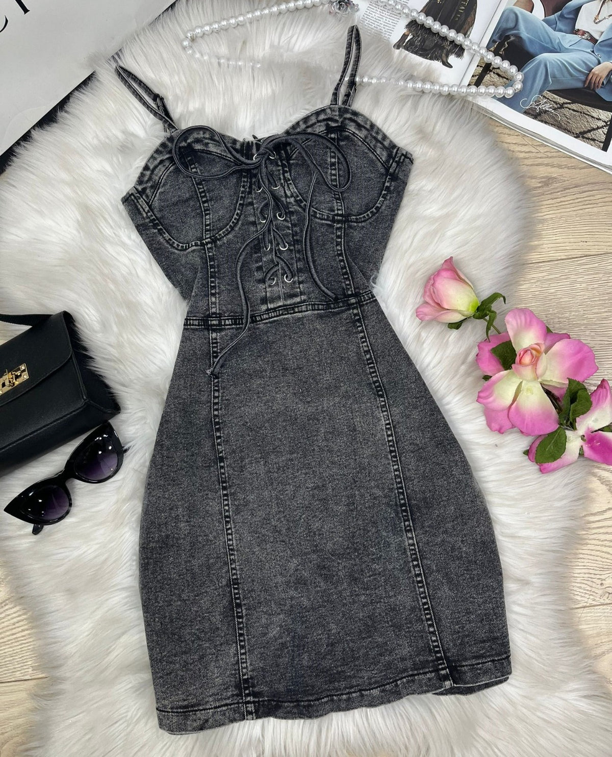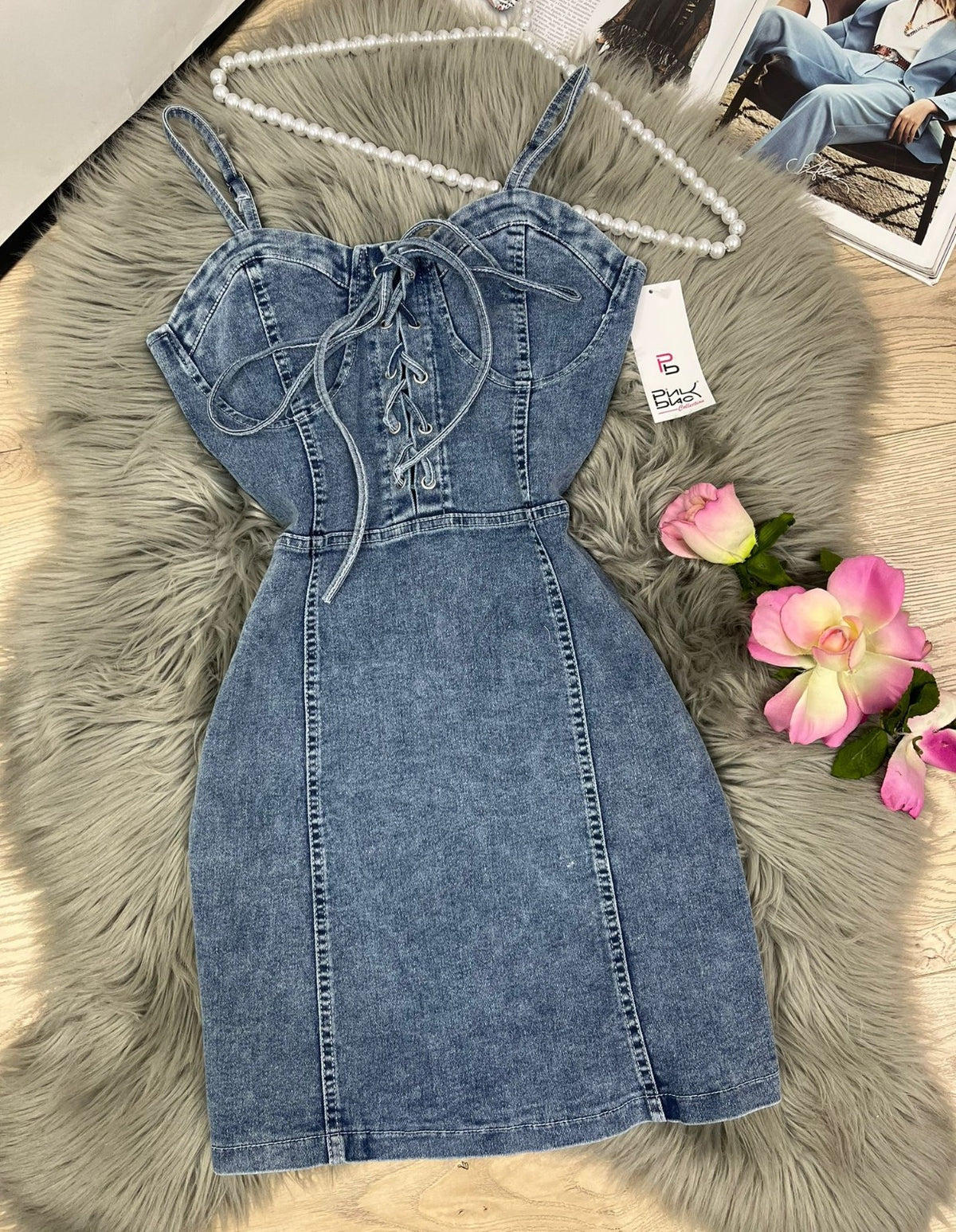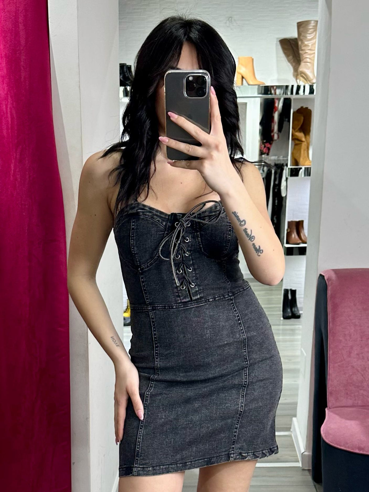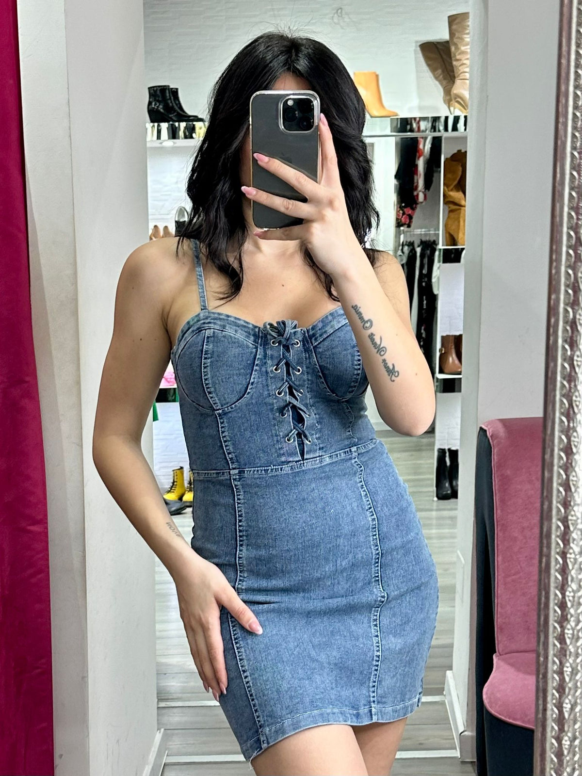 Abito in jeans con legatura centrale e chiusura con cerniera. Fabbricato all'estero.