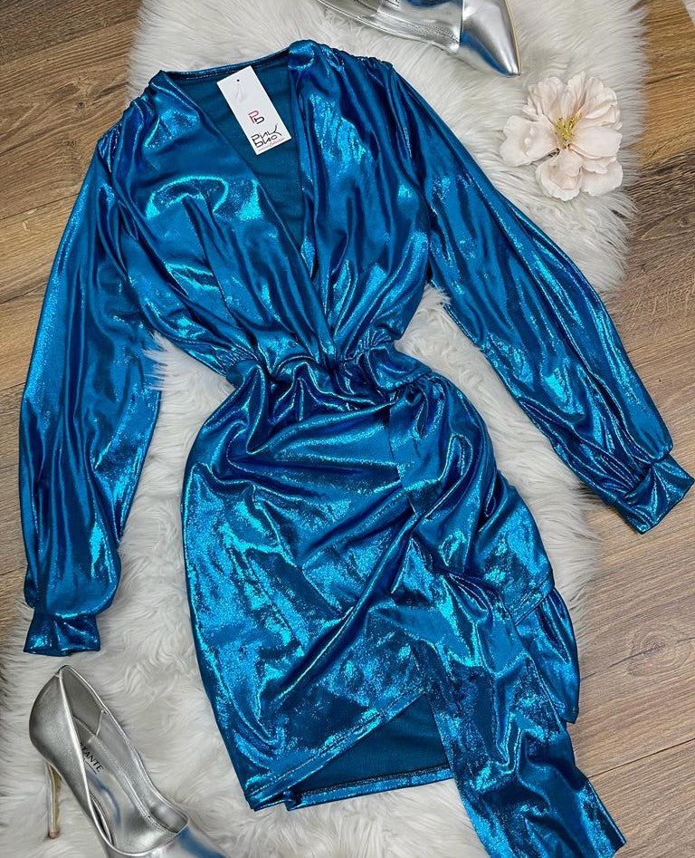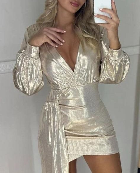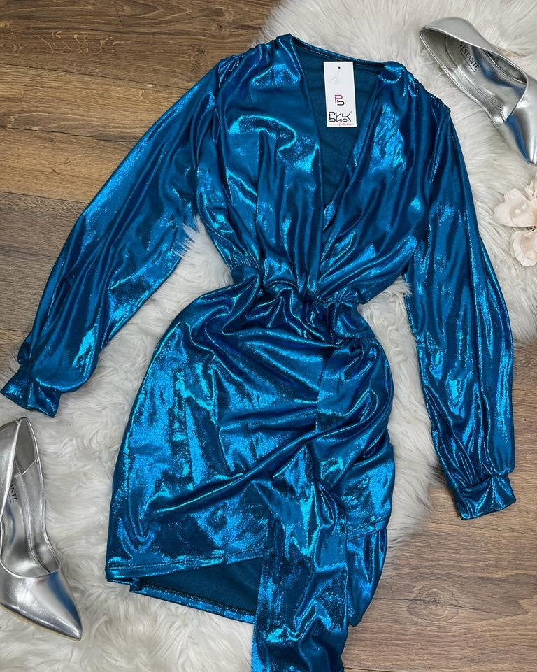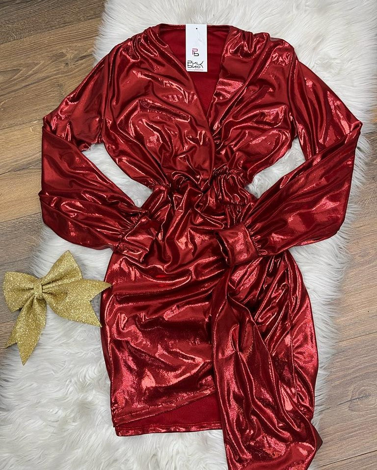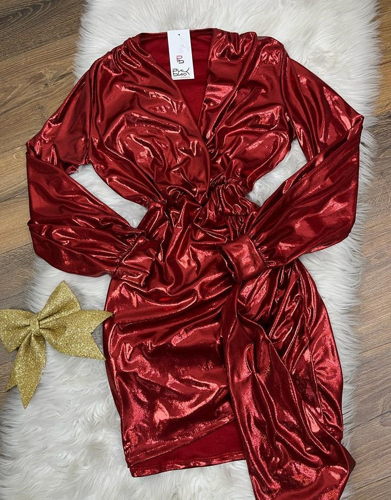 Abito effetto laminato con gonna a portafoglio. Fabbricato in Italia.