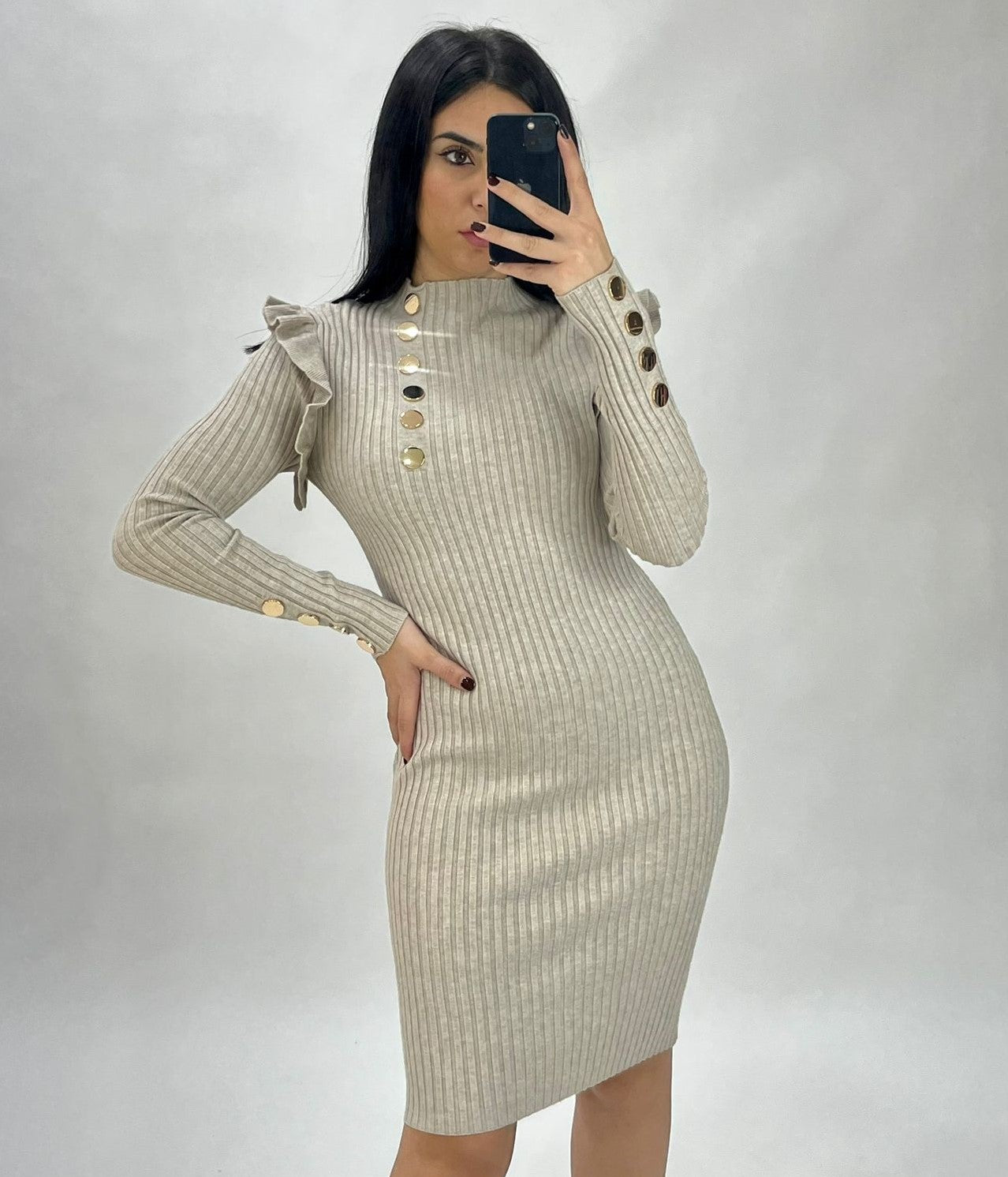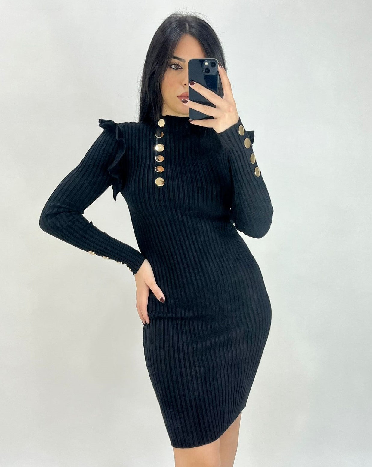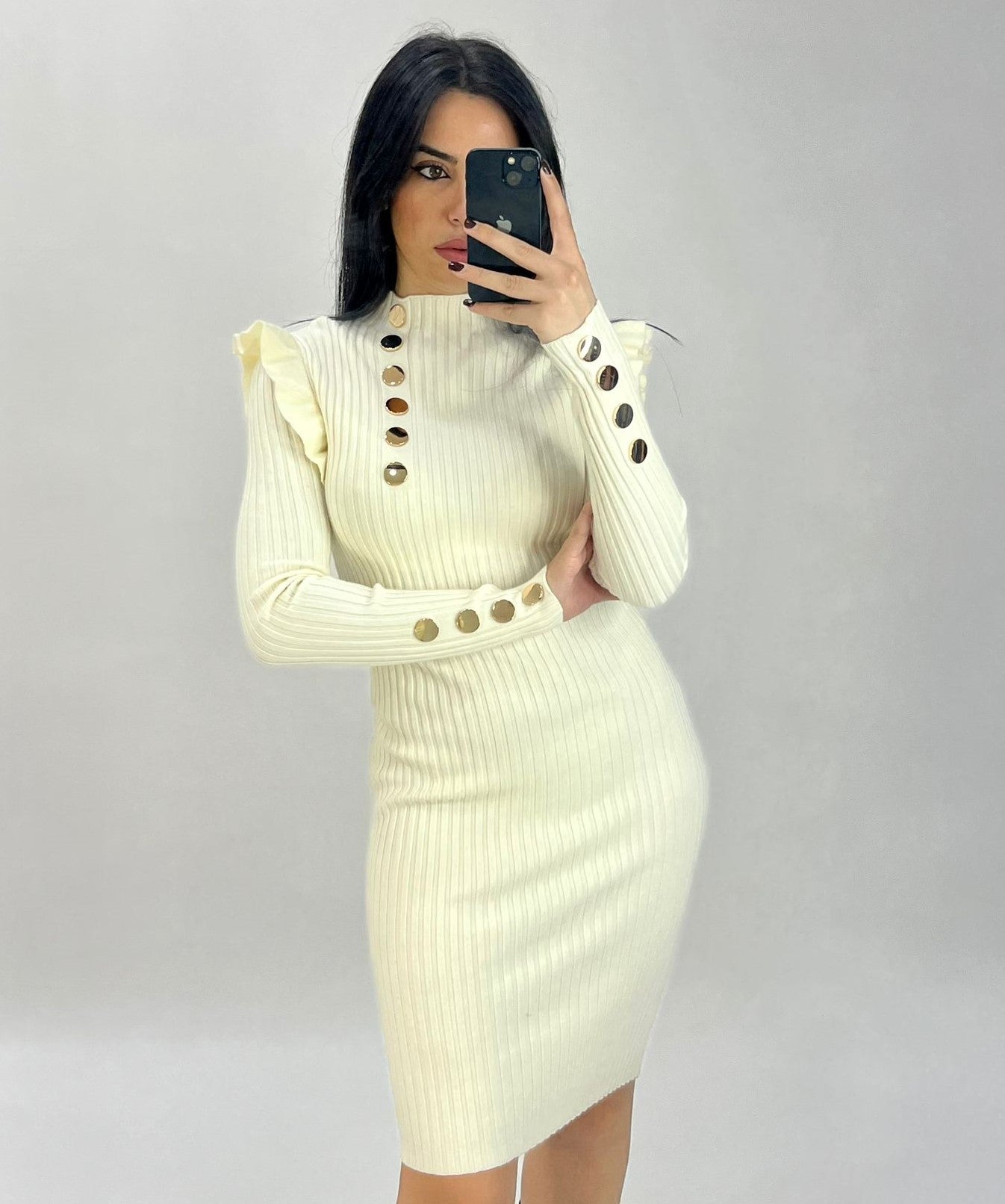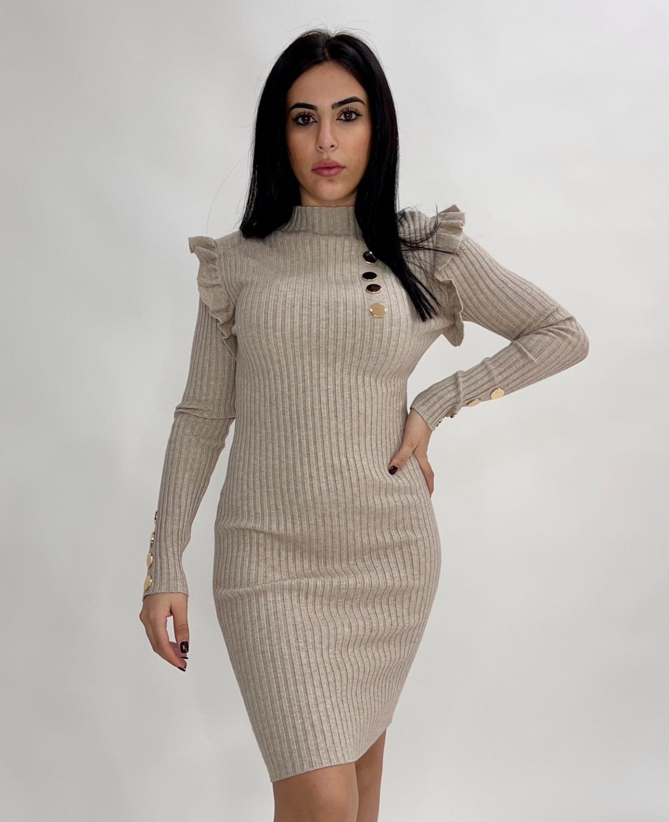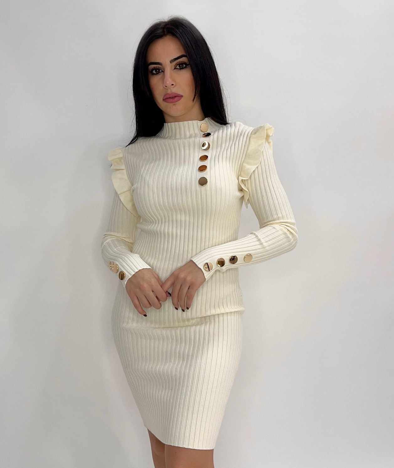 Abito a costine con volant e applicazione di bottoni. Fabbricato in Italia.