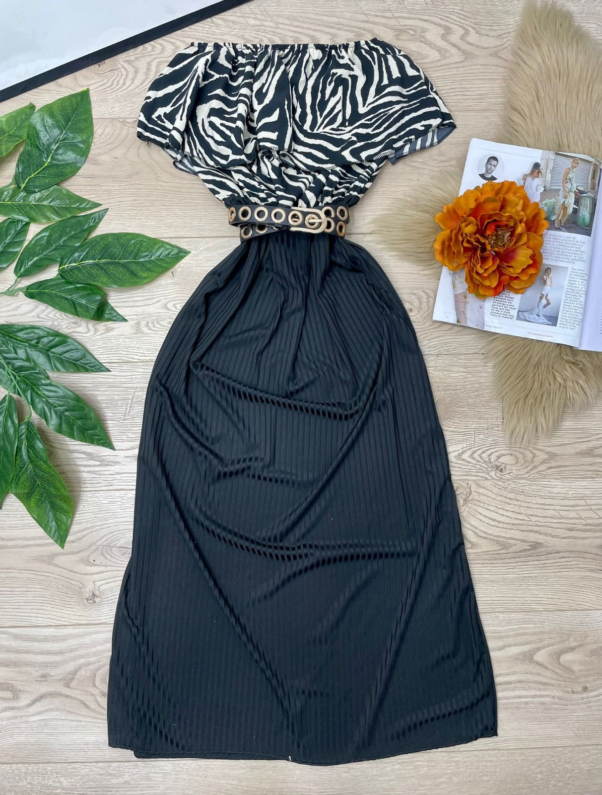 Abito lungo in tessuto strutturato con fantasia animalier, balza ed elastico in vita. Fabbricato in Italia.