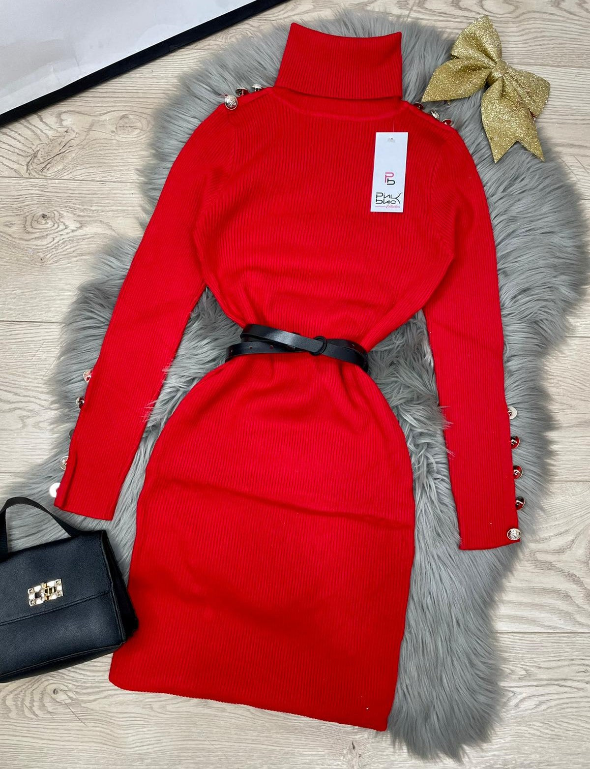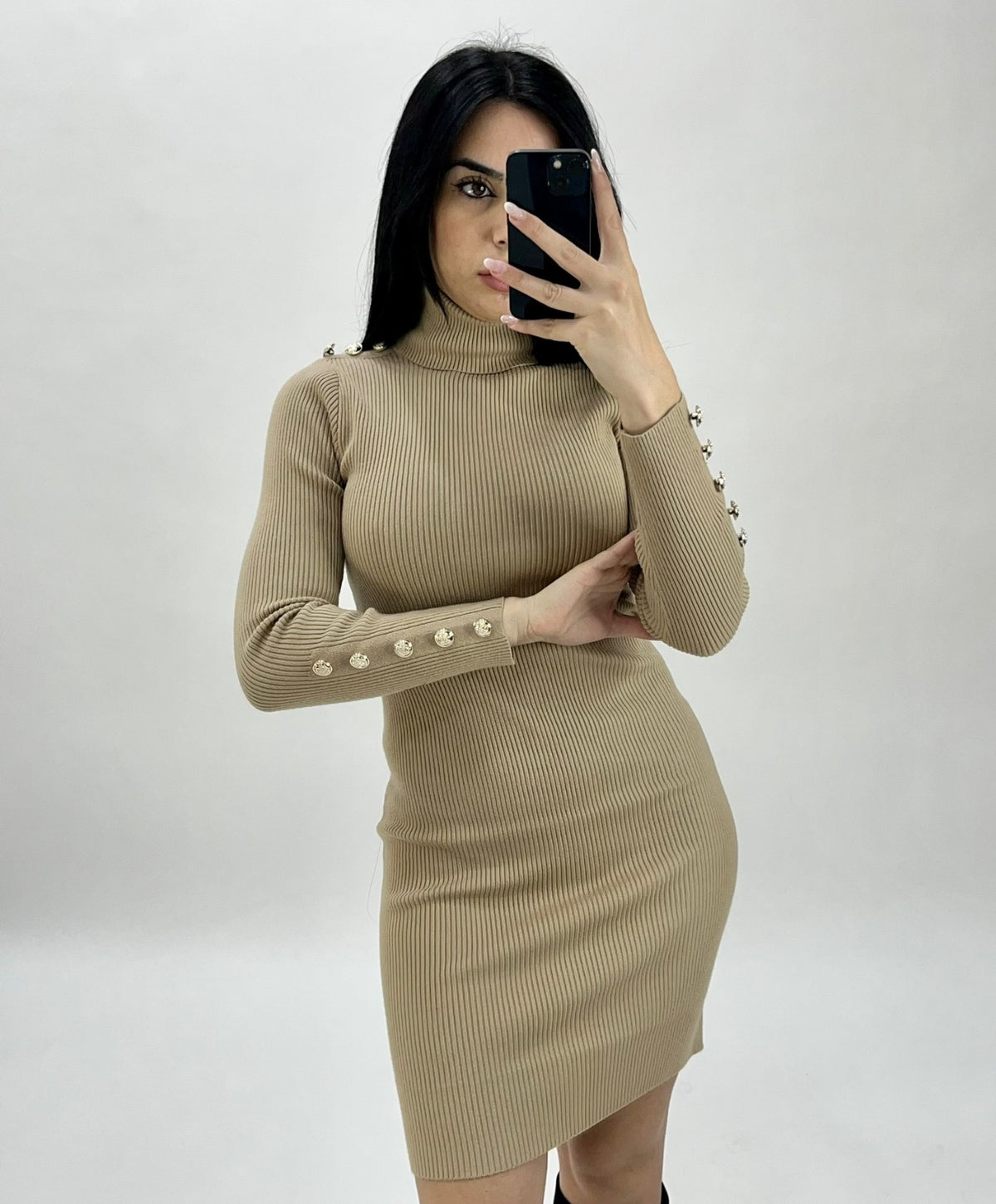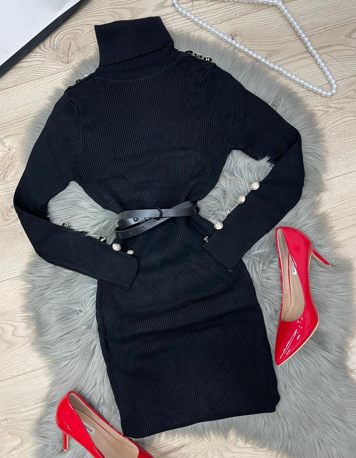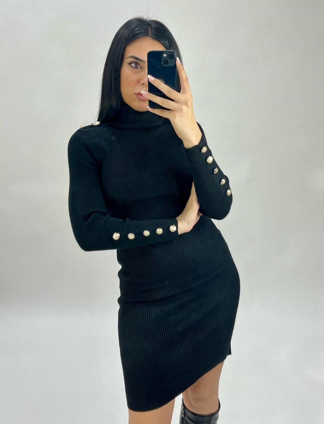 Abito a costine con applicazione di bottoni e collo alto. Fabbricato all'estero.