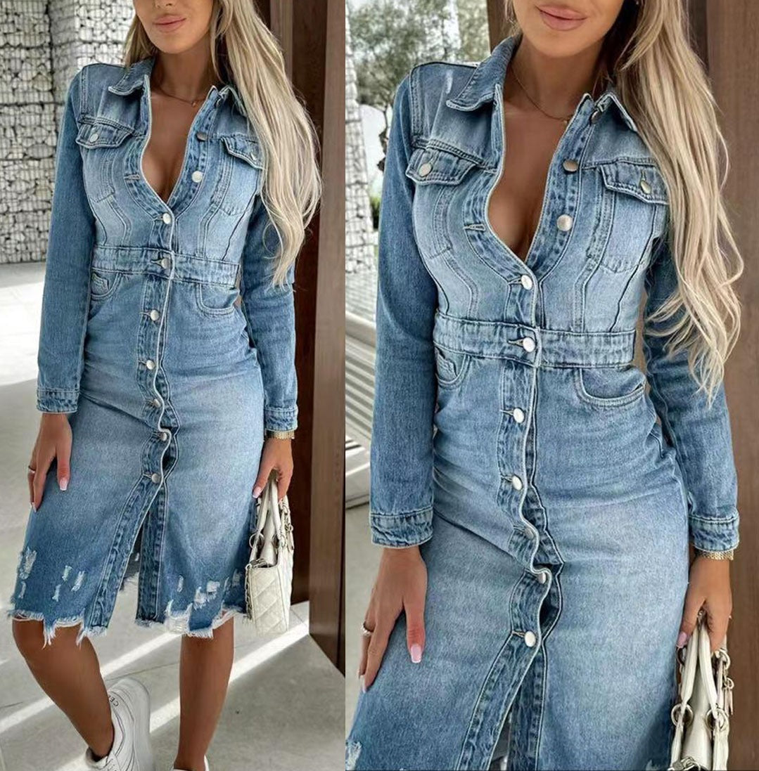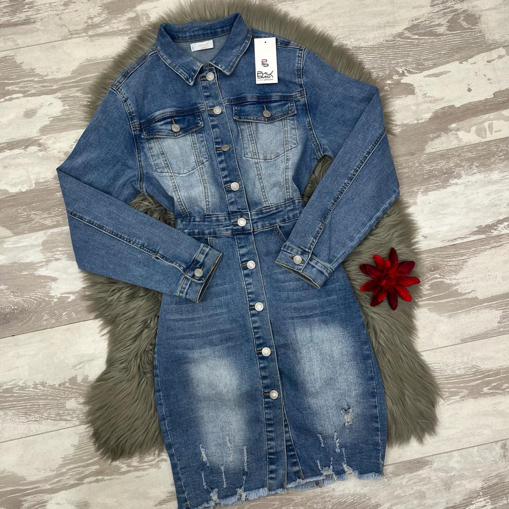 Abito in jeans con bottoni, tasche, elastico in vita e orlo sfilacciato. Fabbricato all'estero.
