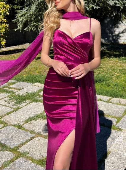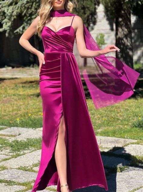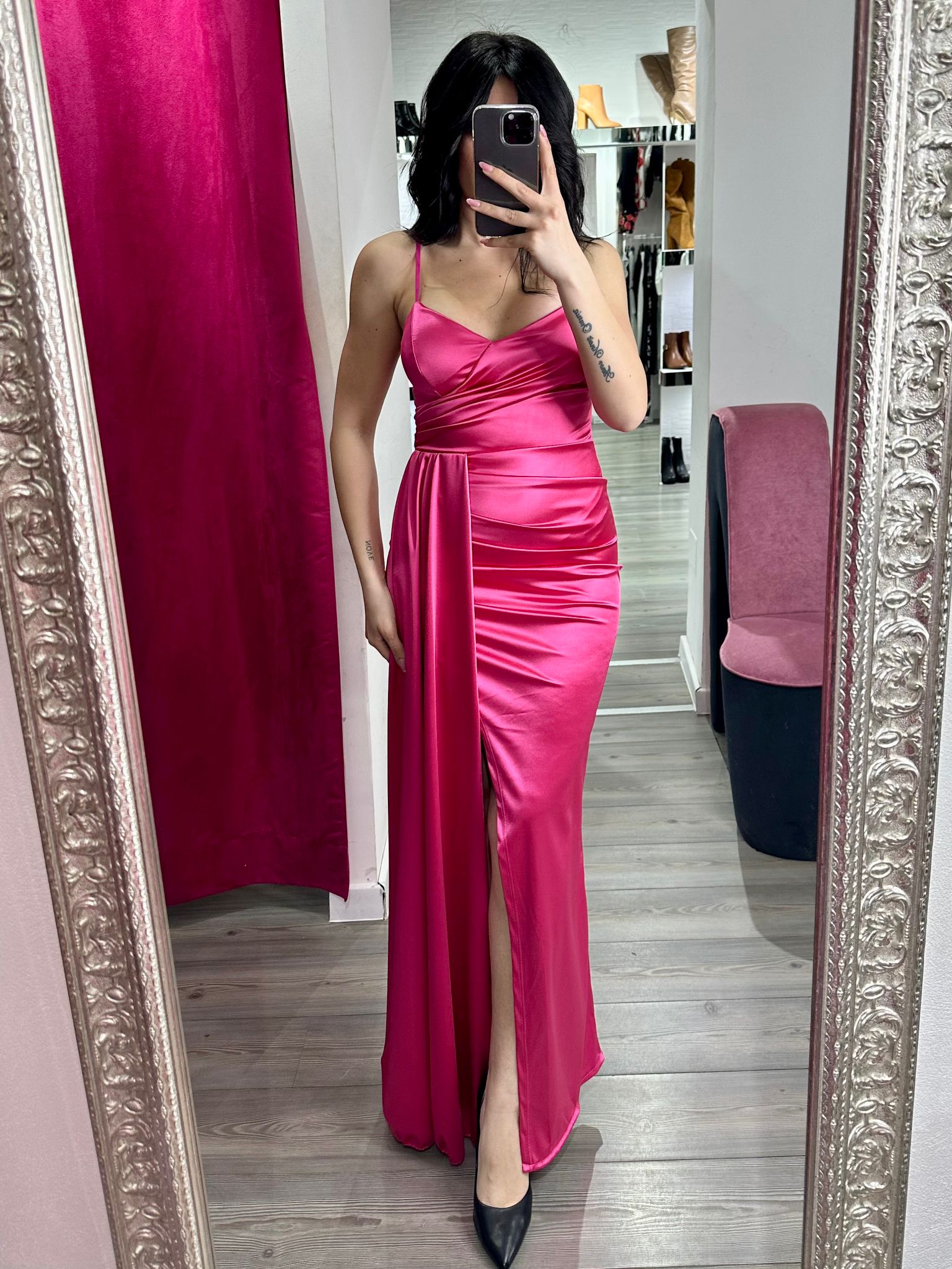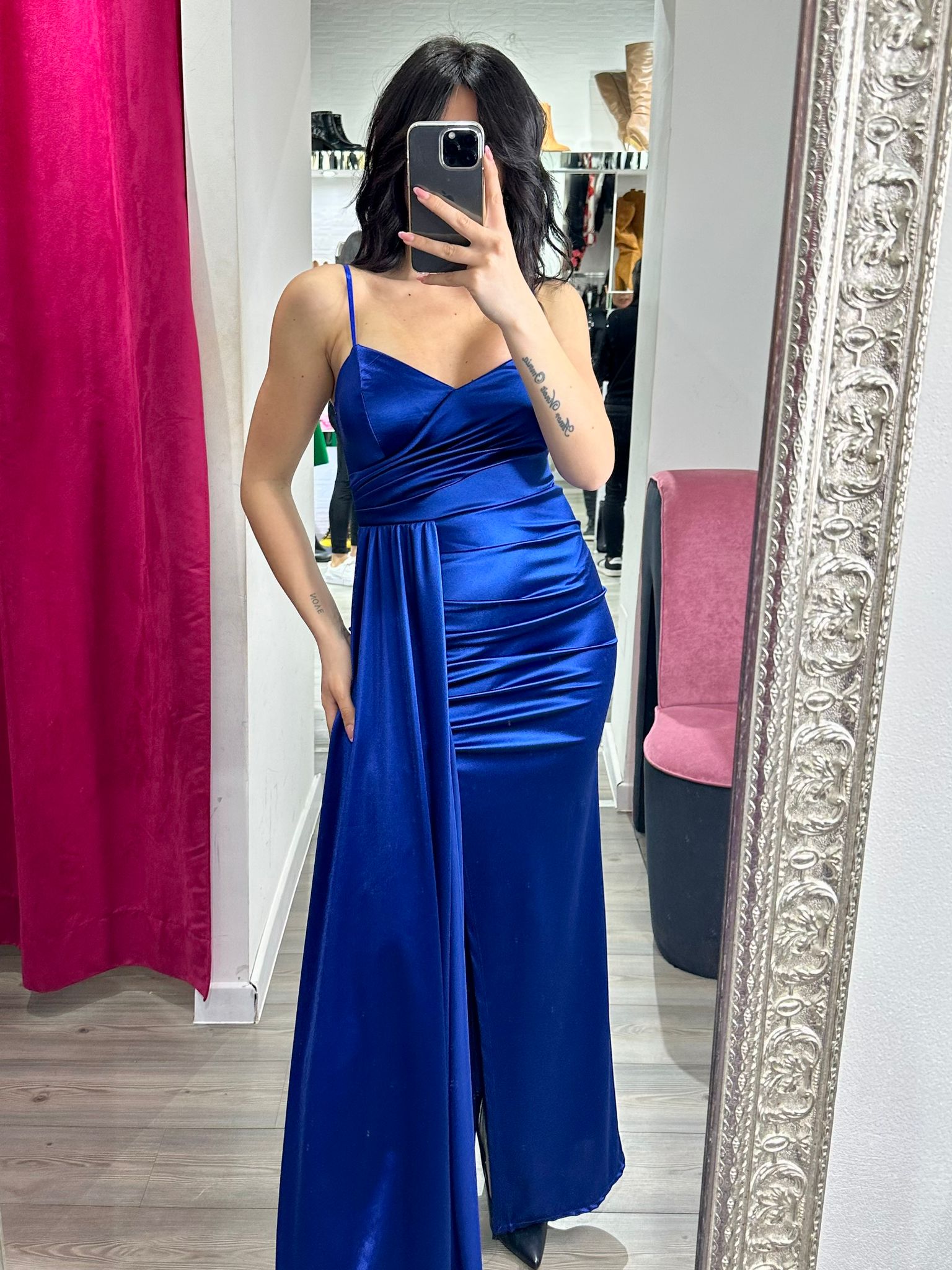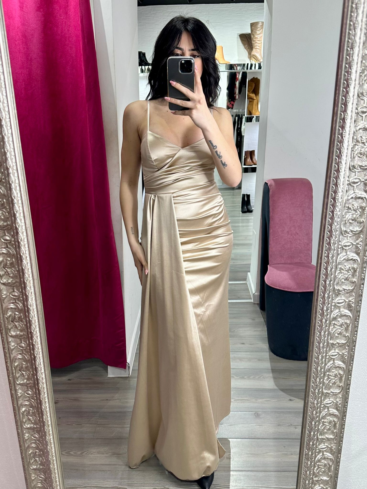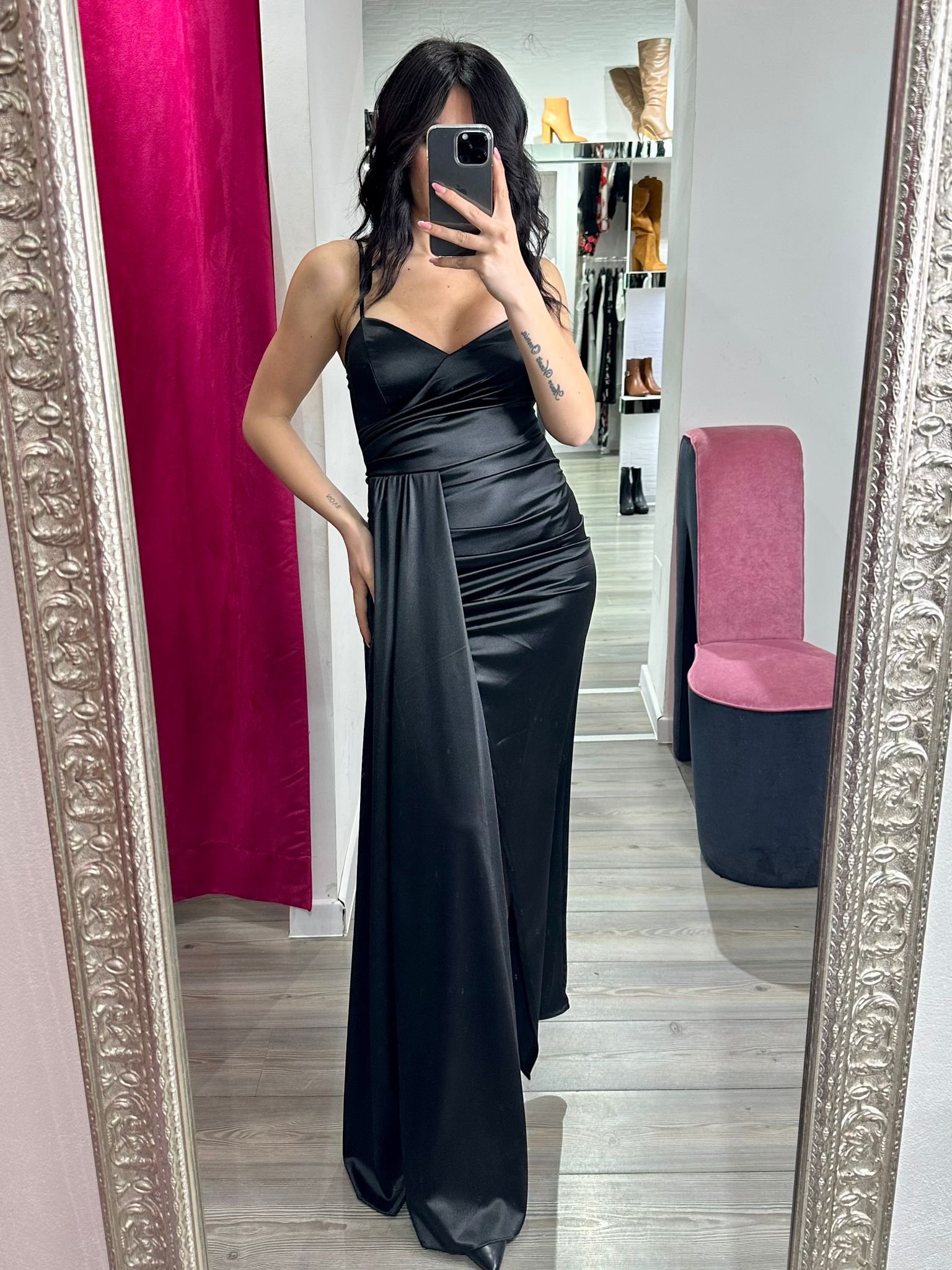 Abito lungo in raso con coppe preformate, spalline regolabli, gonna con drappeggio, spacco laterale e chiusura con cerniera. Fabbricato in Italia.