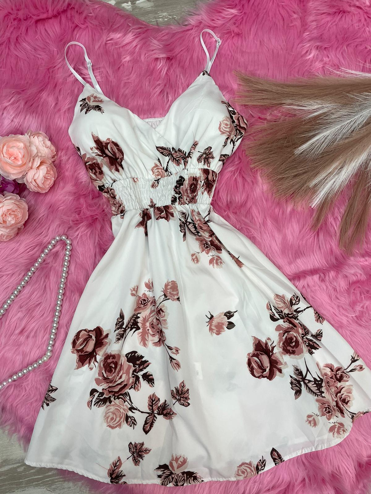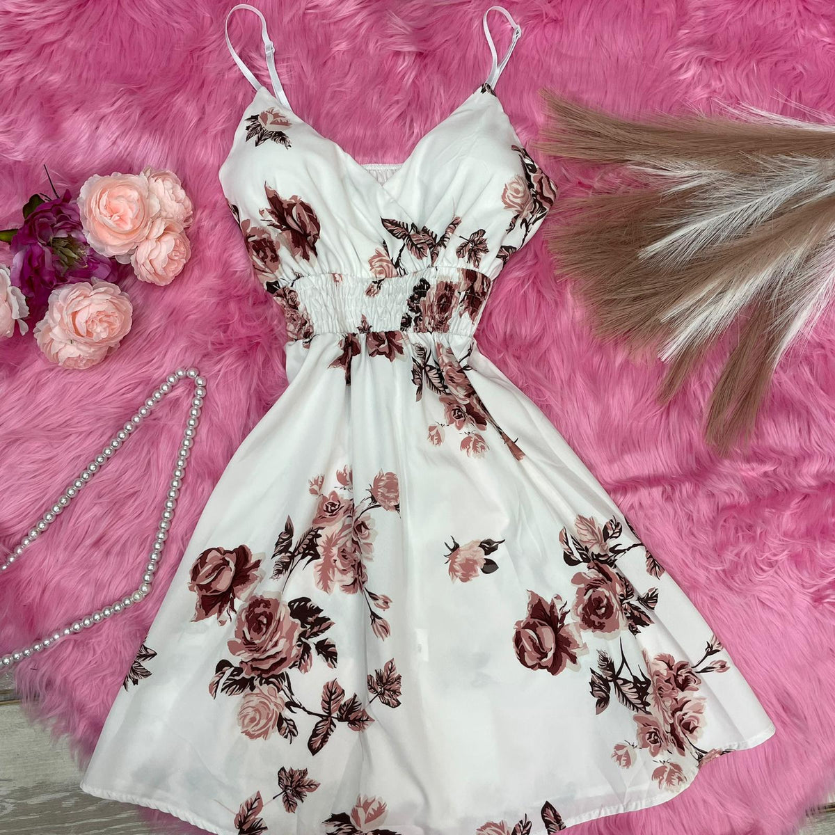 Abito con fantasia floreale in leggero tessuto strutturato con spalline regolabili ed elastico in vita Fabbricato in Italia.