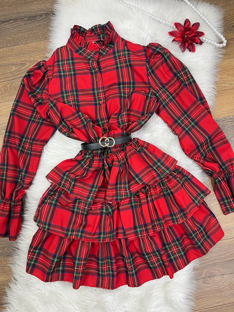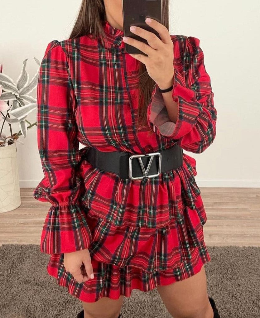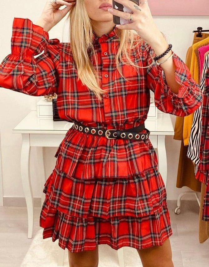 Abito in tessuto strutturato con fantasia scozzese, bottoni, elastico in vita e gonna con balze. Fabbricato in Italia.