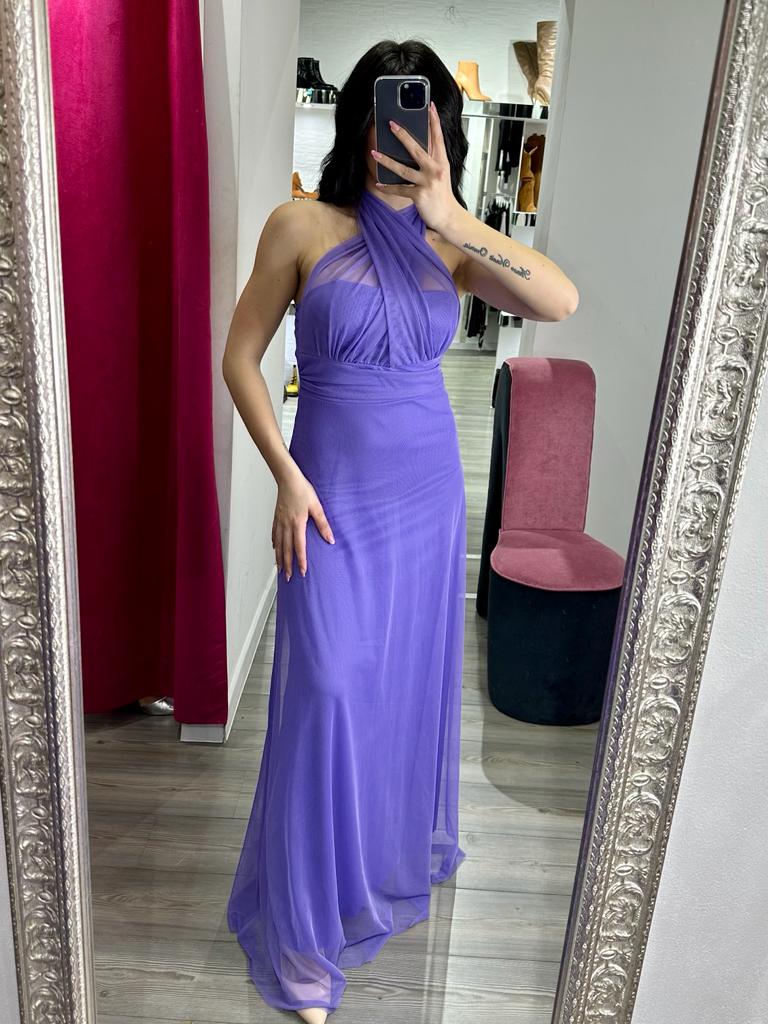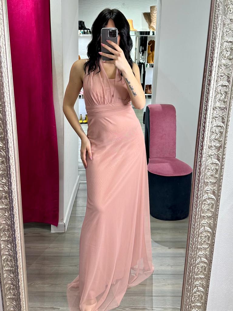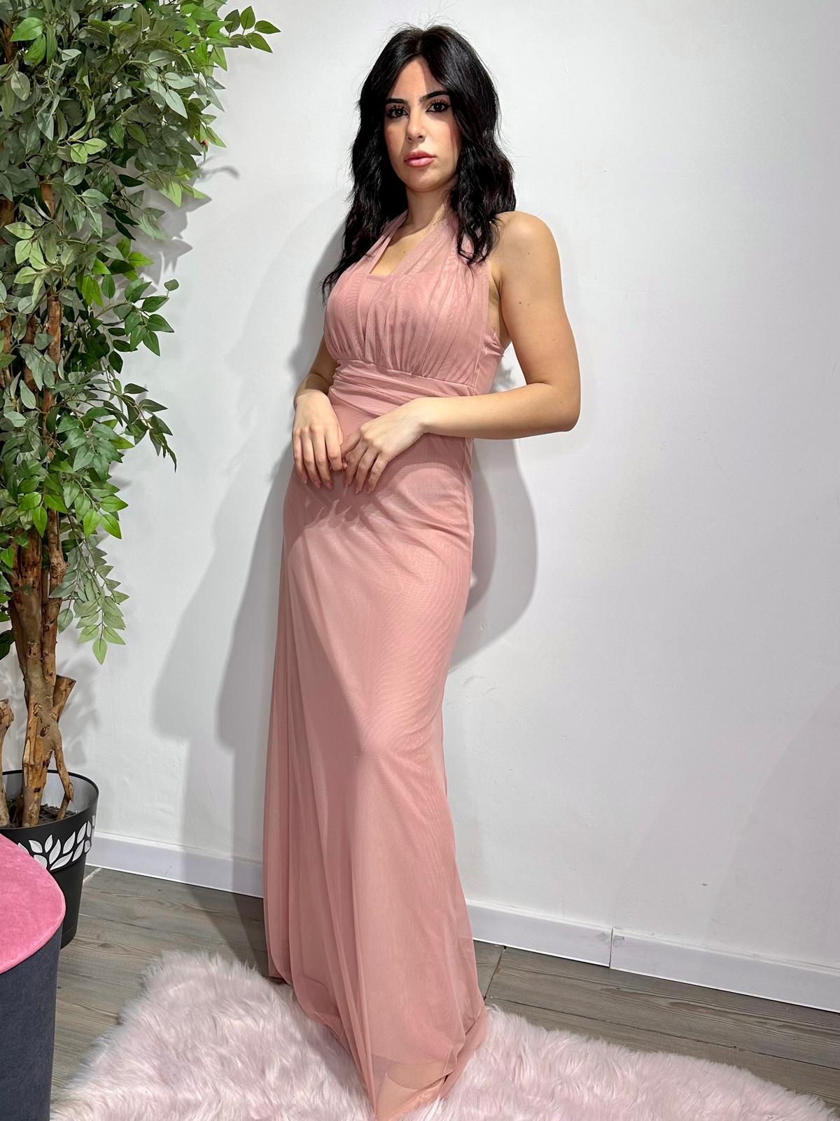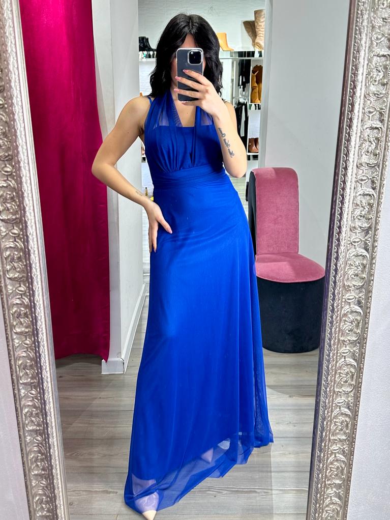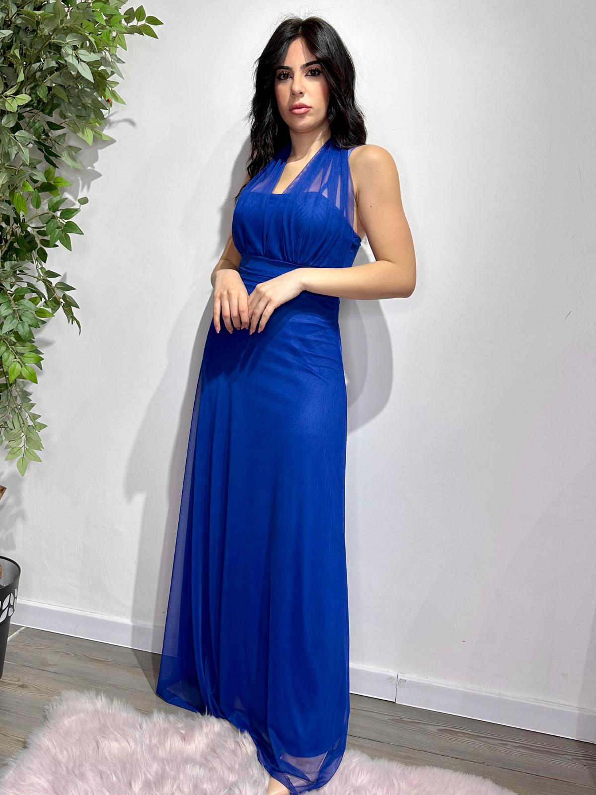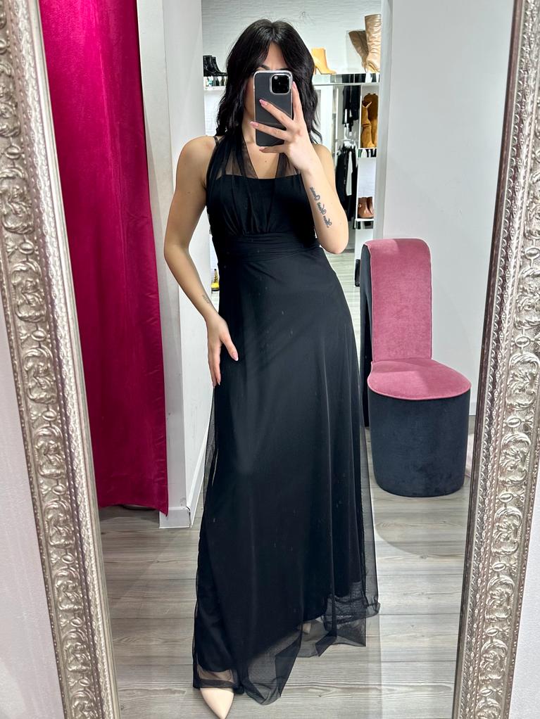 Abito lungo lavorato su maglia elasticizzata con velo di tulle, coppe preformate, allacciatura al collo ed elastico in vita. Fabbricato in Italia.