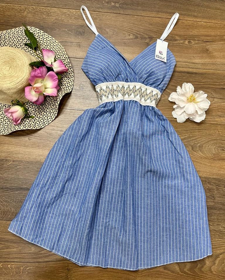 Abito in cotone con design a righe, coppe preformate, fascia elastica sul retro e ricamo. Fabbricato in Italia.