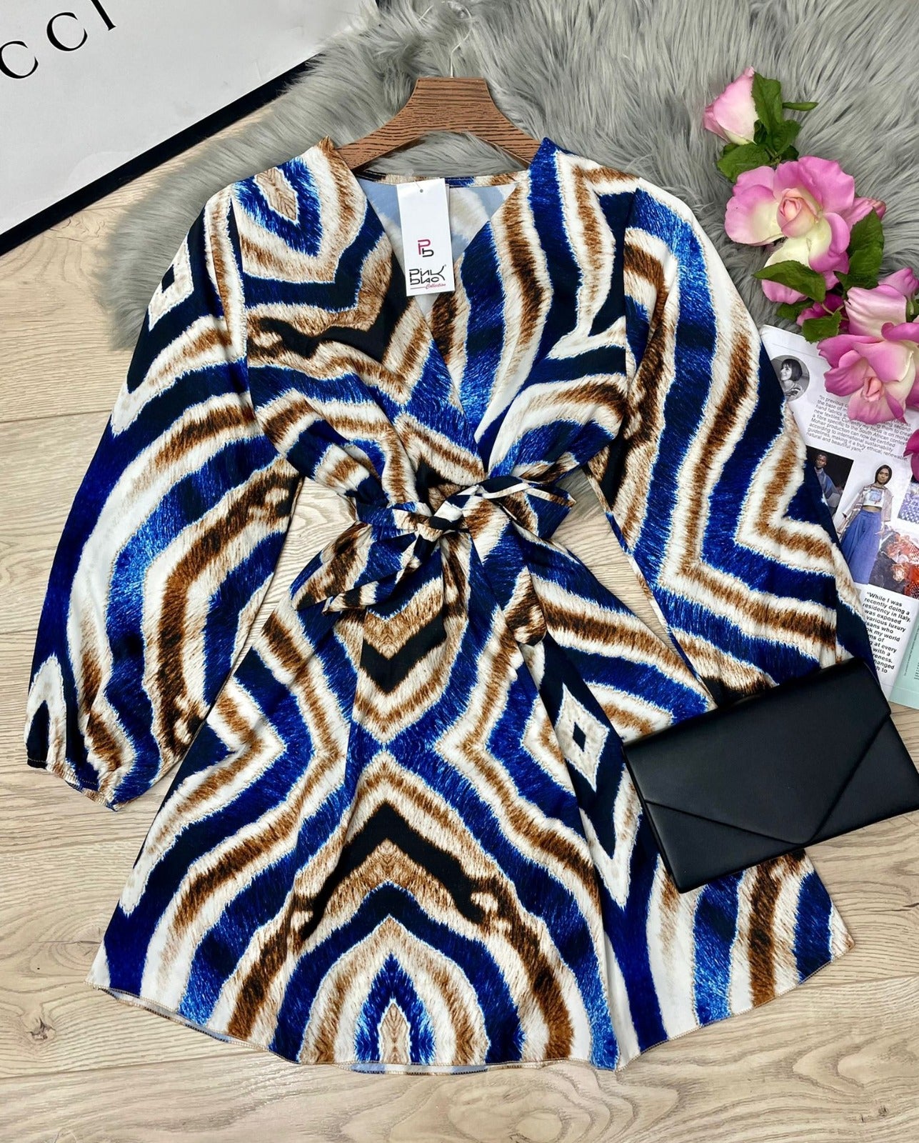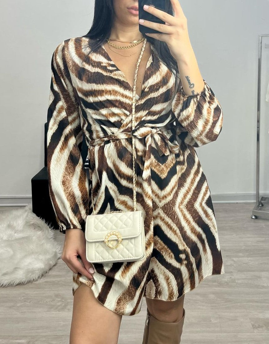Abito in tessuto strutturato con fantasia astratta, elastico in vita e cintura inclusa. Fabbricato in Italia.