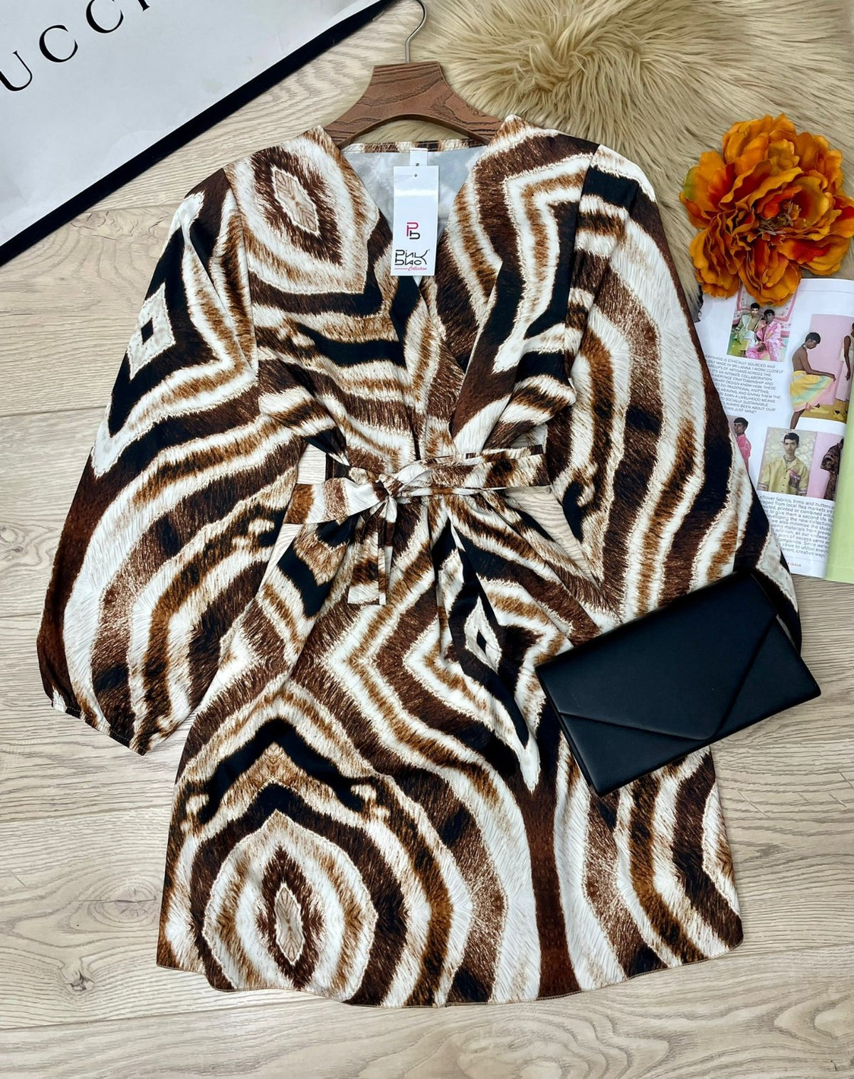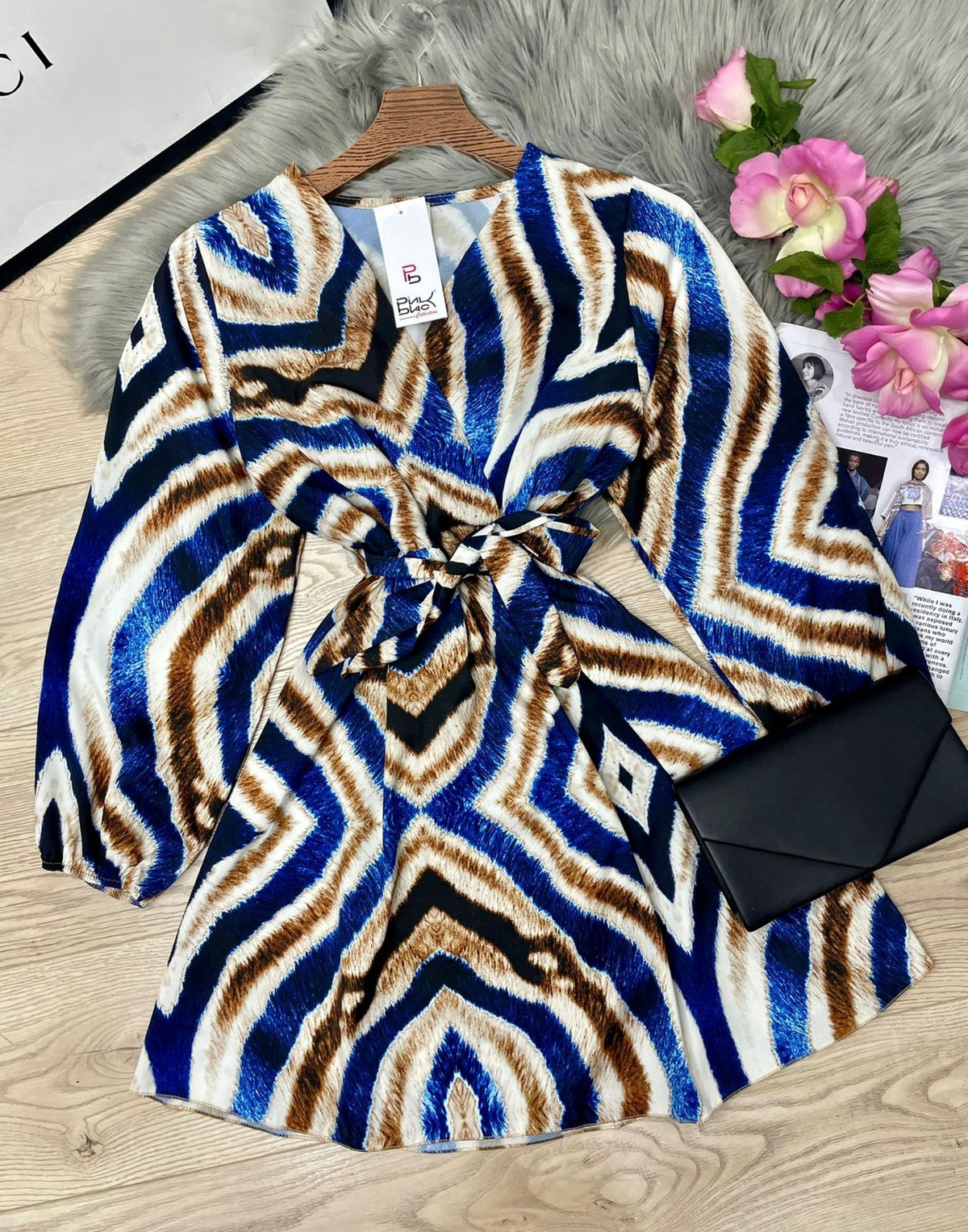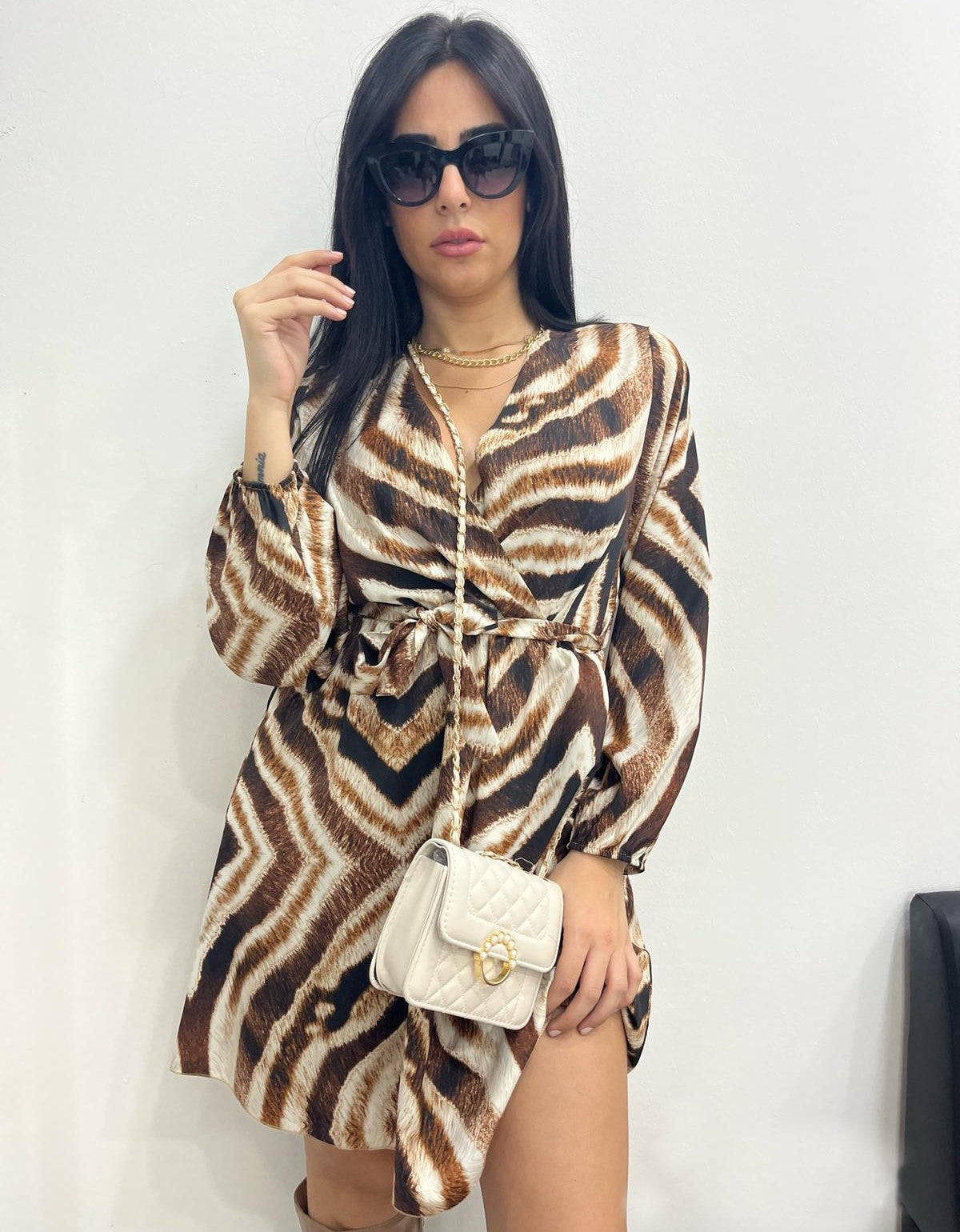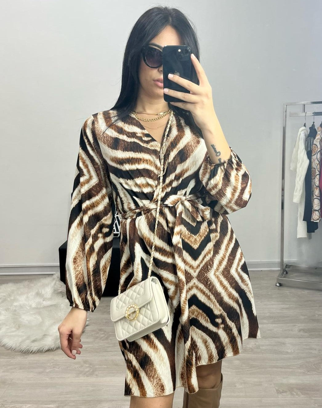 Abito in tessuto strutturato con fantasia astratta, elastico in vita e cintura inclusa. Fabbricato in Italia.