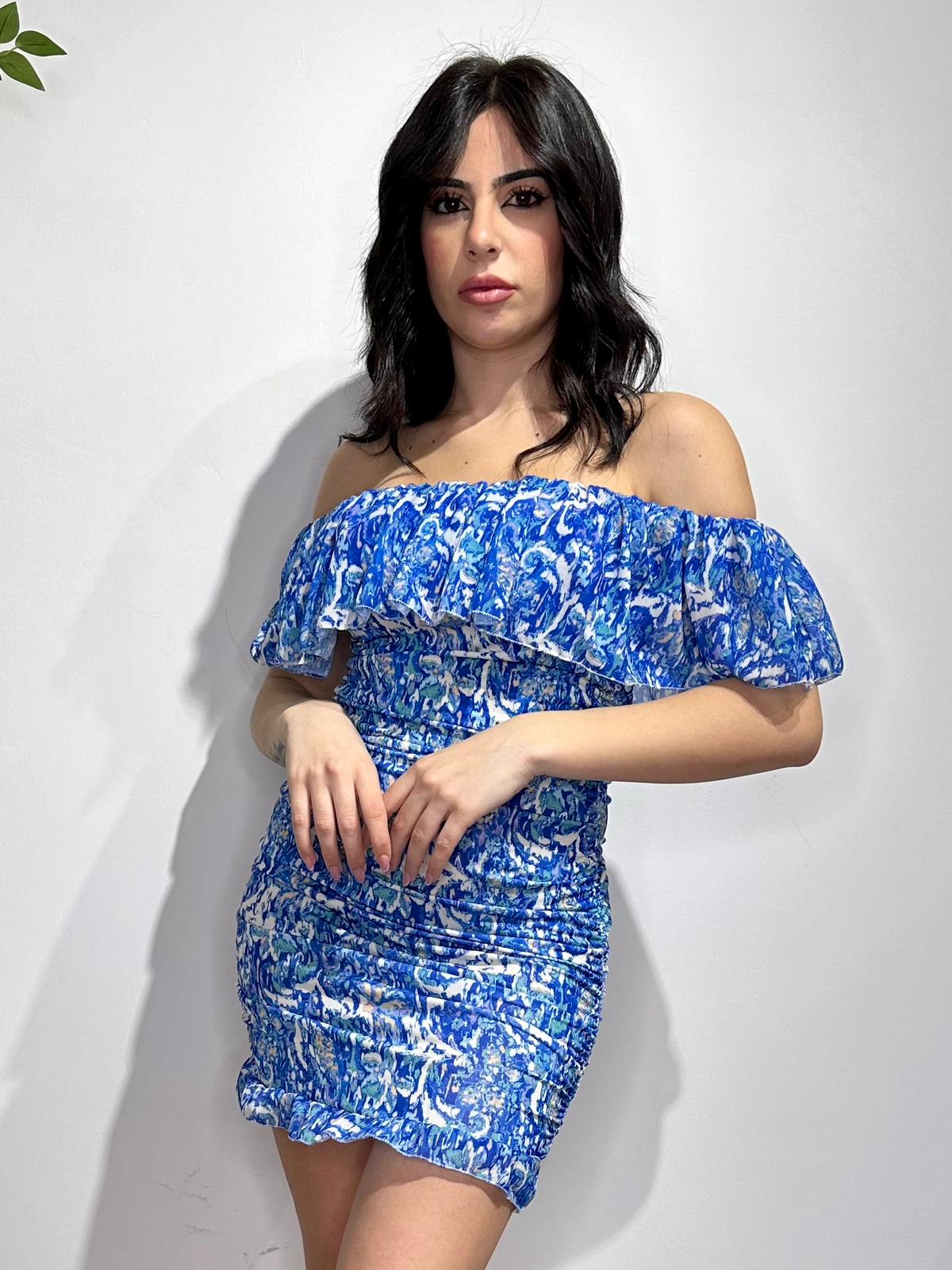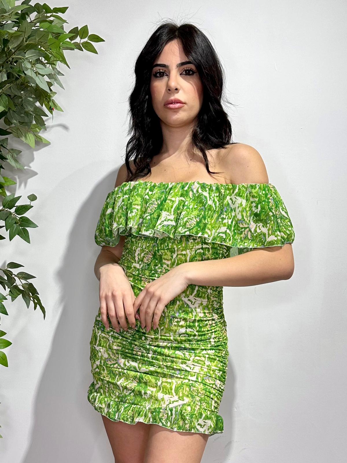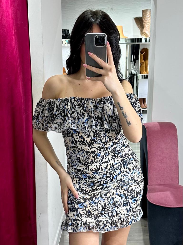 Abito in tessuto strutturato con fantasia astratta e scollo a barca. Fabbricato in Italia.