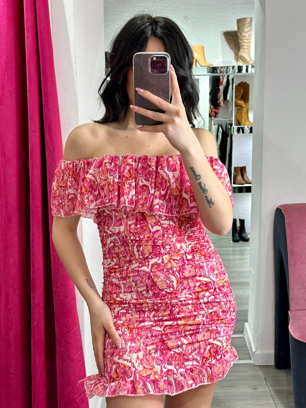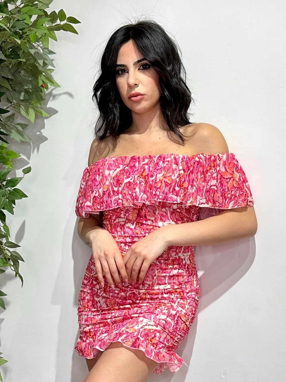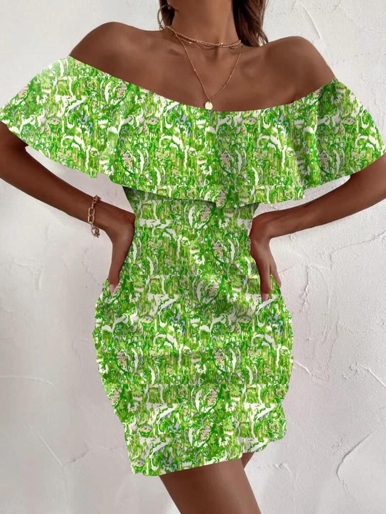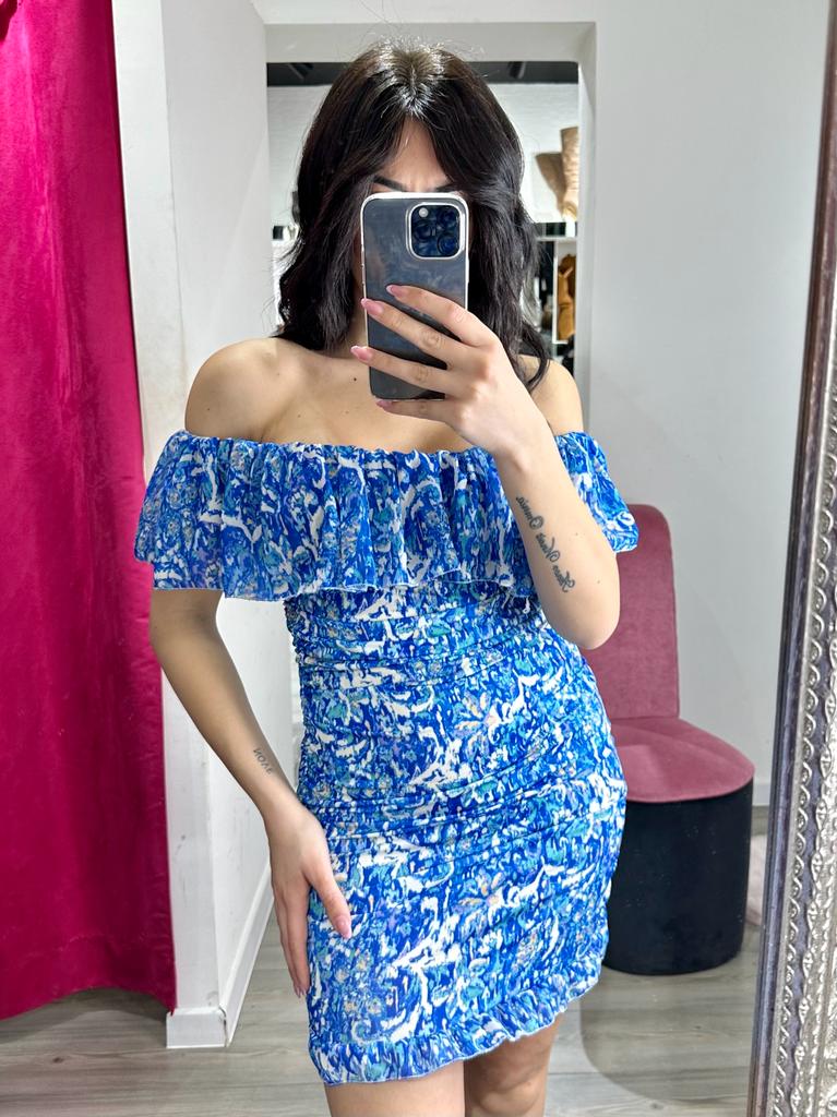 Abito in tessuto strutturato con fantasia astratta e scollo a barca. Fabbricato in Italia.