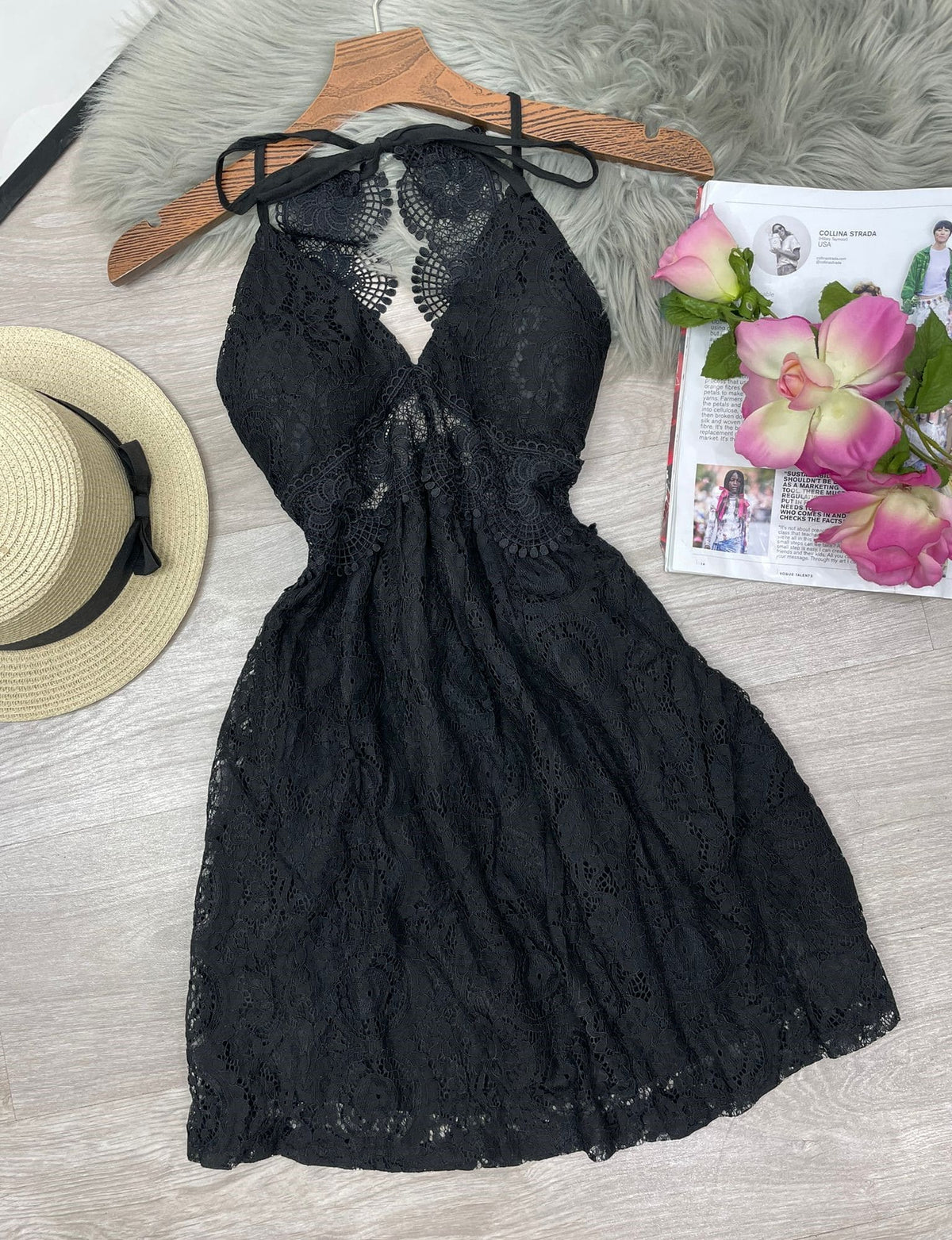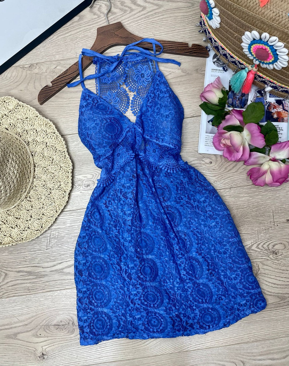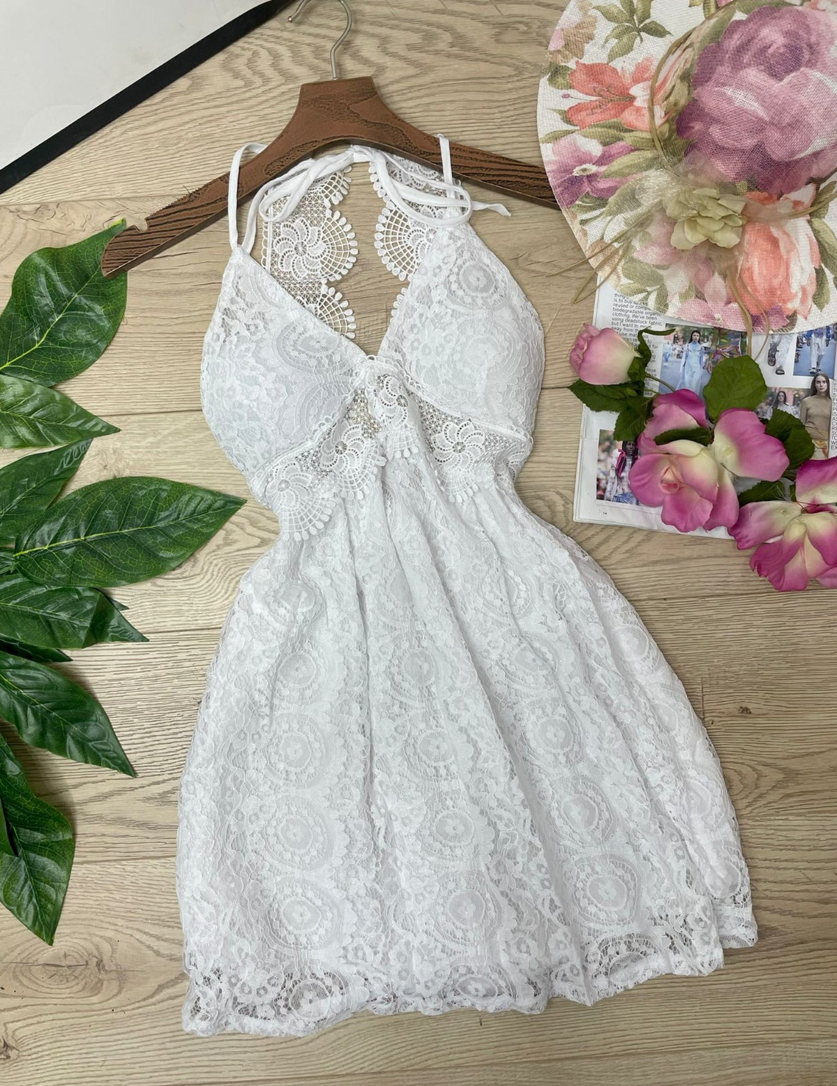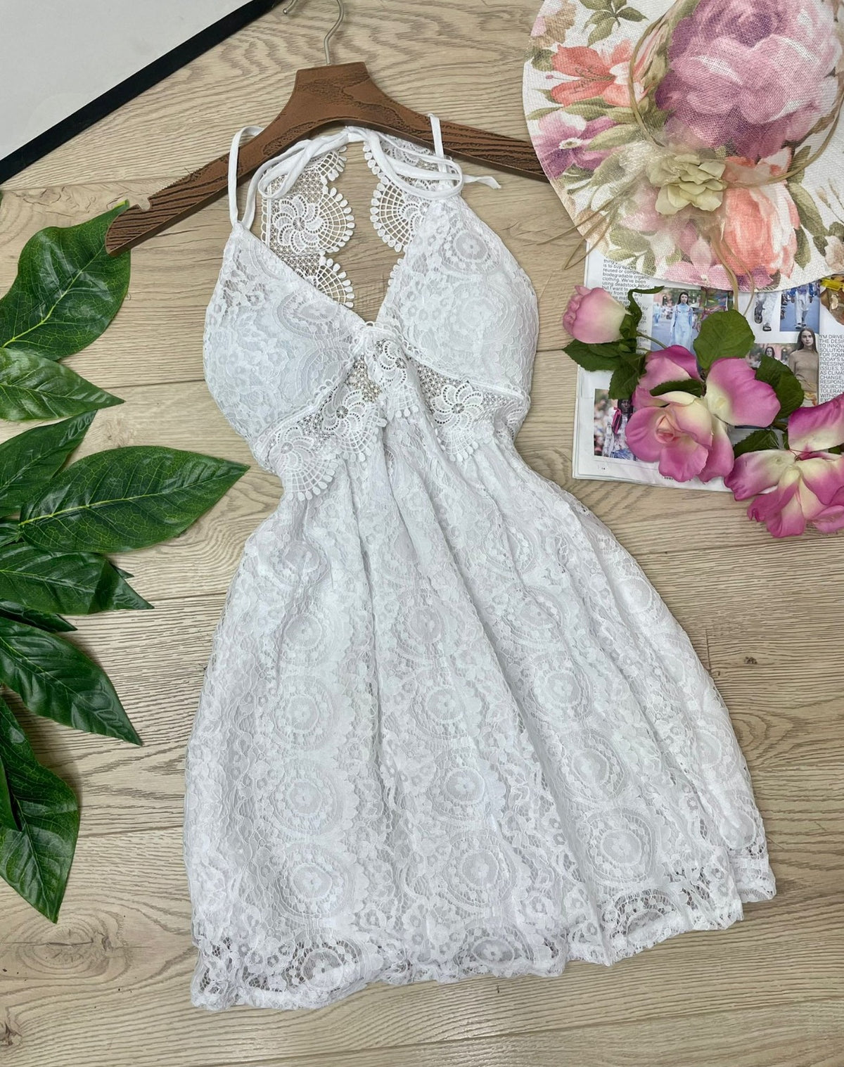 Abito con ricamo in pizzo e macramè, allacciatura al collo, scollatura sulla schiena ed elastico sul retro. Fabbricato in Italia.