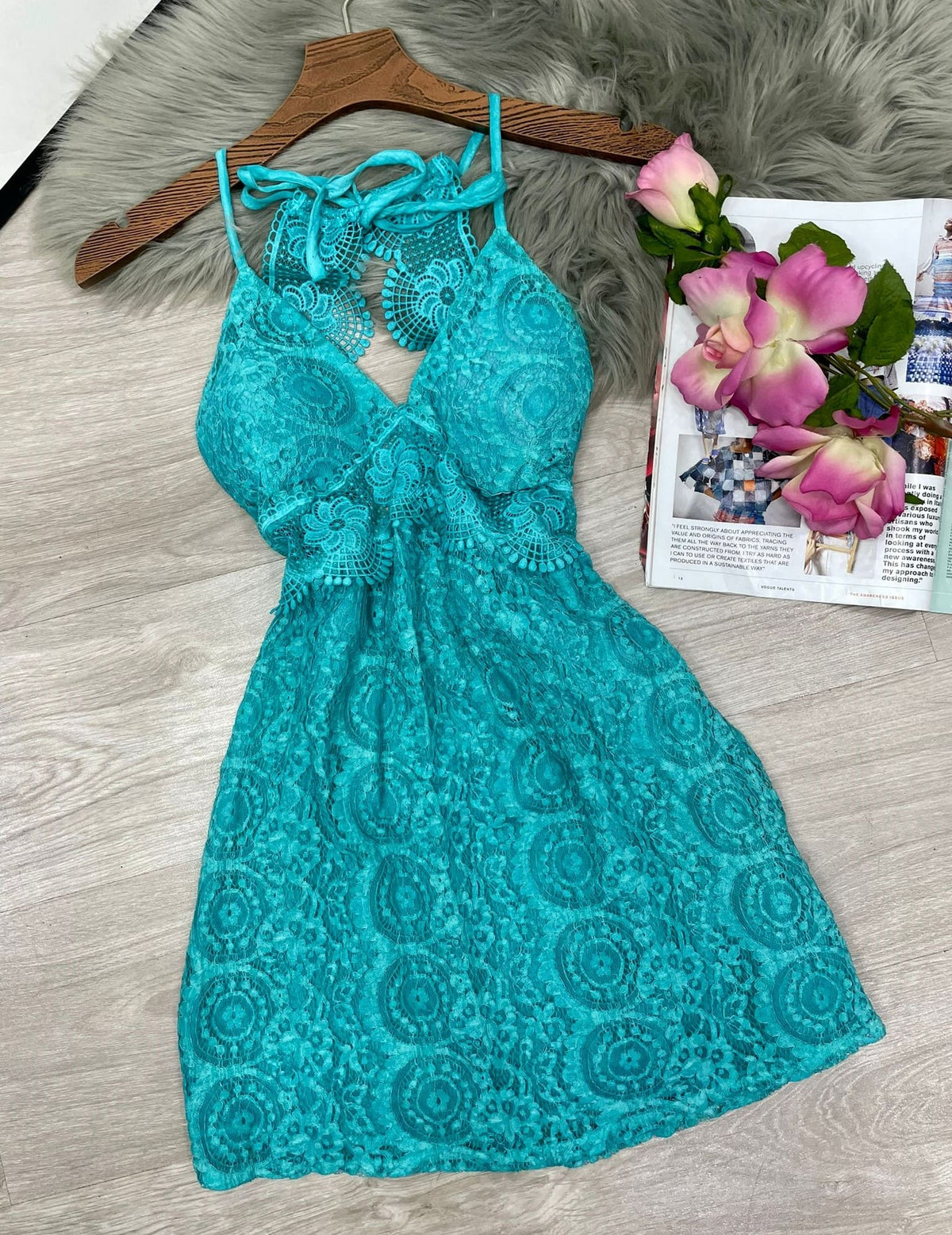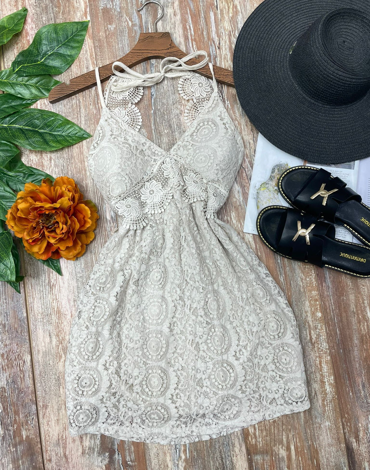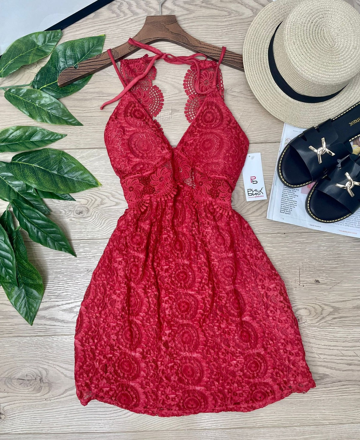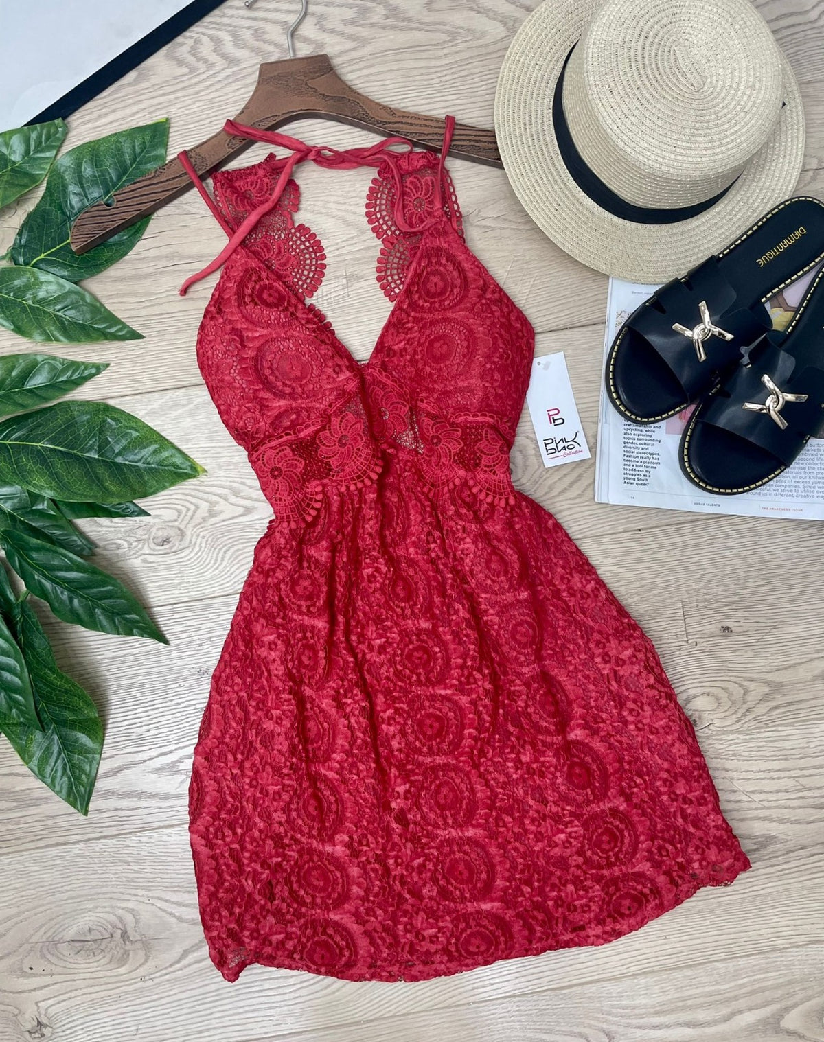 Abito con ricamo in pizzo e macramè, allacciatura al collo, scollatura sulla schiena ed elastico sul retro. Fabbricato in Italia.