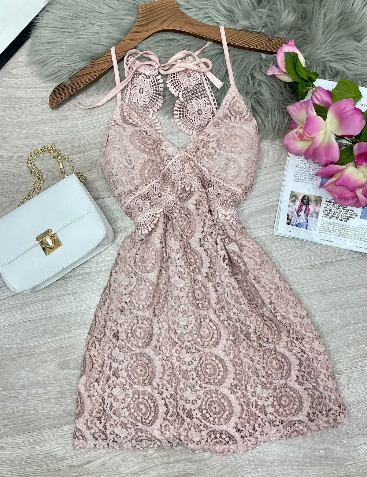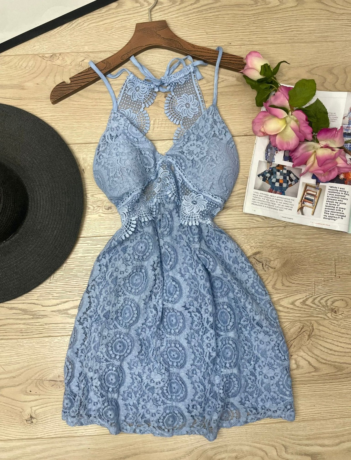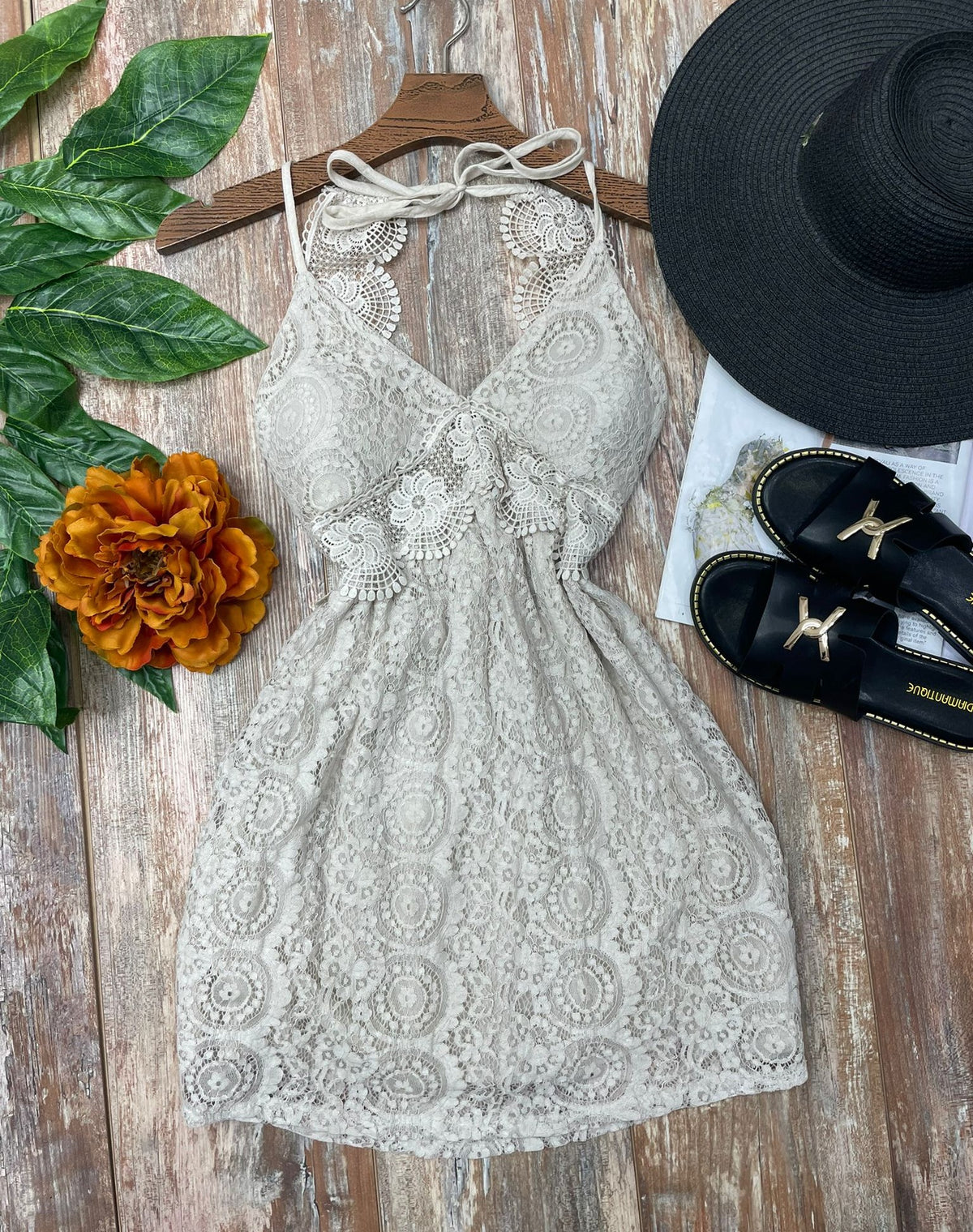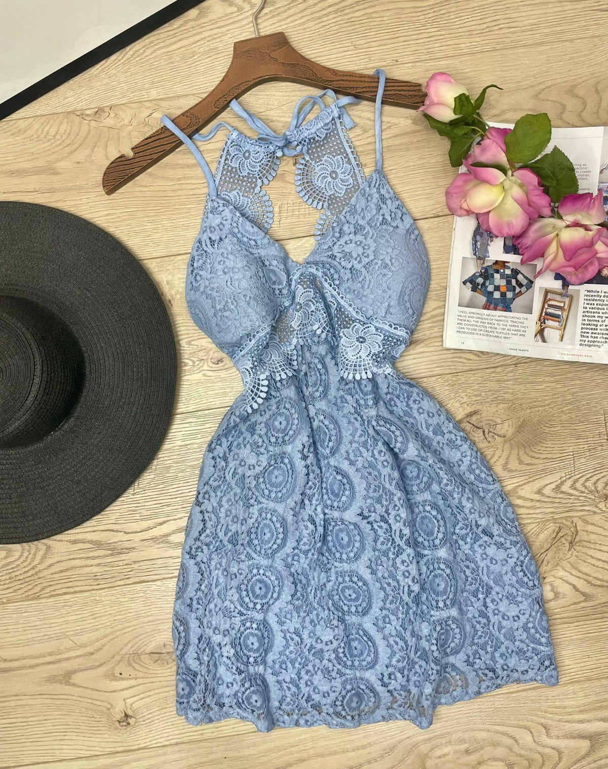 Abito con ricamo in pizzo e macramè, allacciatura al collo, scollatura sulla schiena ed elastico sul retro. Fabbricato in Italia.