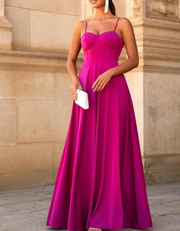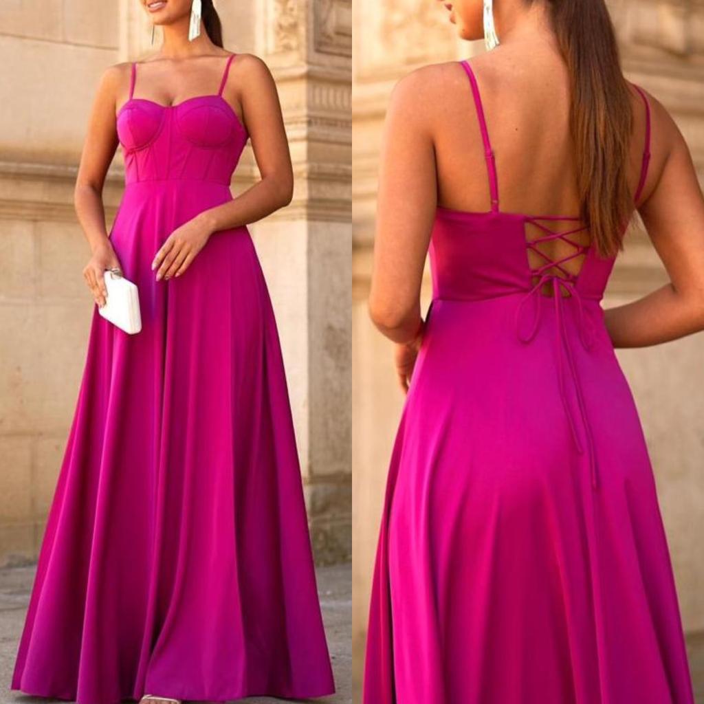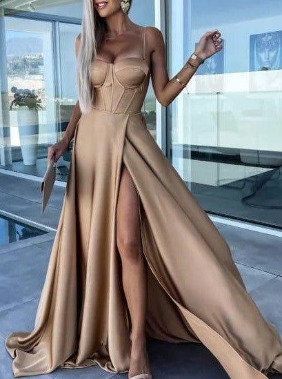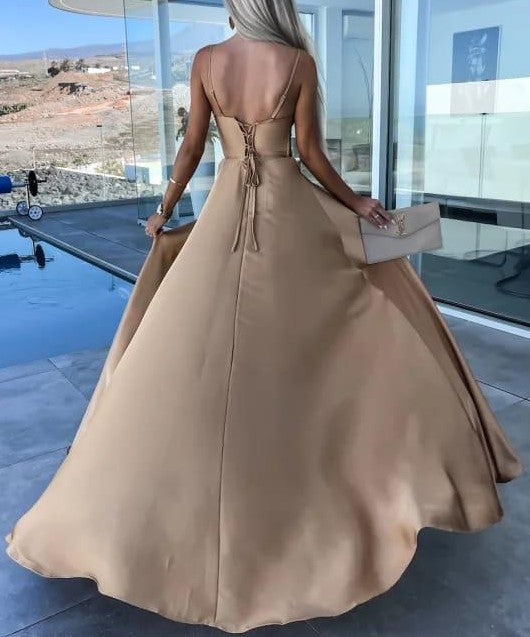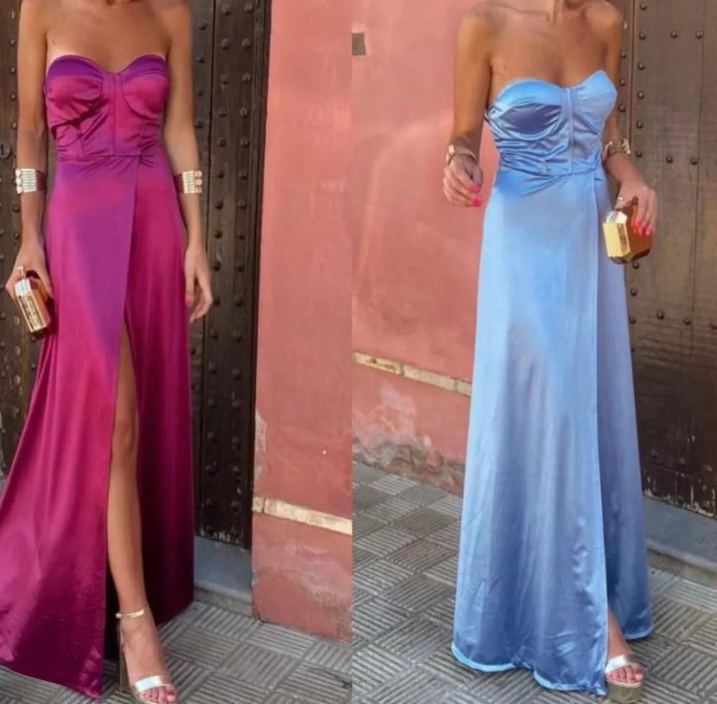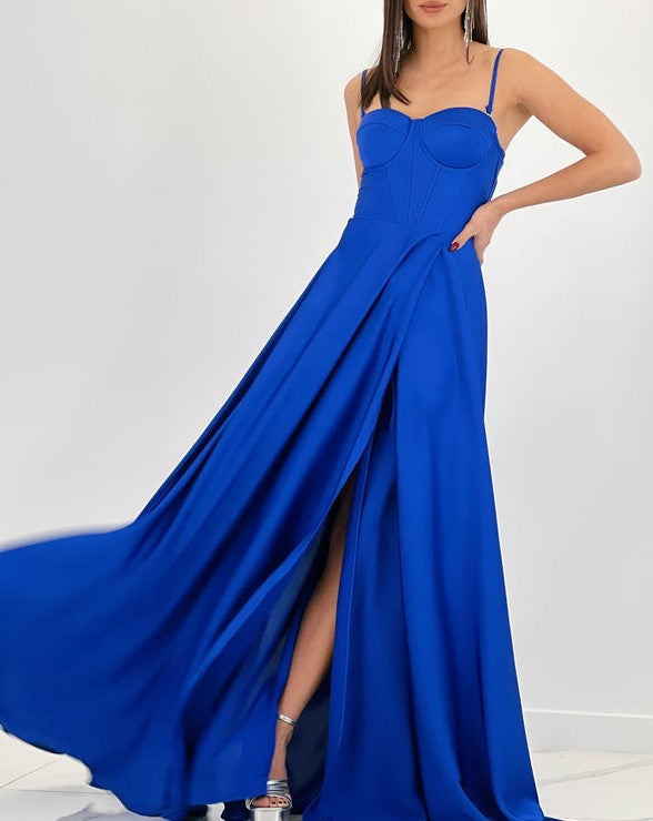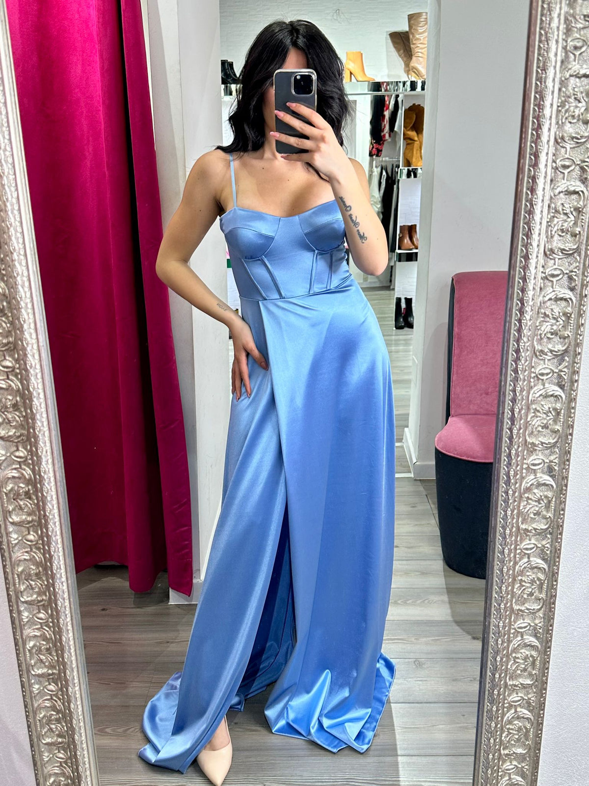Abito lungo in raso con coppe preformate, spalline regolabli, nastro di legatura sul retro e gonna a portafoglio con spacco. Fabbricato in Italia.