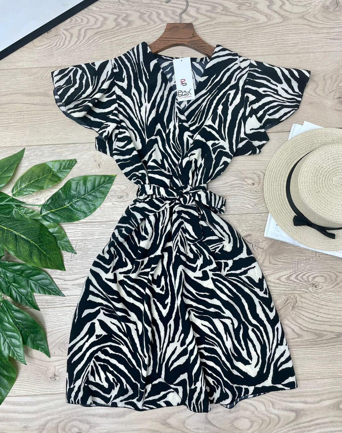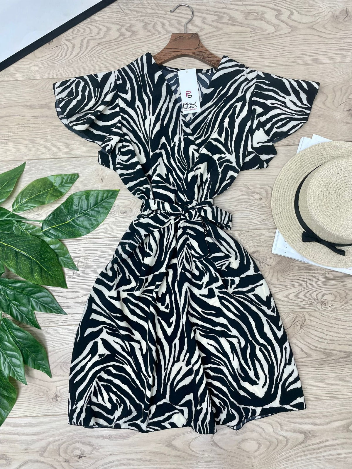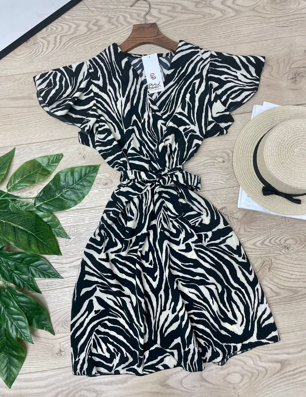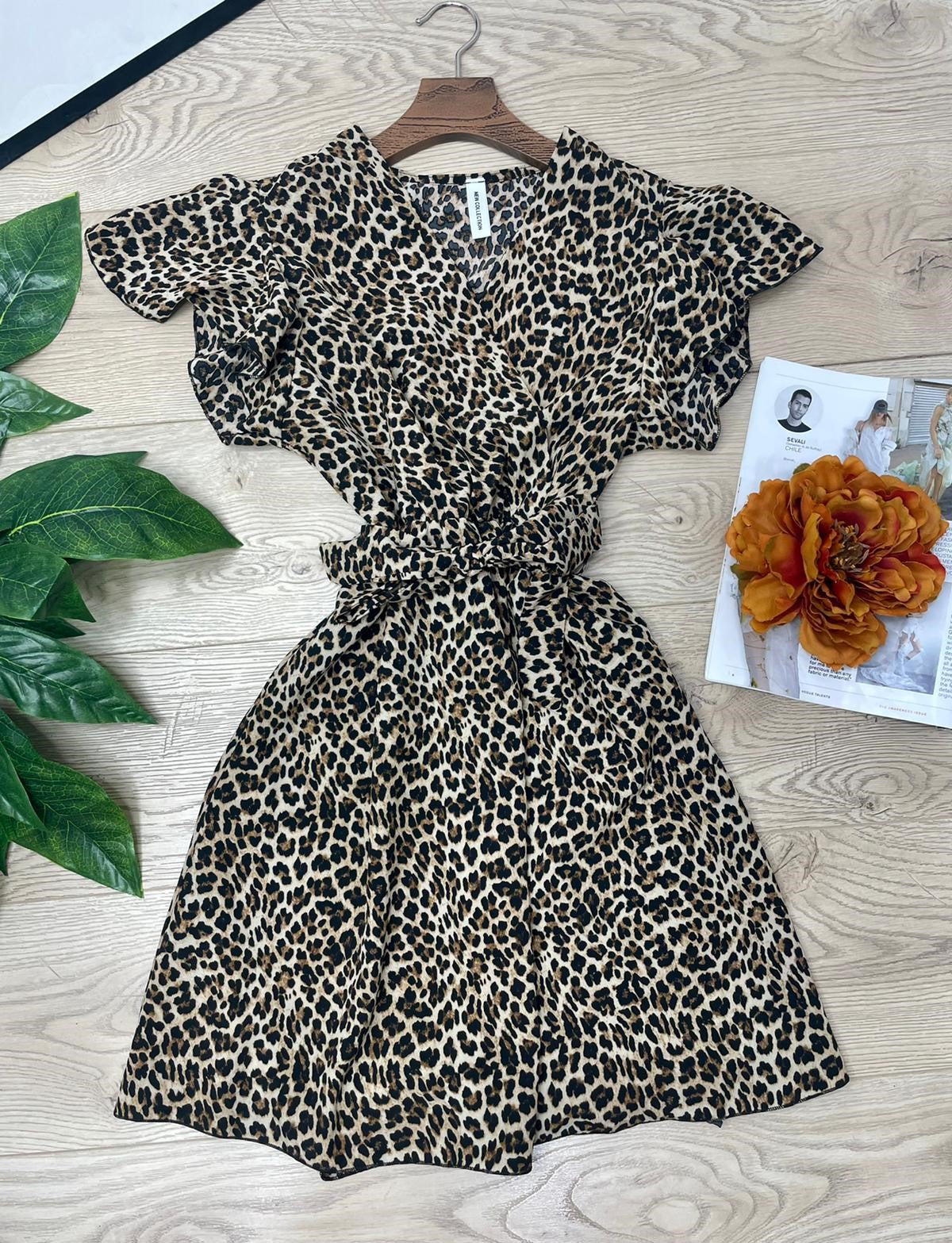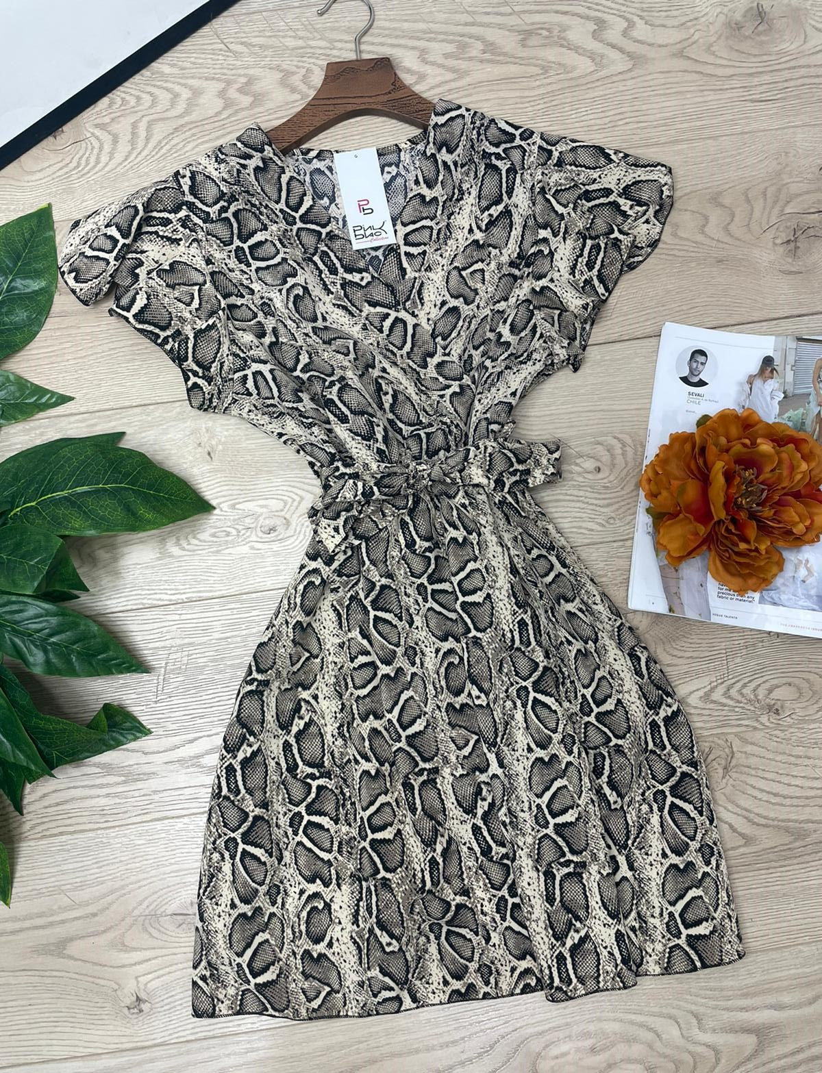 Abito in leggero tessuto strutturato con fantasia animalier, elastico in vita e cintura inclusa. Fabbricato in Italia.