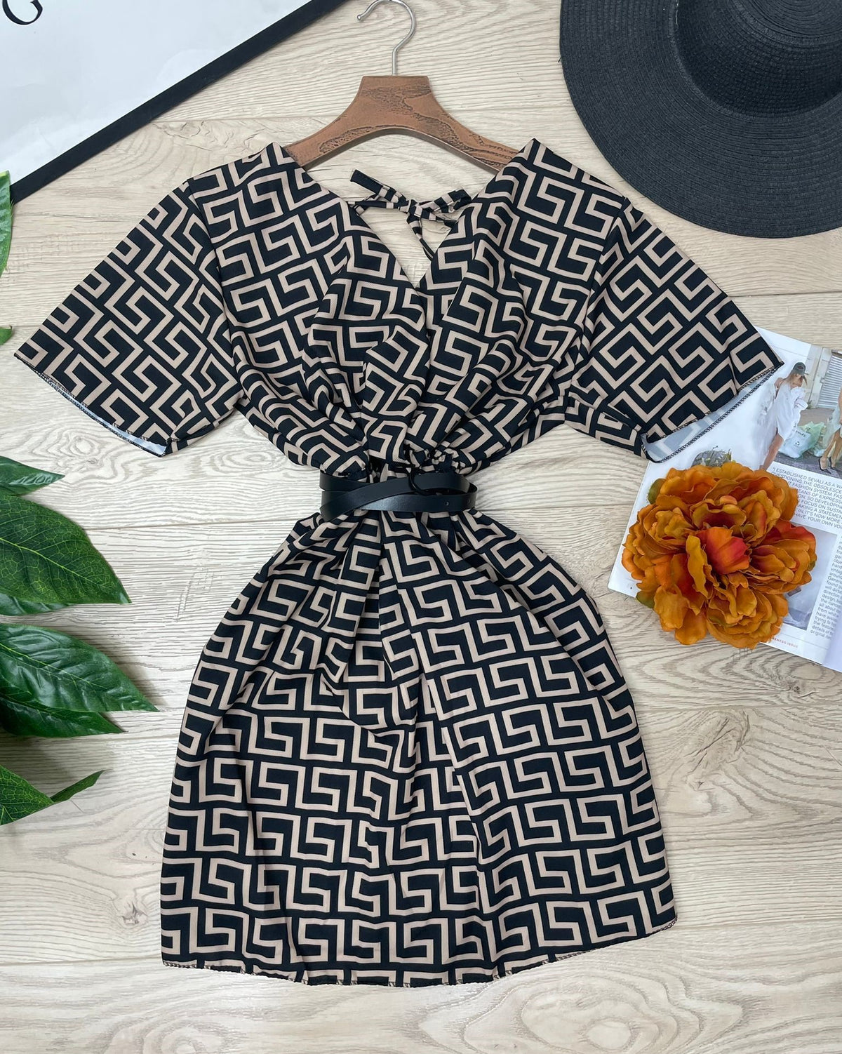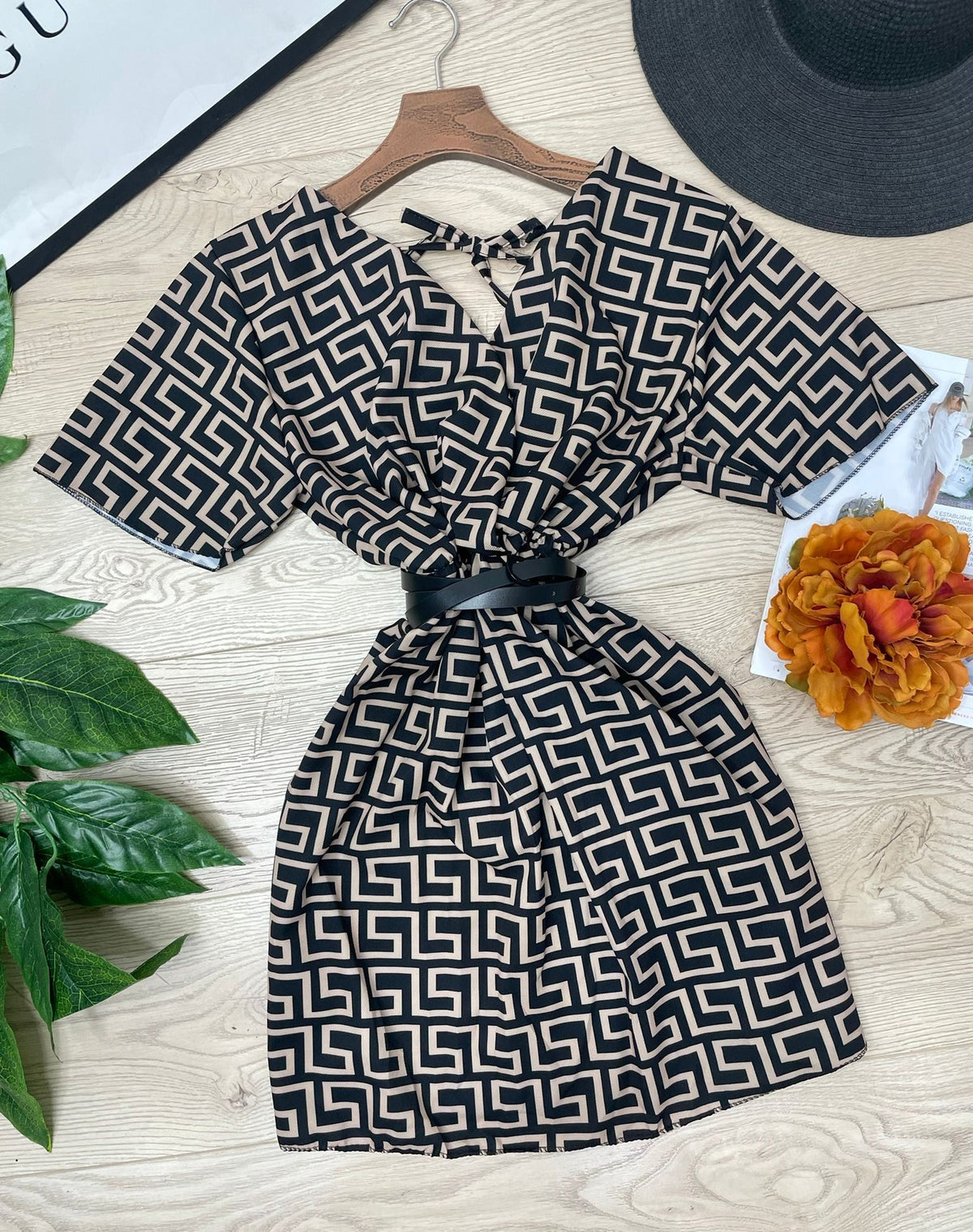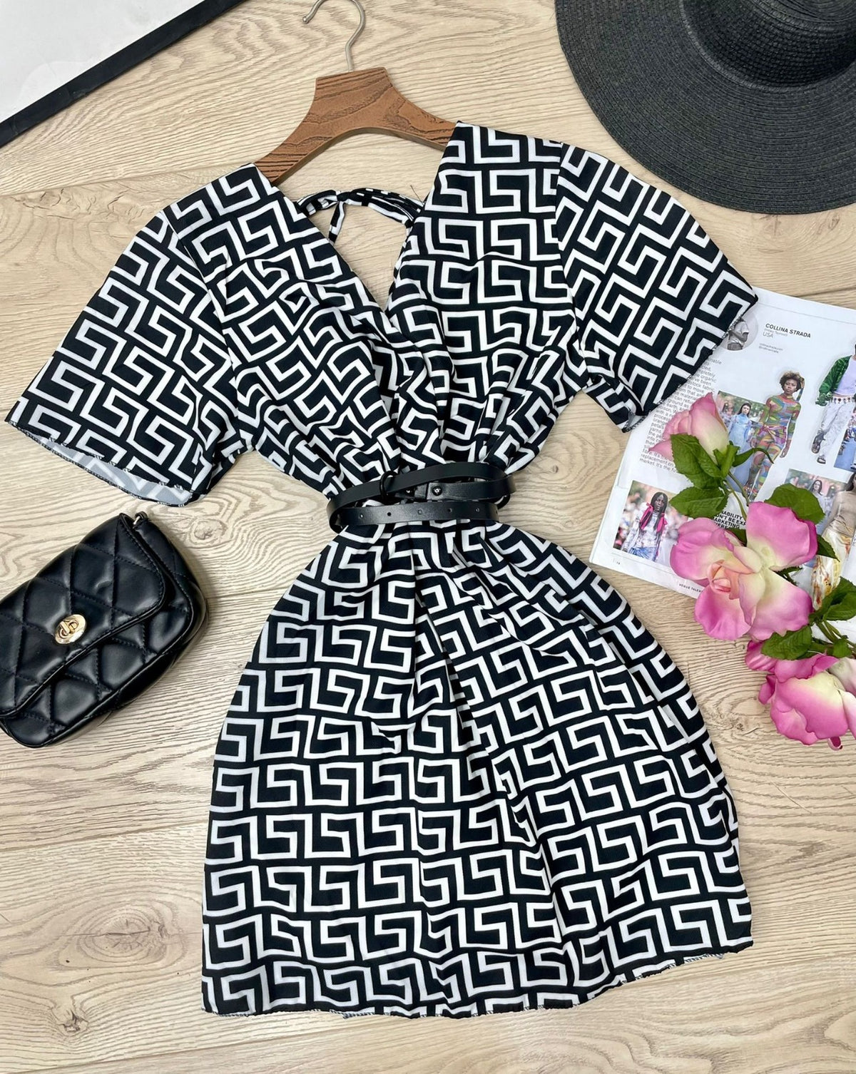 Abito in leggero tessuto strutturato con fantasia astratta, scollatura sul retro con allacciatura ed elastico in vita. Fabbricato in Italia.