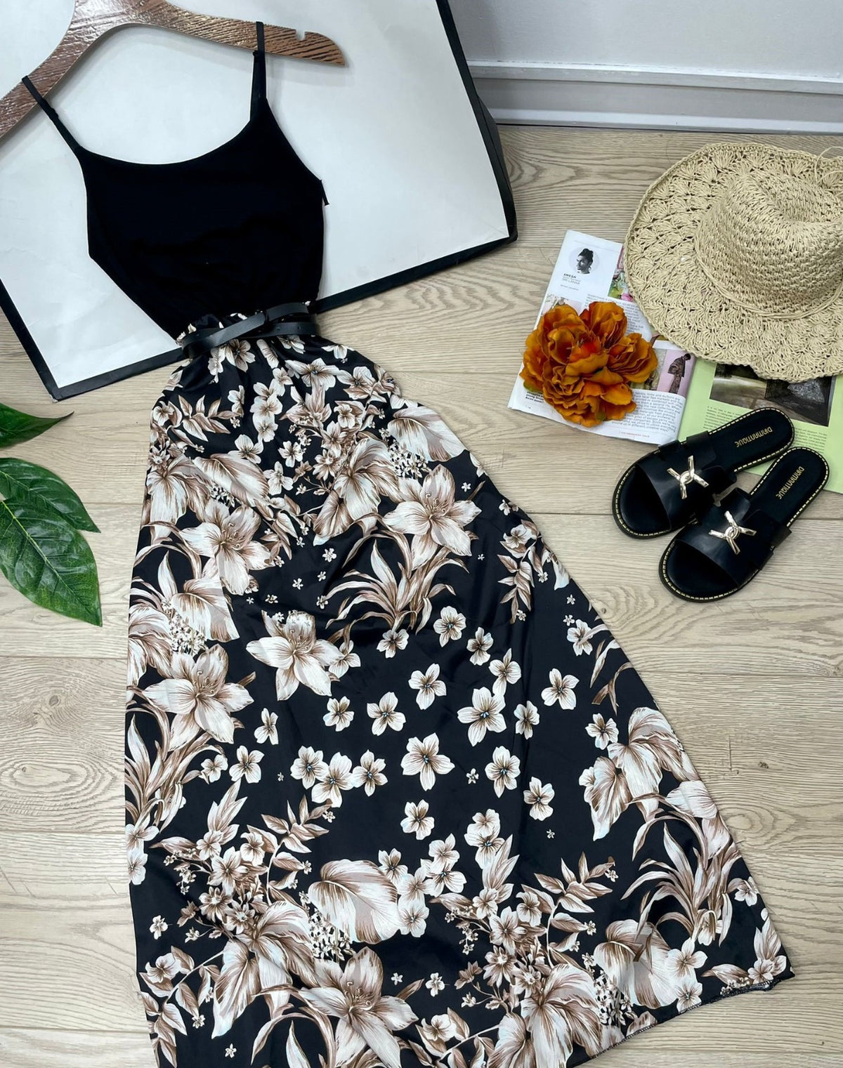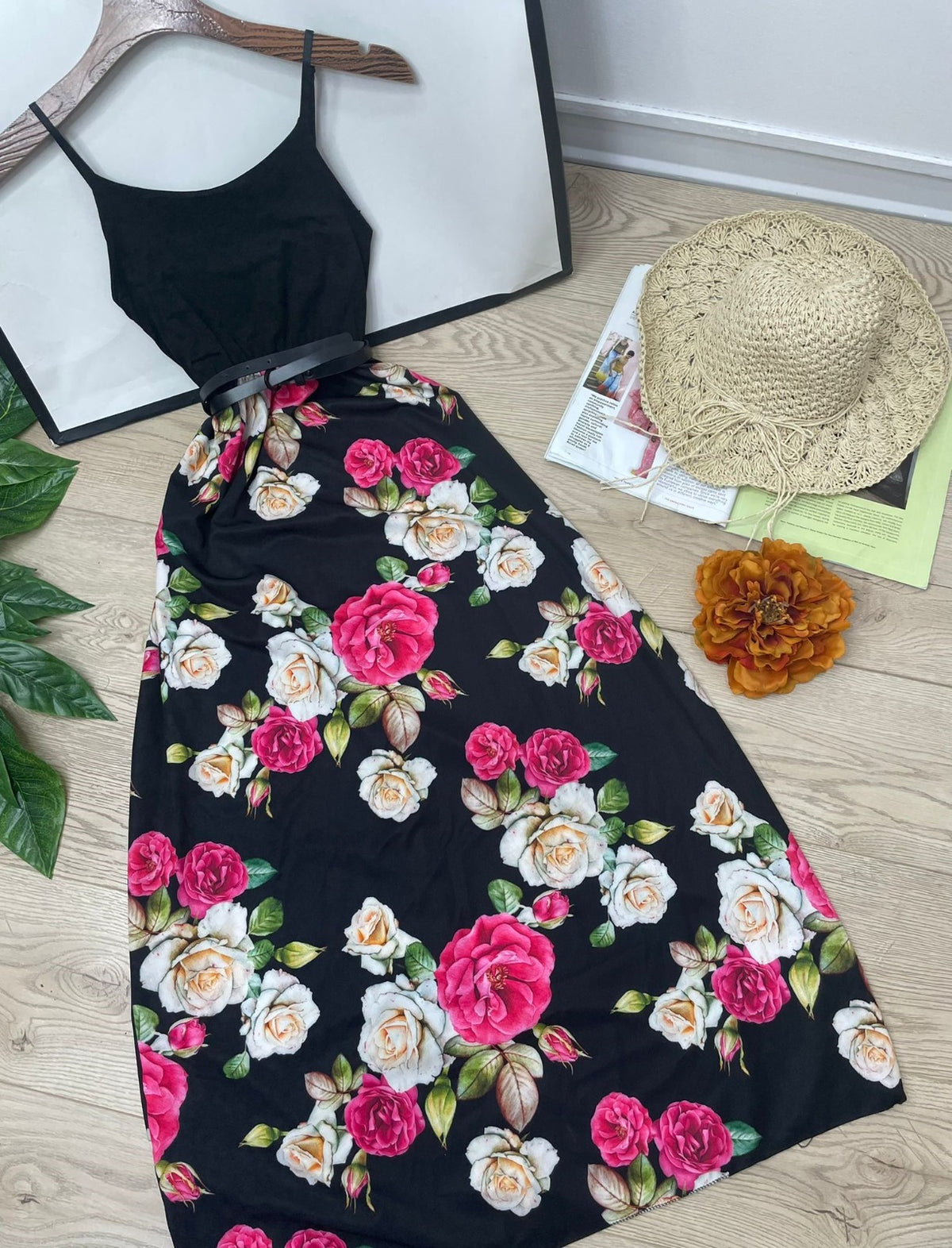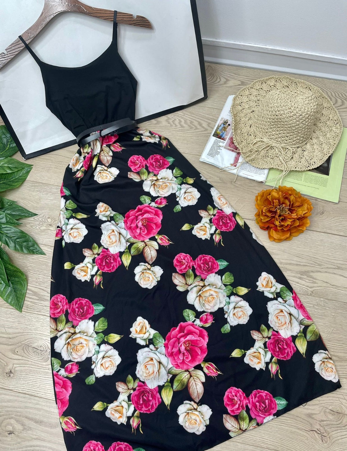 Abito lungo in leggero tessuto strutturato con fantasia floreale o astratta ed elastico in vita. Fabbricato in Italia.