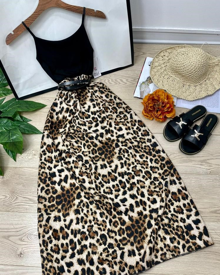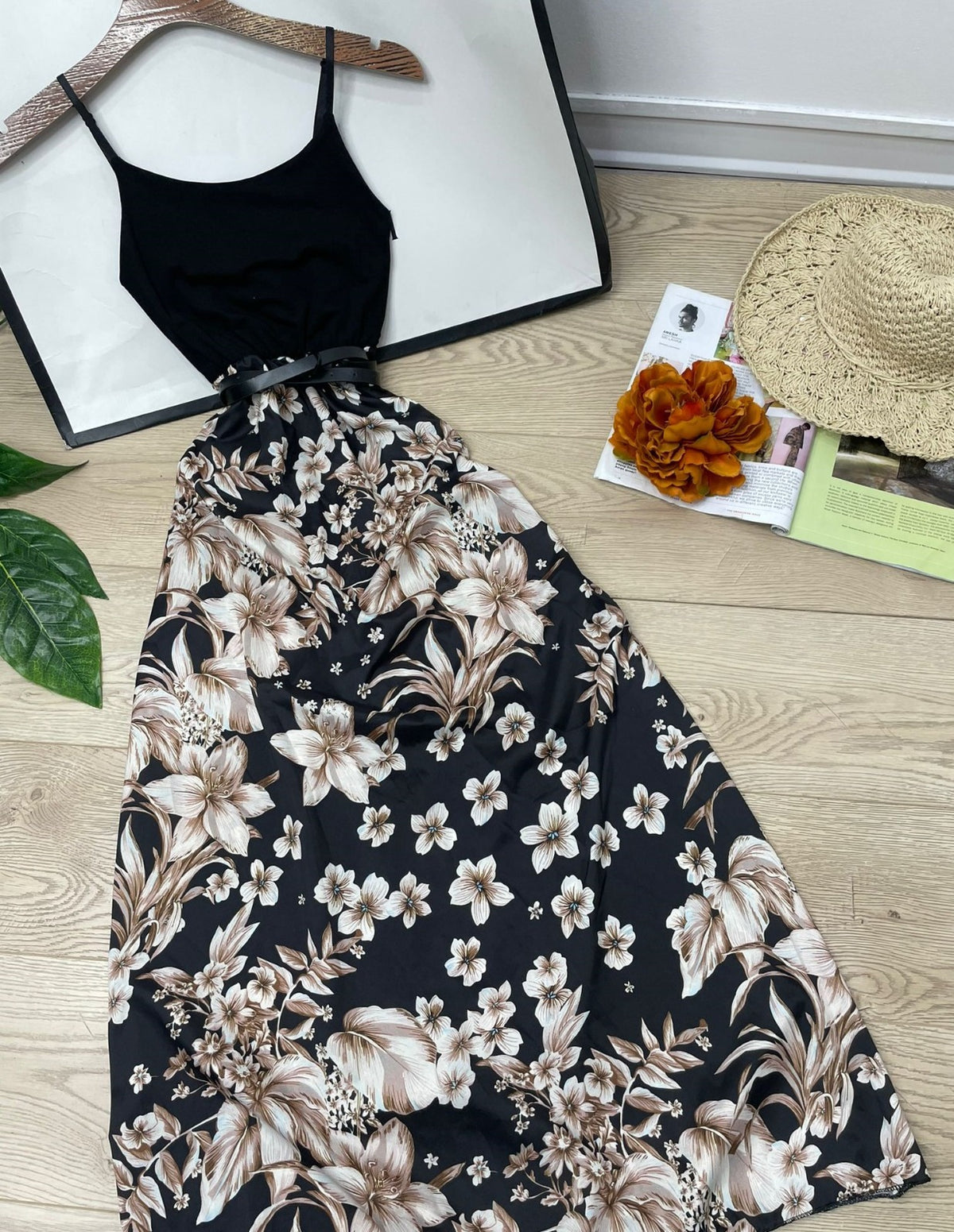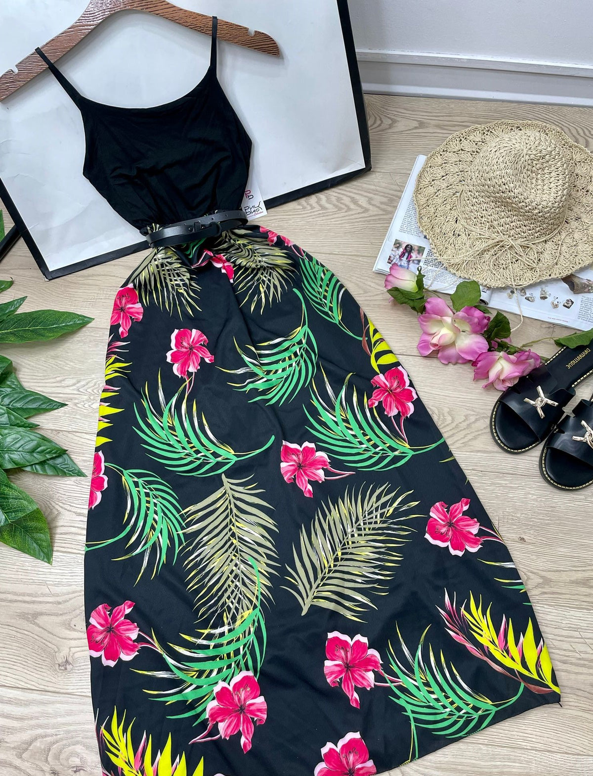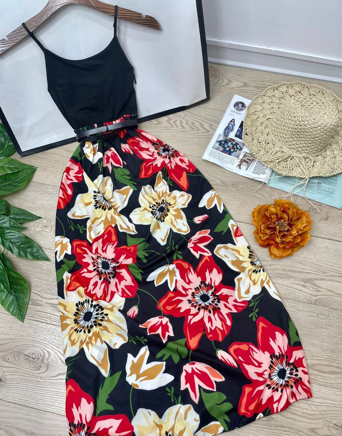 Abito lungo in leggero tessuto strutturato con fantasia floreale o astratta ed elastico in vita. Fabbricato in Italia.