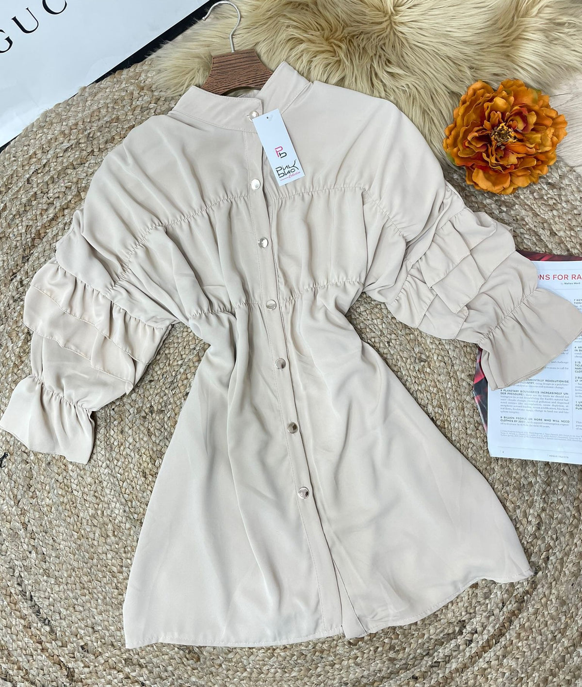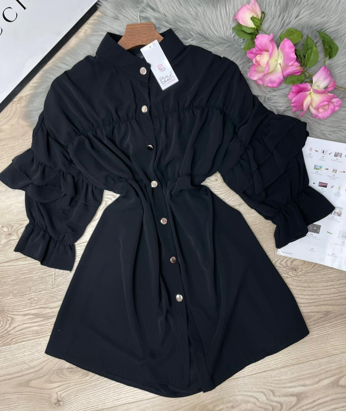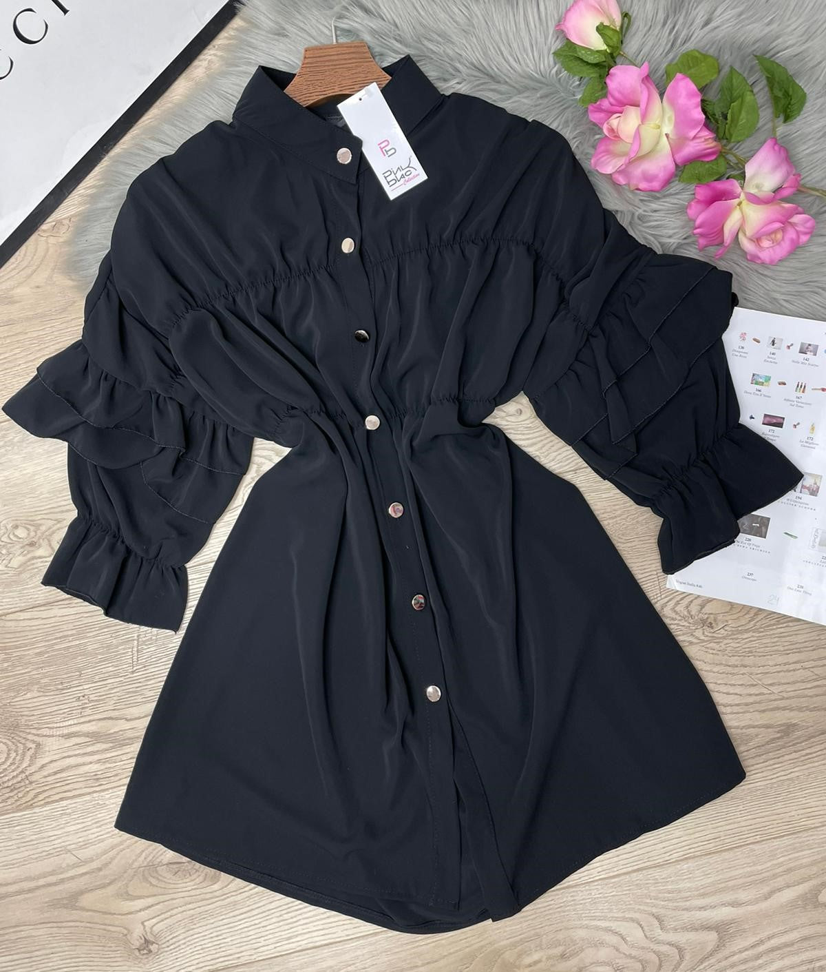 Abito in leggero tessuto strutturato, tinta unita. Effetto camicione dal taglio semplice e lento, collo alla coreana con bottoni centrali e manica tre quarti con volant. Glamour, si adatta ad una varietà di occasioni, per un look versatile e curato e una vestibilità ottimale e alla moda. Fabbricato in Italia.
