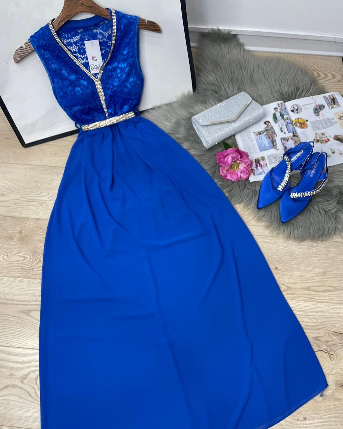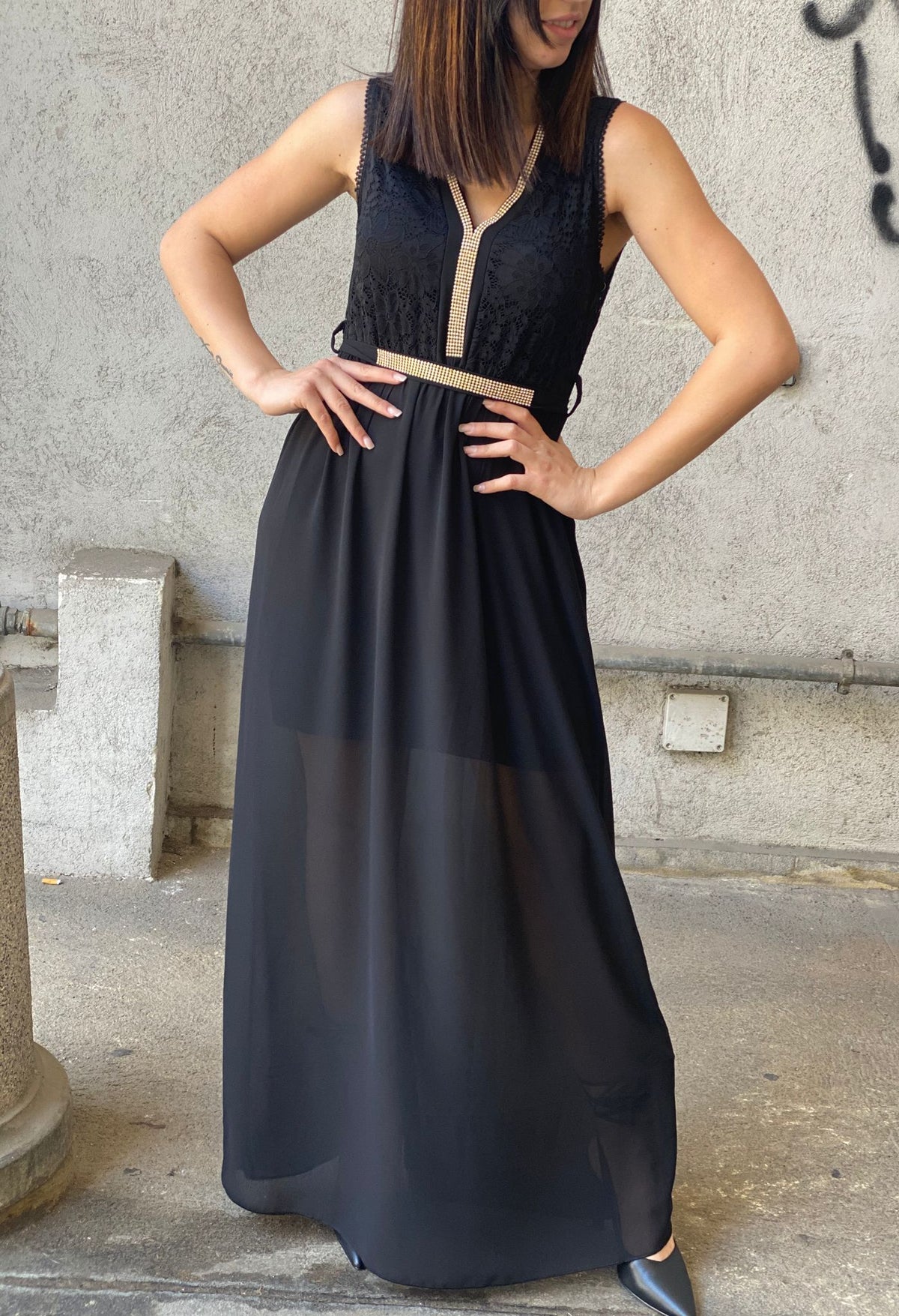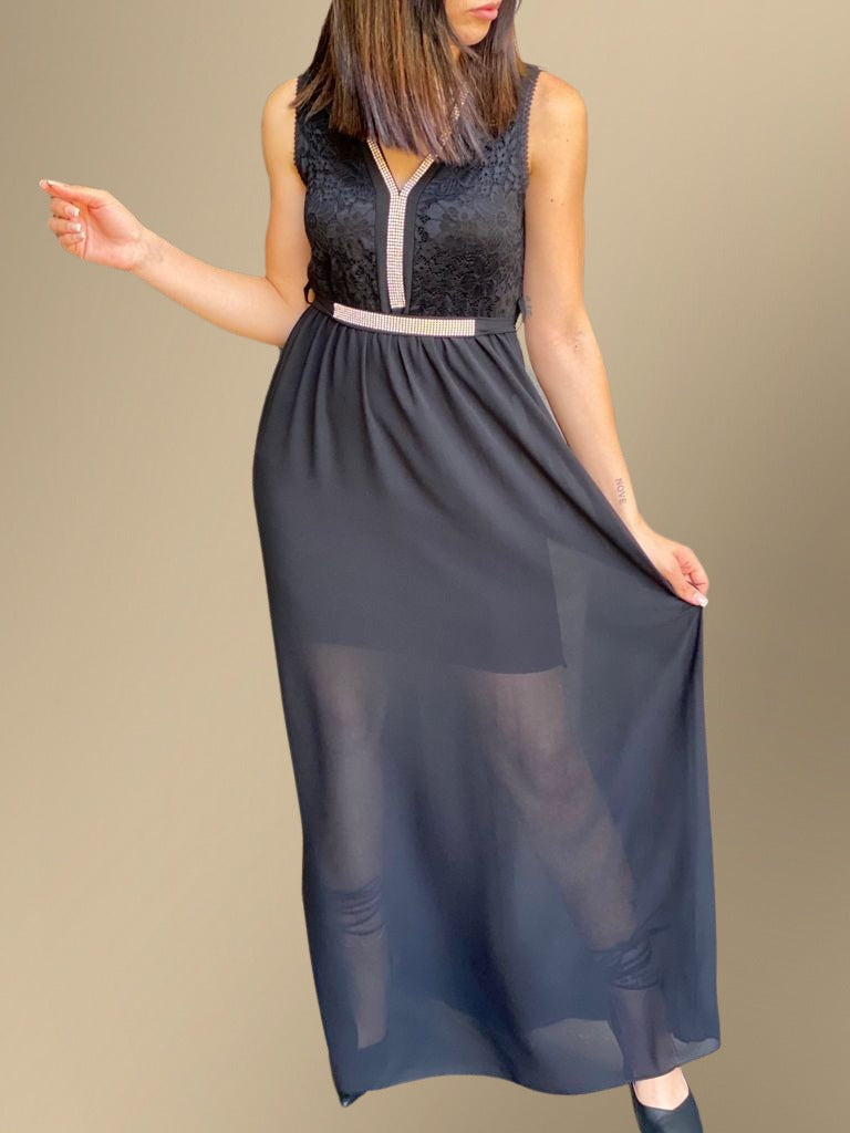 Abito lungo in pizzo e chiffon con elastico in vita ed effetto cintura con allacciatura a fiocco sul retro. Fabbricato in Italia.