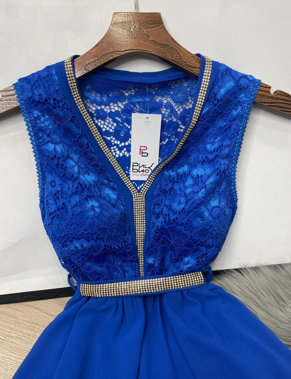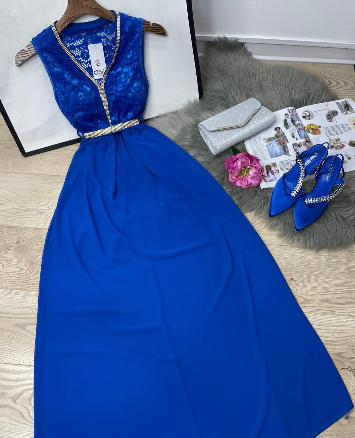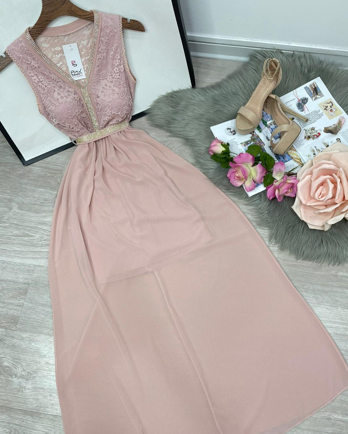 Abito lungo in pizzo e chiffon con elastico in vita ed effetto cintura con allacciatura a fiocco sul retro. Fabbricato in Italia.