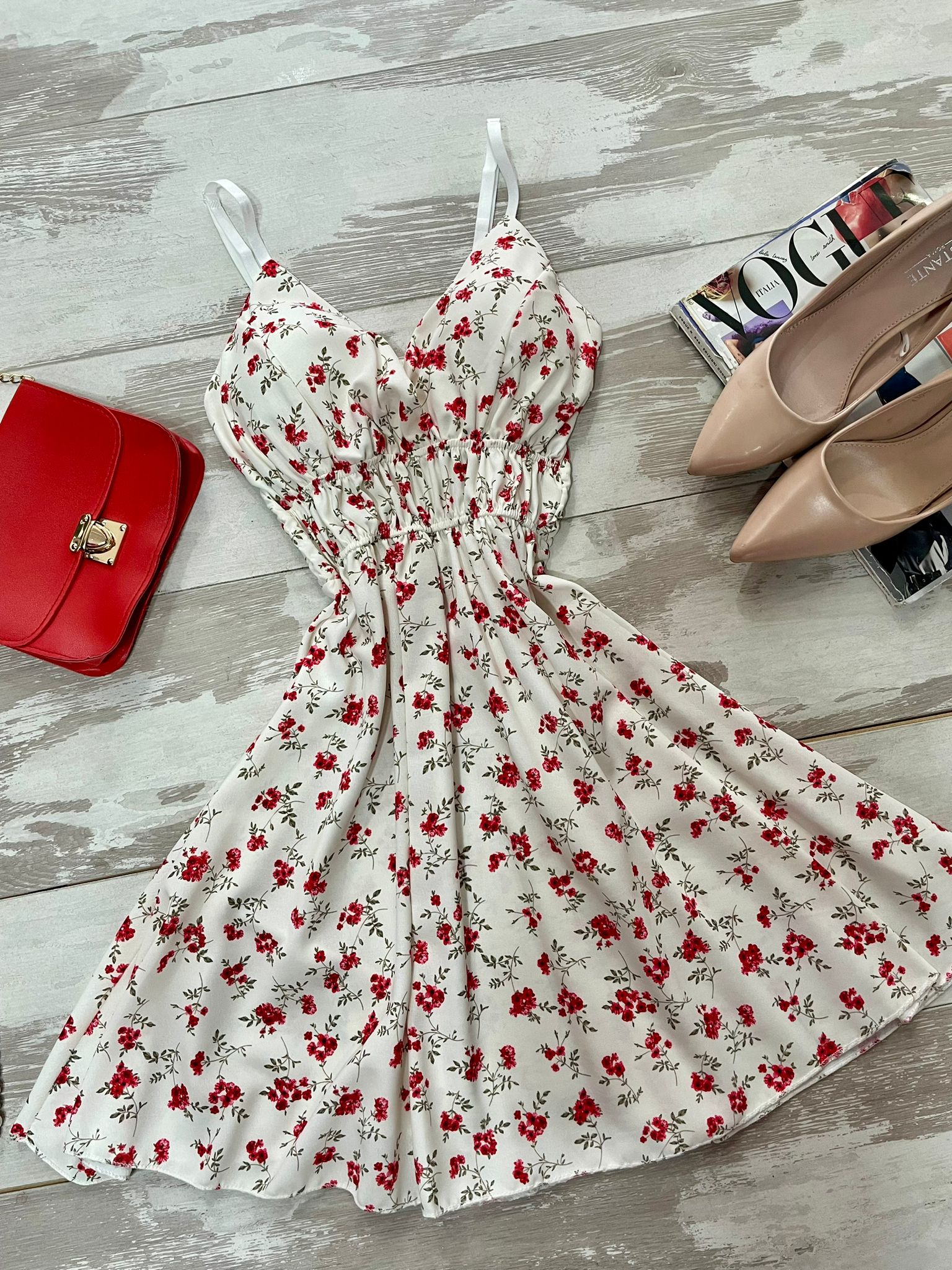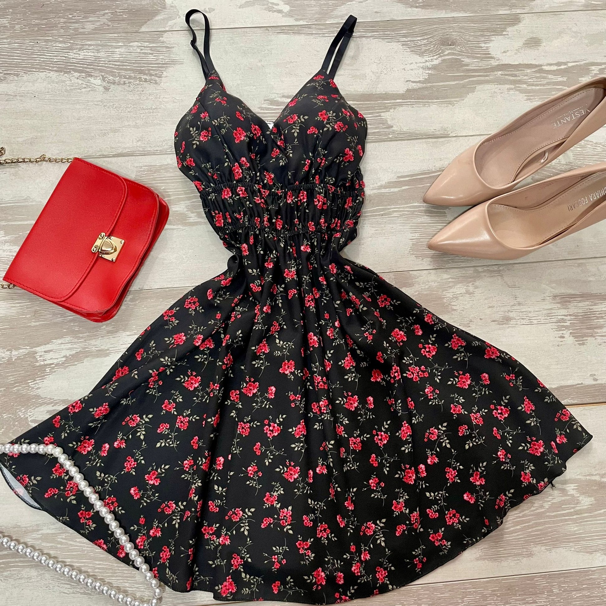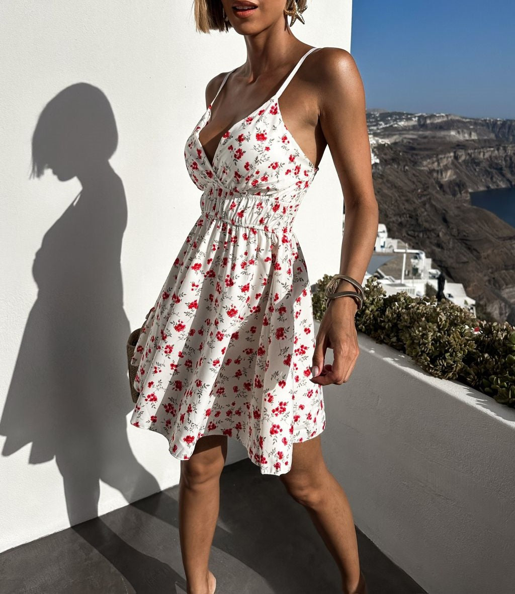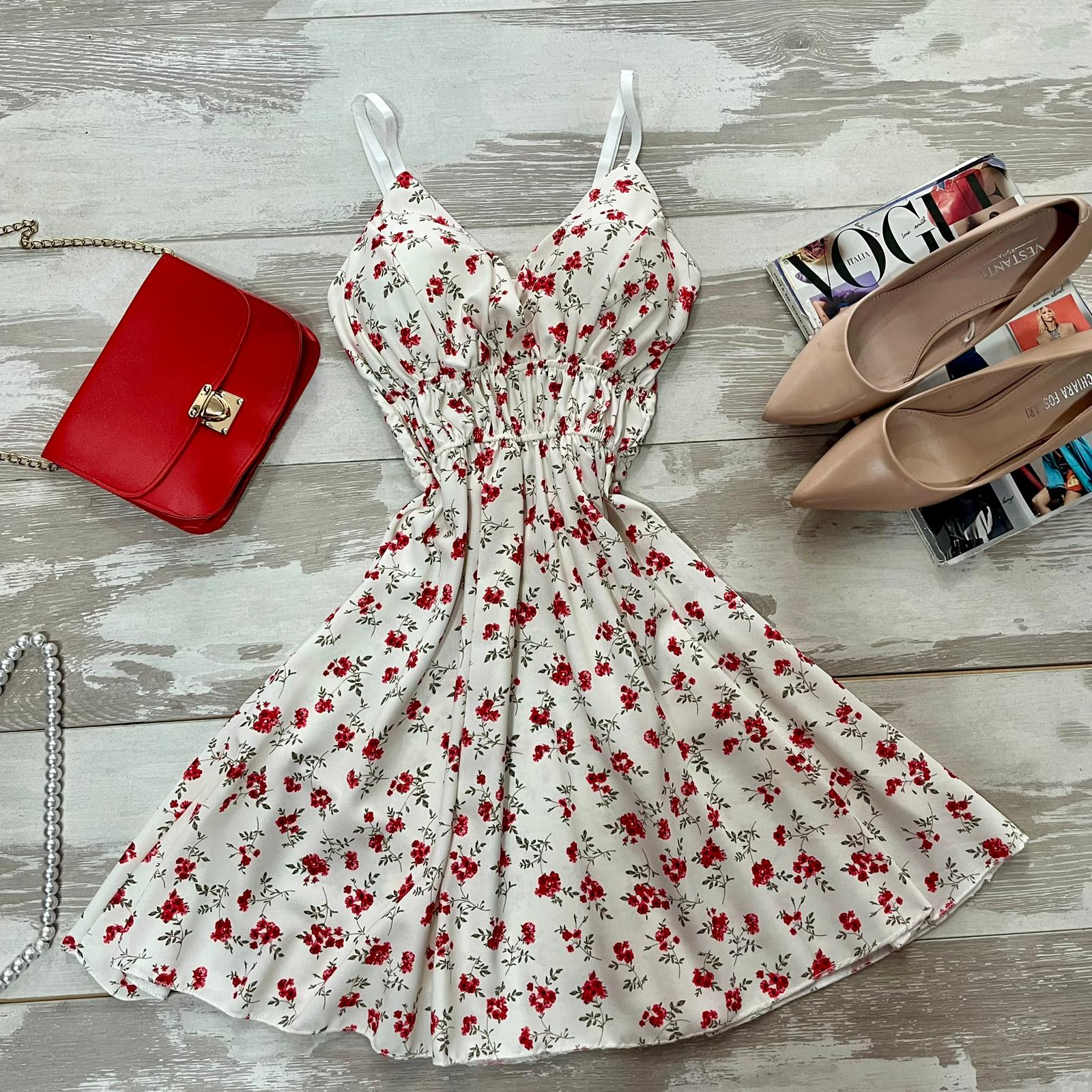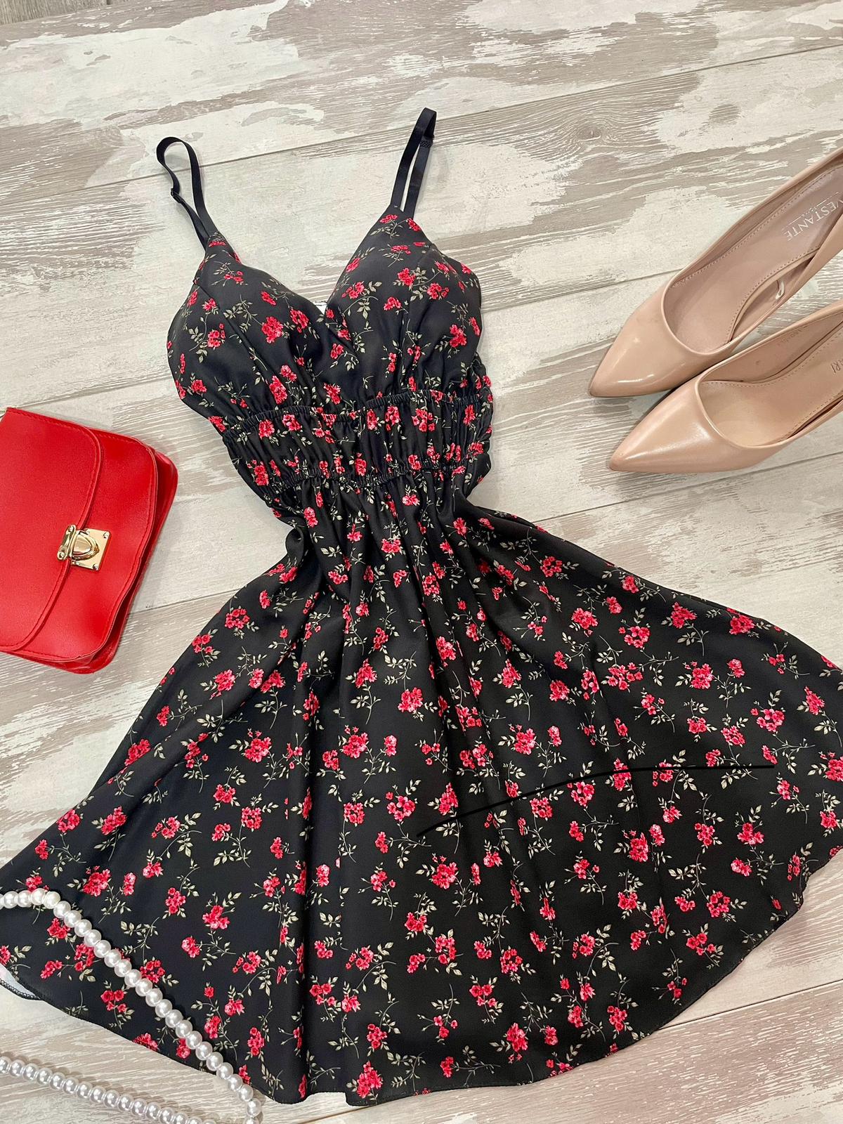 Abito in leggero tessuto strutturato con fantasia floreale, coppe preformate ed elastico sul retro. Fabbricato in Italia.