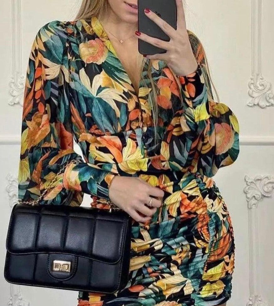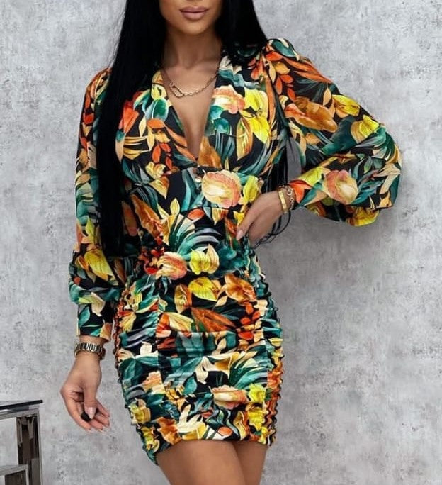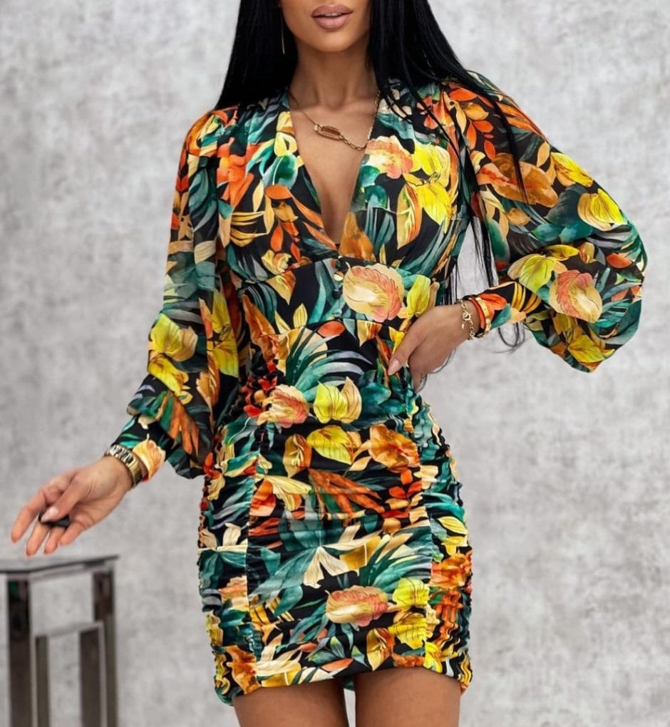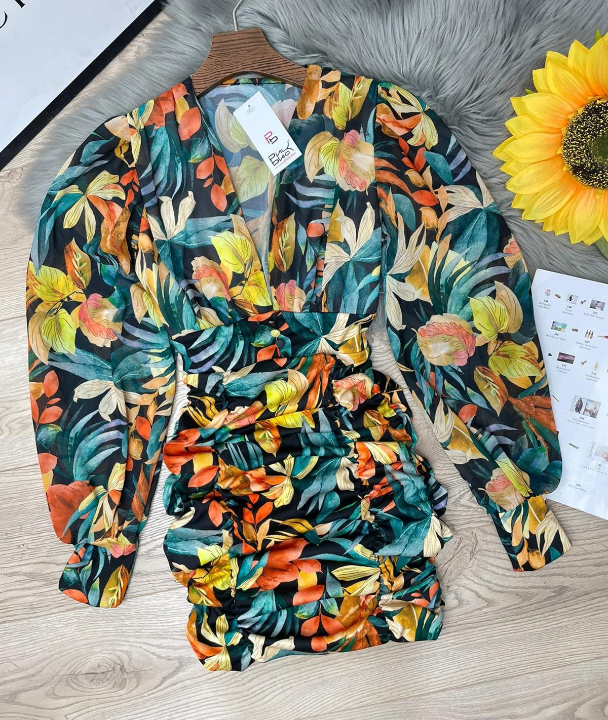 Abito in chiffon con fantasia floreale. Scollo a V, manica lunga, bottoncini in vita e gonna drappeggiata. Glamour, dai colori vivaci, si adatta ad una varietà di occasioni, per un look versatile e curato e una vestibilità ottimale e alla moda. Fabbricato in Italia.
