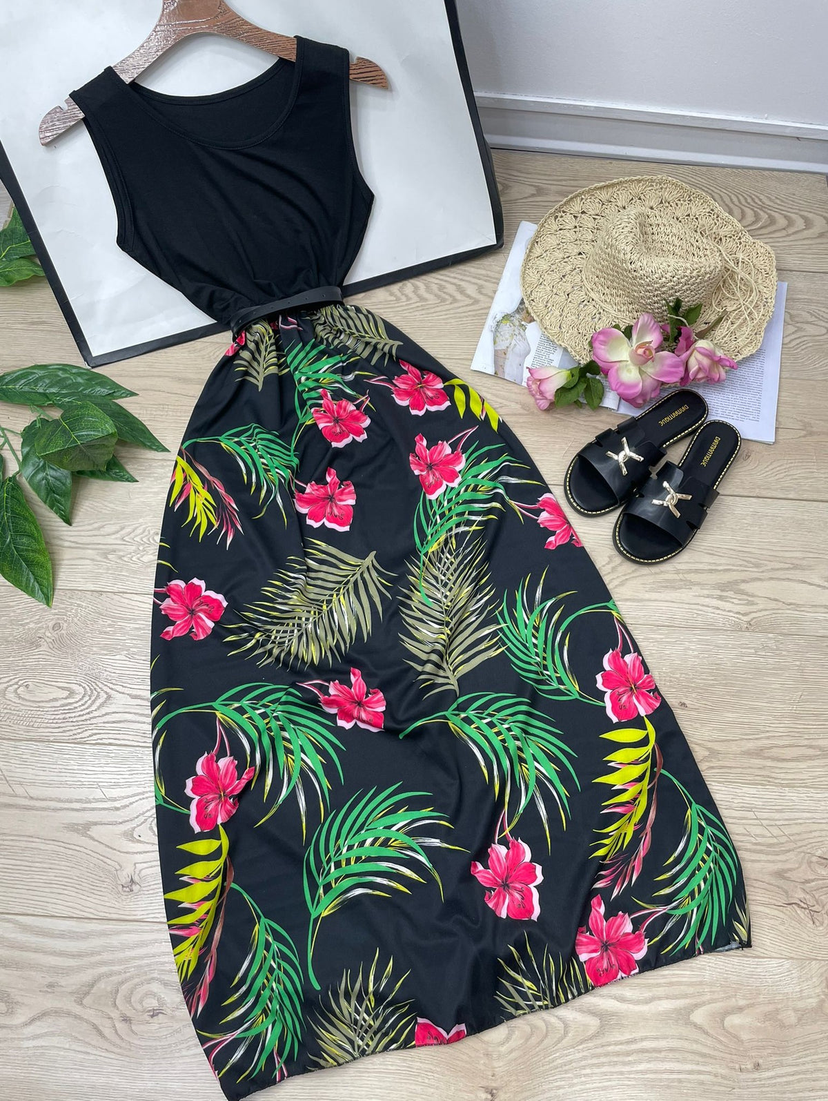 Abito lungo in leggero tessuto strutturato con fantasia floreale o astratta ed elastico in vita. Fabbricato in Italia.