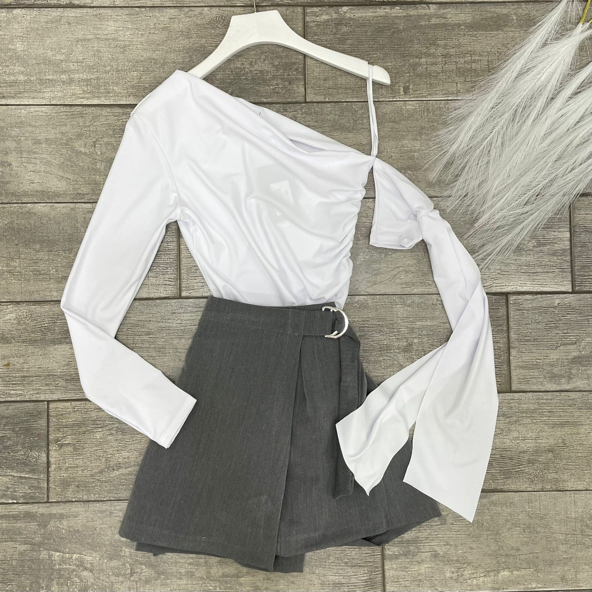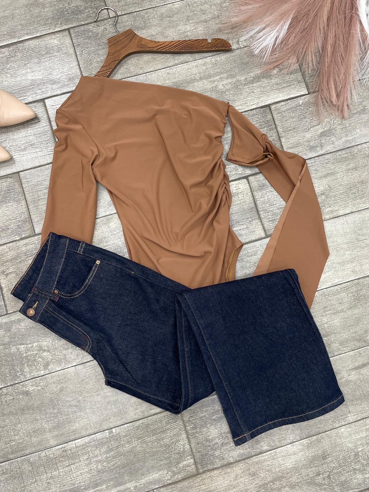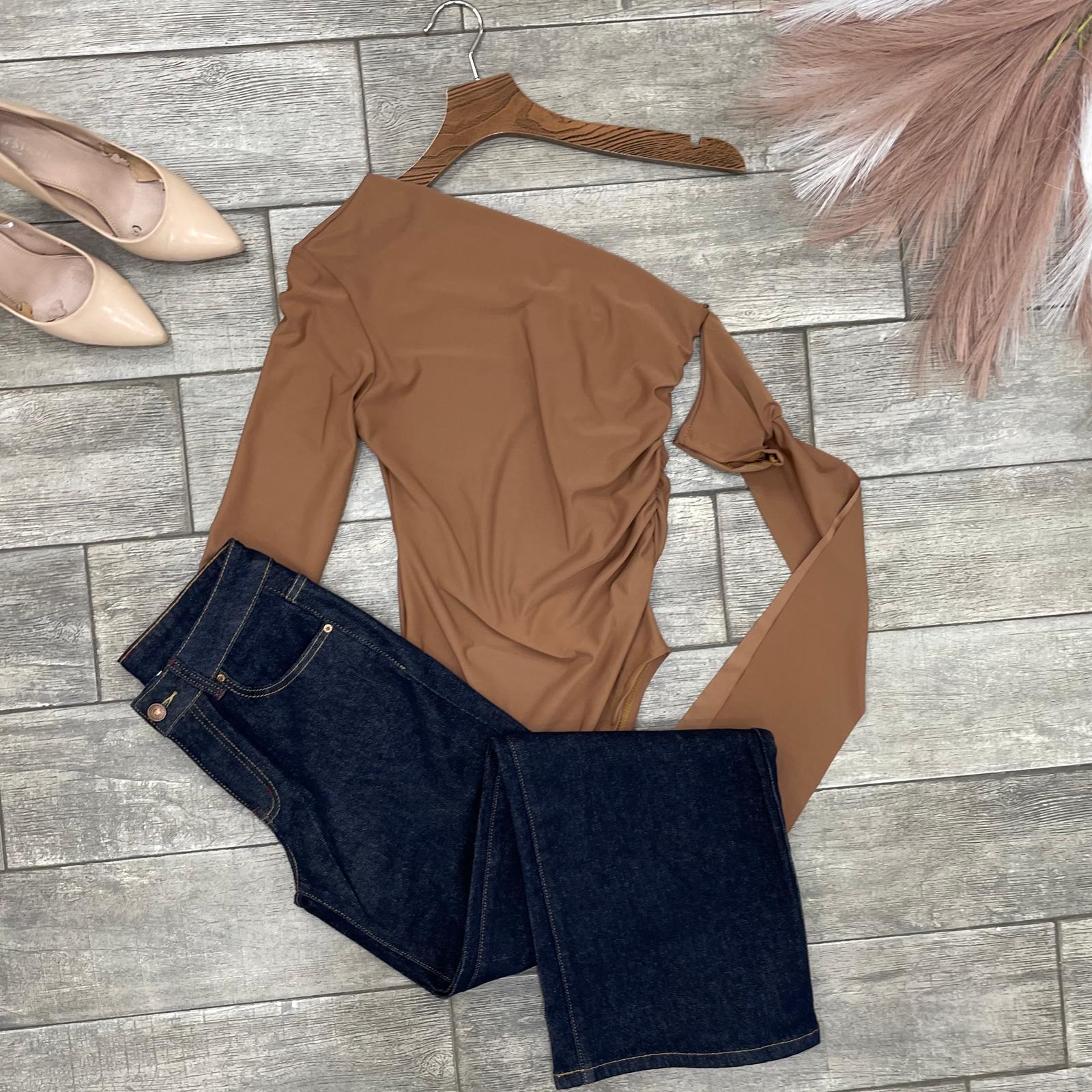 Body effetto lycra con scollatura asimmetrica , manica sinistra aperta e scivolata  e chiusura con   ganci sul cavallo