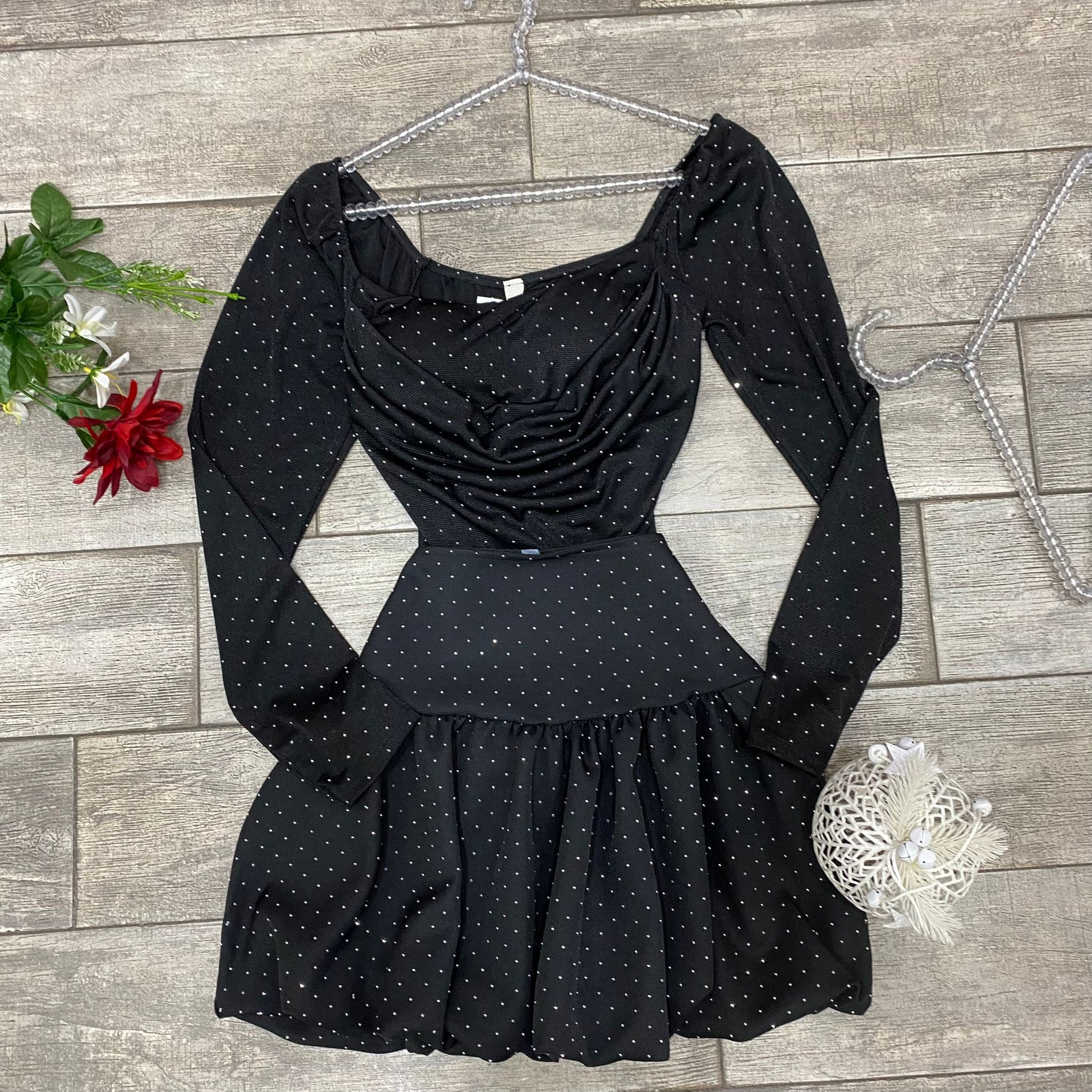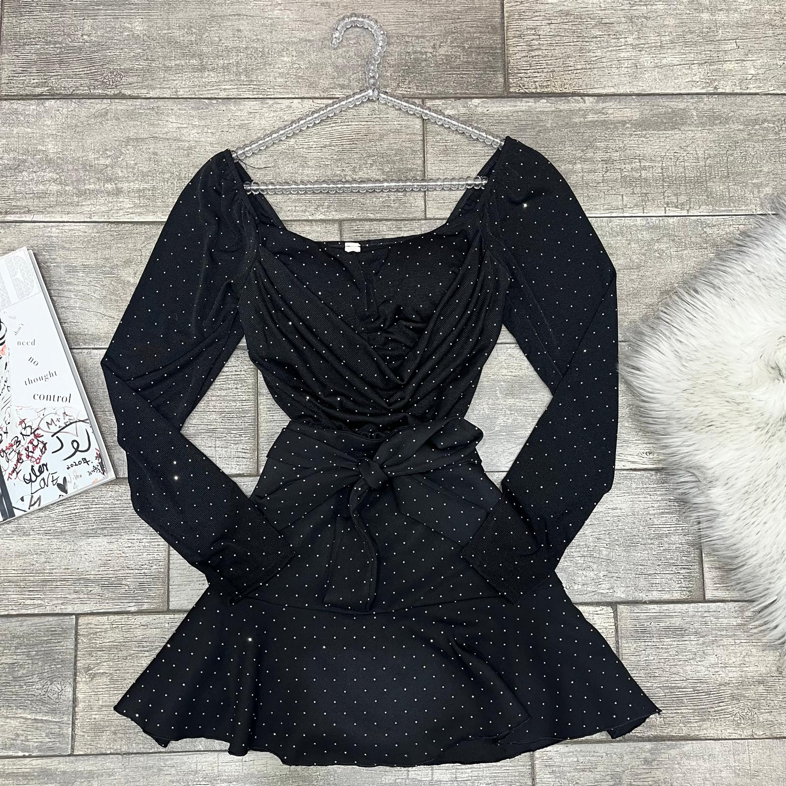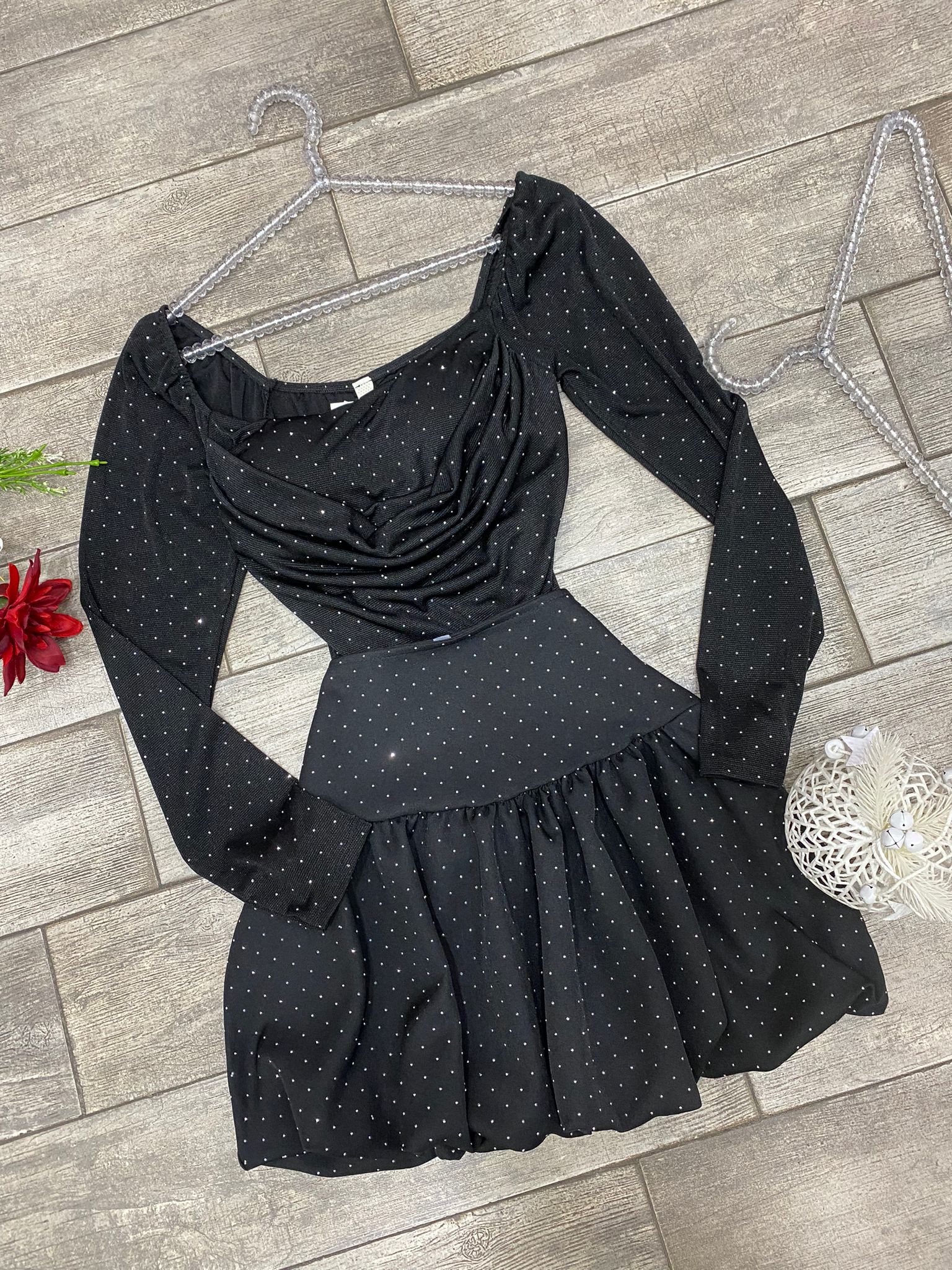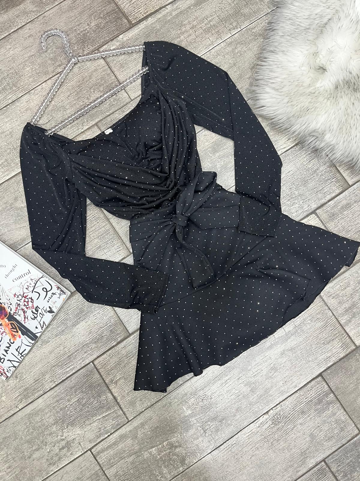 Body manica lunga con scollatura a cappuccio, chiusura con ganci sul cavallo e applicazioni in rilievo color argento.