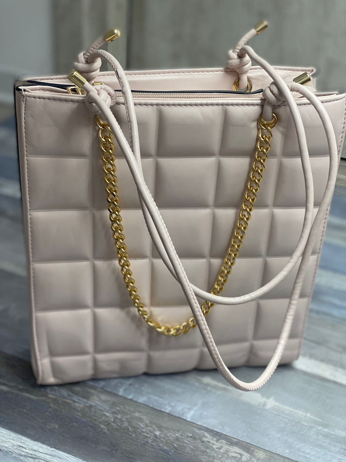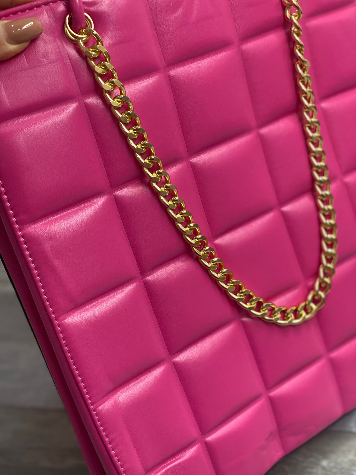 Borsa a secchiello in ecopelle con struttura rigida e tracolla.